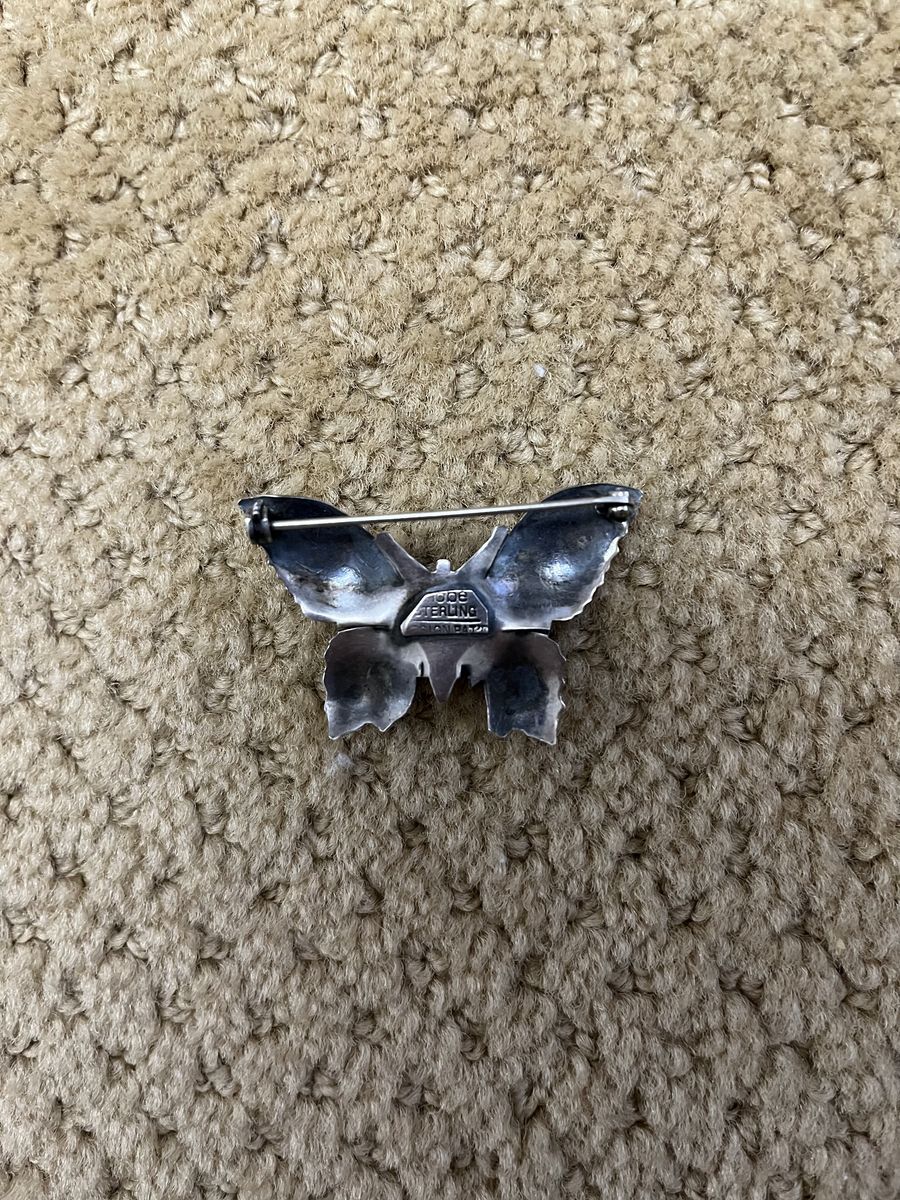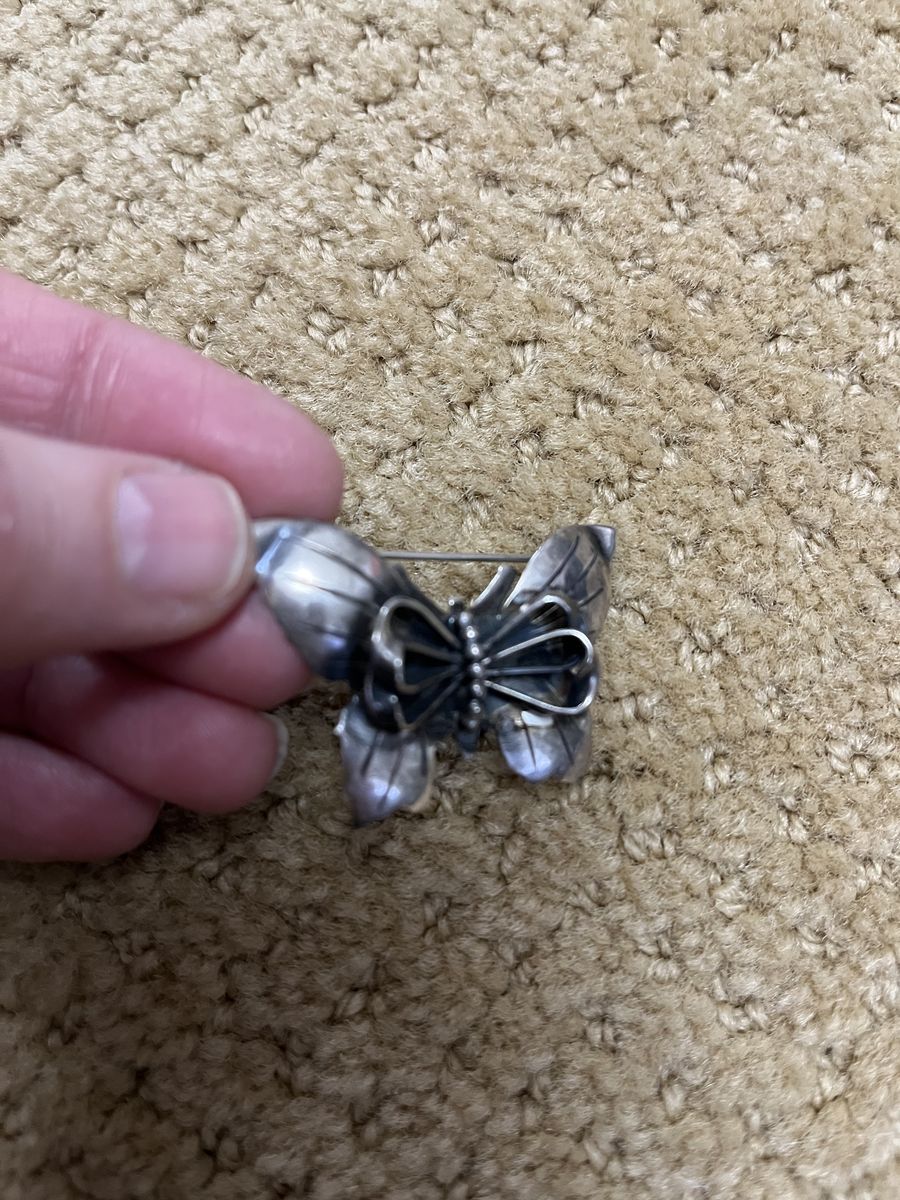 VenmoIf you love butterflies, this is for you! This butterfly pin has a lovely 3-D design along with beautiful detail. This belonged to my great aunt who has long ago passed. It is from the 1960’s – 1970’s. It is marked “Hobe Sterling Design Patt”. It measures 1 ¾” wide x 1 ¼ inches tall. This has the nice natural patina that has developed over time. Which helps to show and authenticate that is a true vintage piece. This patina also brings out the details in the butterfly. I have not tried to clean it. I took it to my local jewelers and they weighed it. It weighs 7.15 grams or .25 troy ounces. It is great/excellent condition. Price is firm.