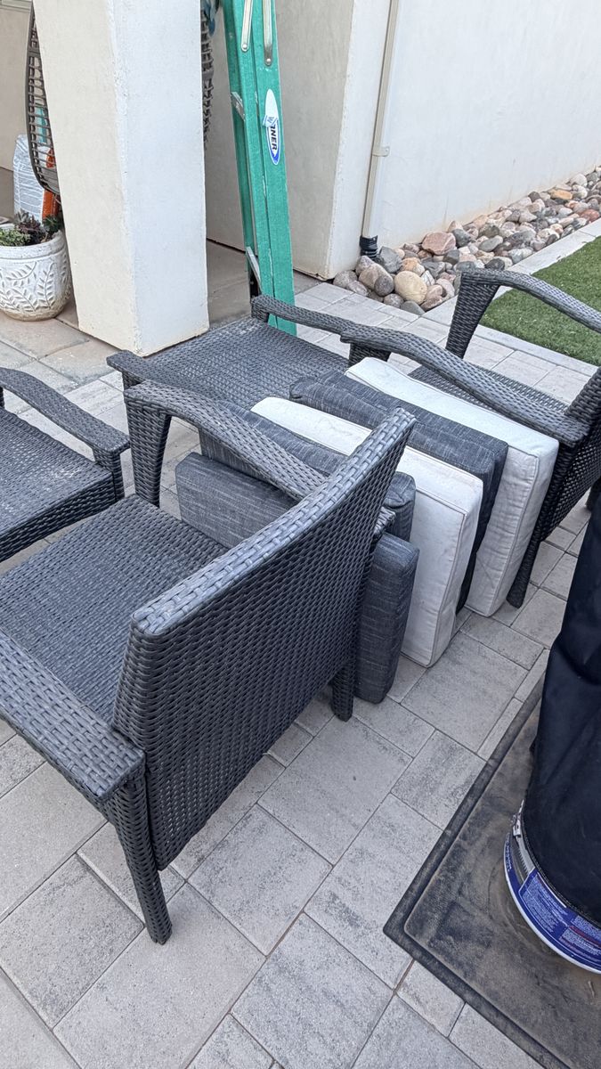 VenmoTwo chairs and footstools. Comes with cushions that might be usable if they clean up well enough. Chairs are well made, sturdy, and in good condition.