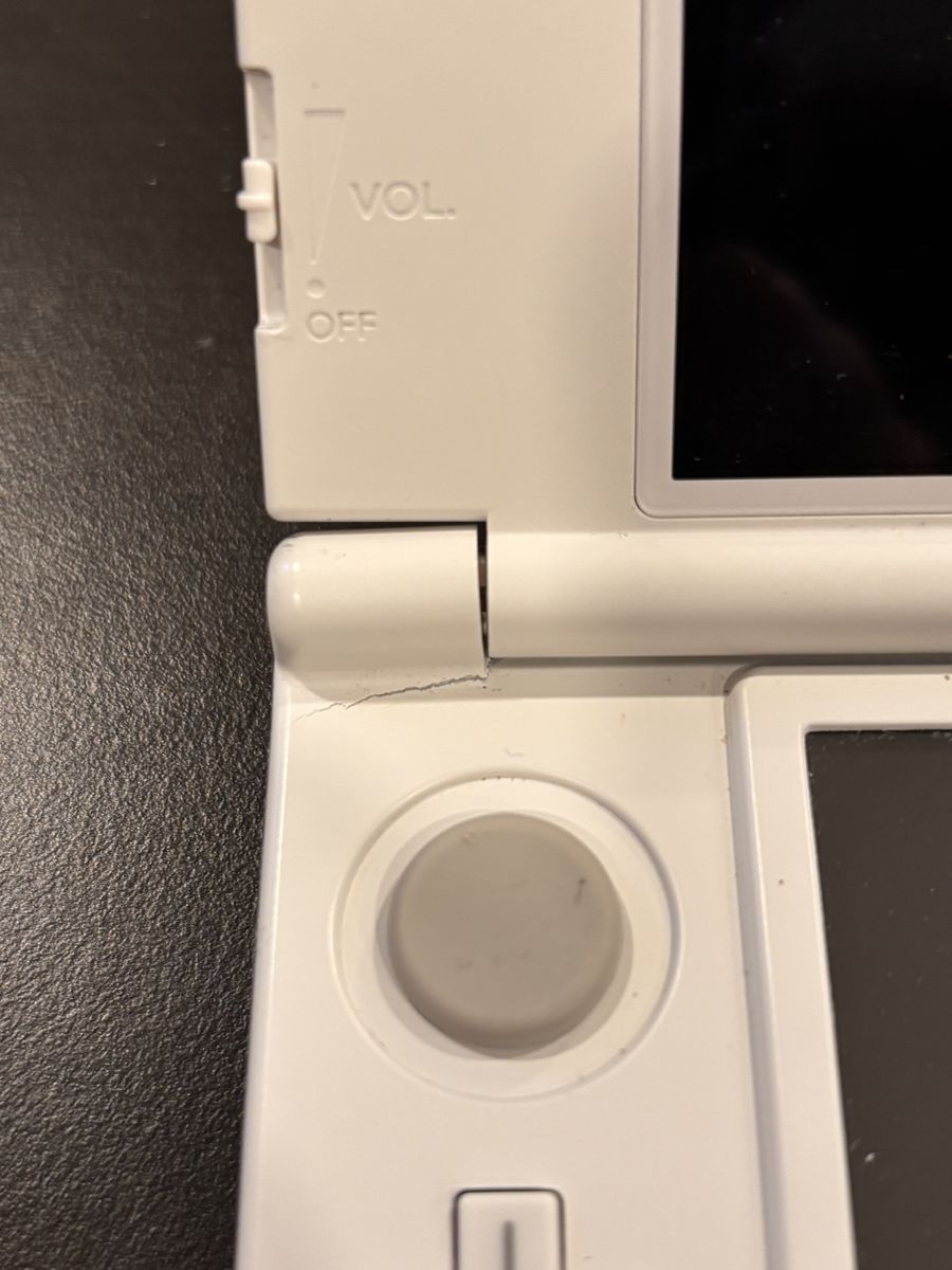 There is a thin crack by the left hinge (see photos). I am basing my asking price off of what GameStop charges (about $380) and subtracting $100 per the crack.