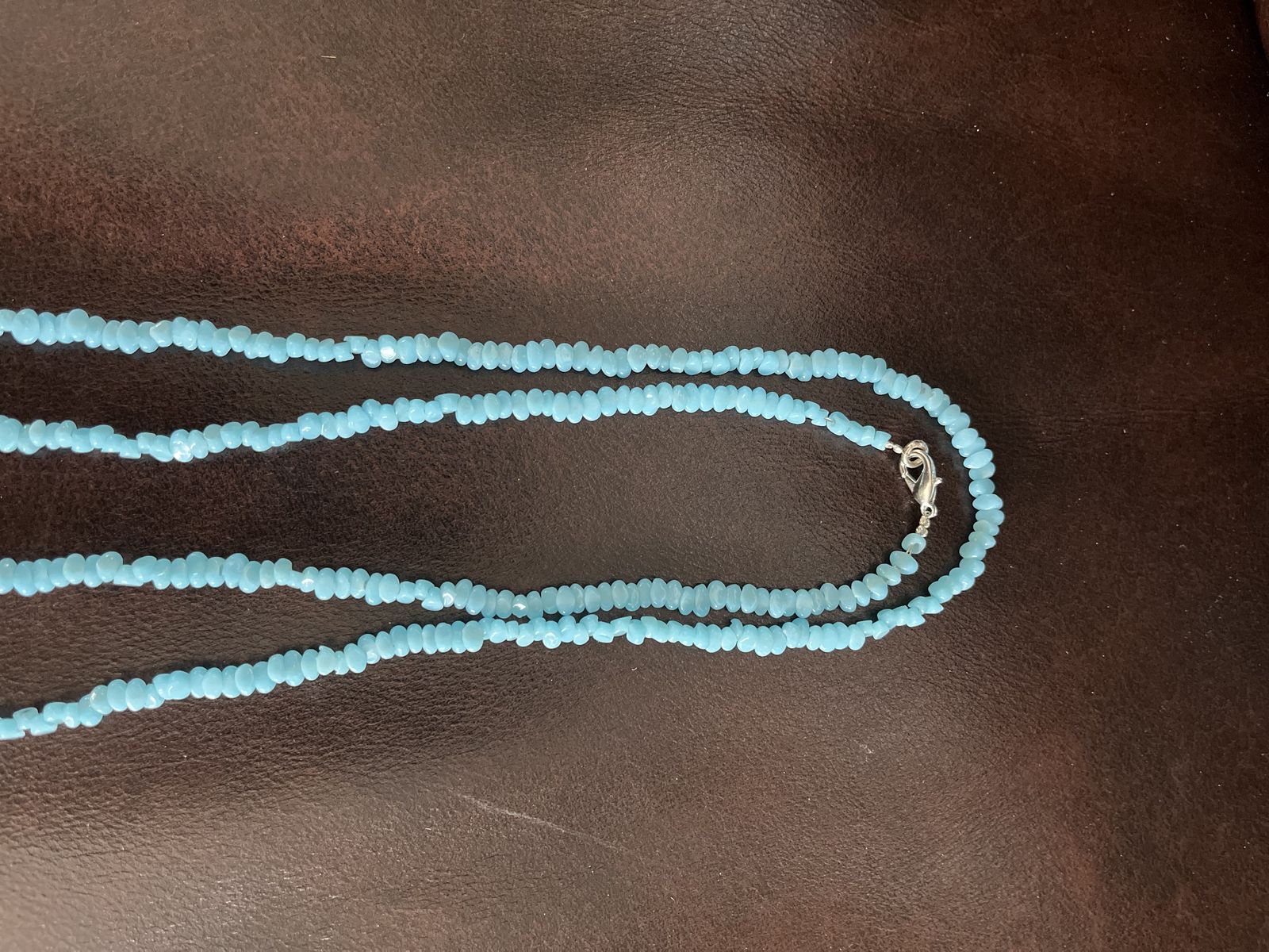 VenmoThis is a long necklace. It is 47 inches end to end. The turuqoise beads are like rounded pebbles. All different shapes but all similar when put together. The necklace is from the 1920's to the 1930's. The original clasp had rusted, so I had this restrung. It is excellent condition. Price is firm.