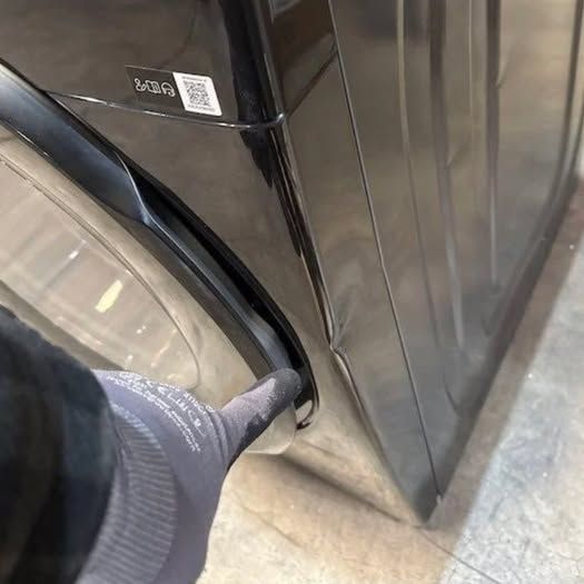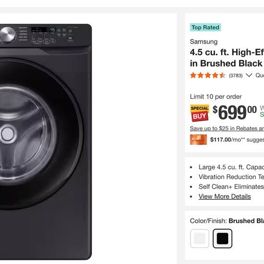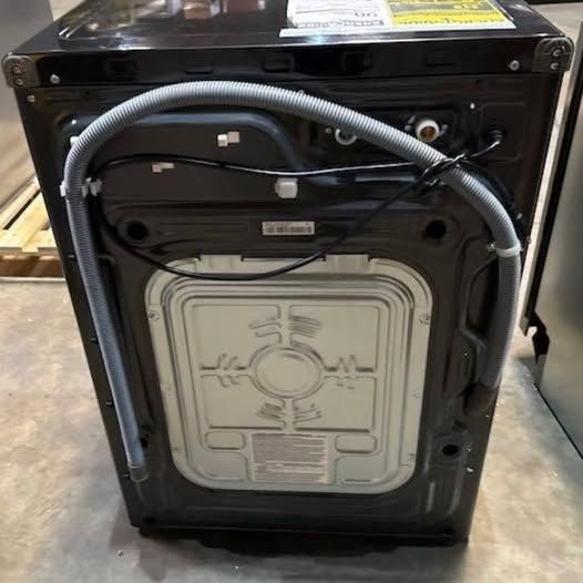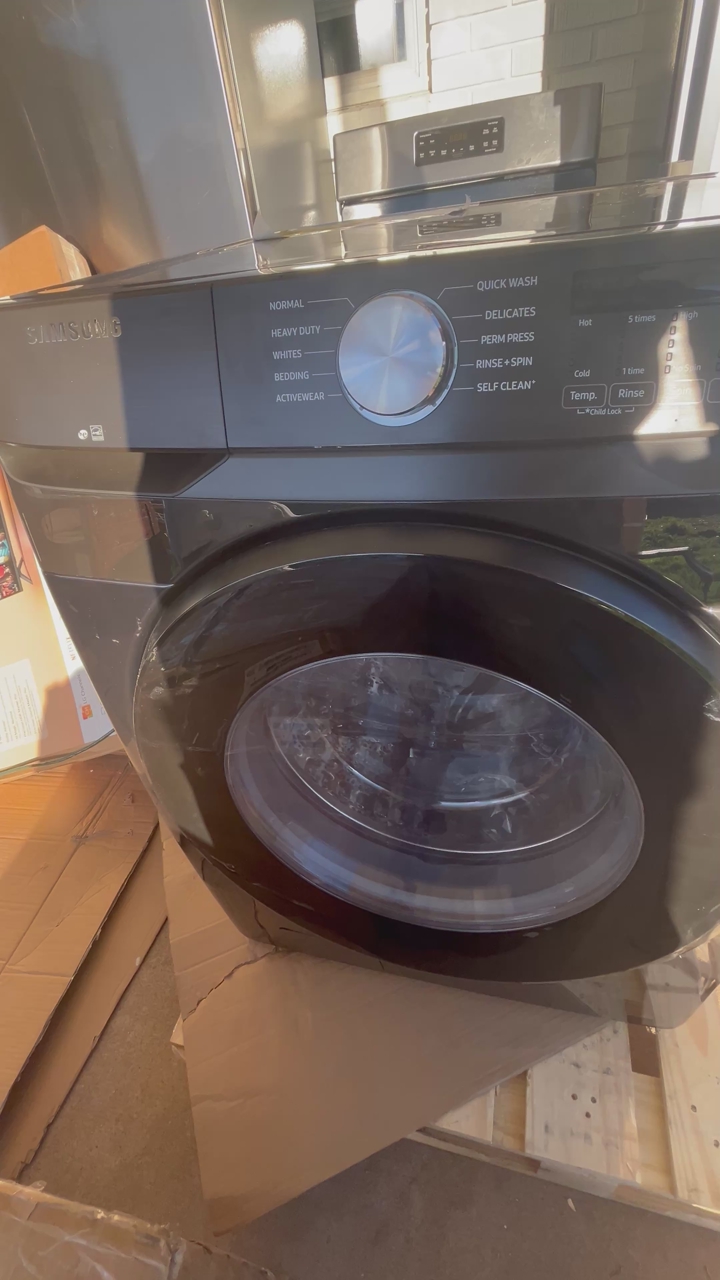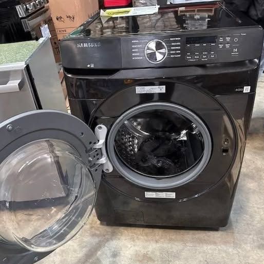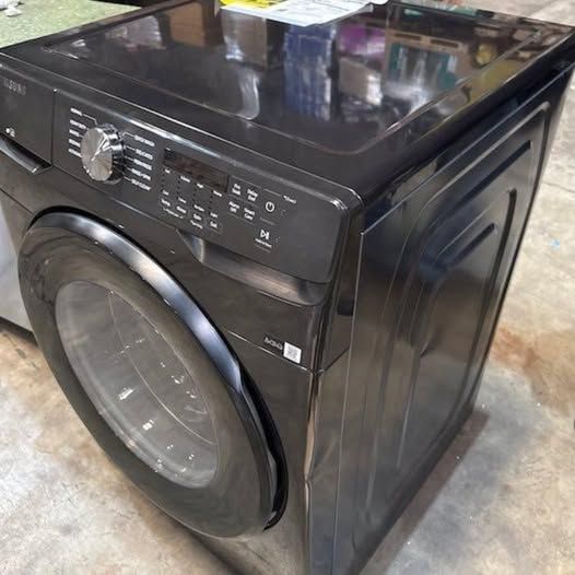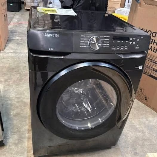 a small cosmetic dent showed in picture only cosmetic Brand: Samsung Model: WF45T6000AV 887276436548 Samsung; Front Load Washer 4.5 cu ft capacity; ENERGY STAR certified for energy efficiency; Vibration Reduction Technology+ for quieter operation; Self Clean+ removes 99% of bacteria from drum; Brushed Black finish with glass round door and front controls; Stainless steel drum with 1200 RPM max spin speed; 10 wash cycles and multiple rinse and temperature options; Stackable design with adjustable legs and control lock; Dimensions 27W x 31.34D x 38.75H