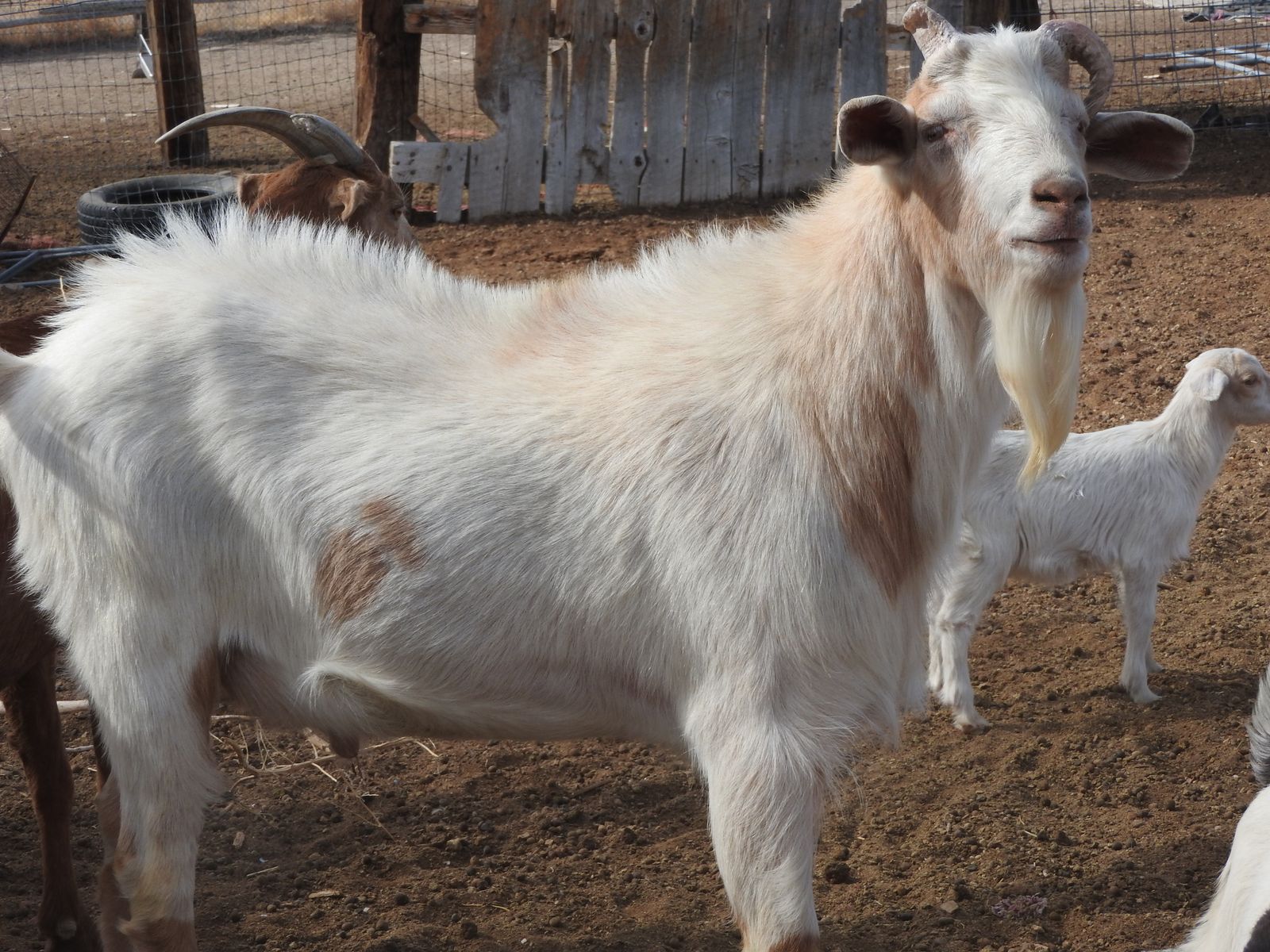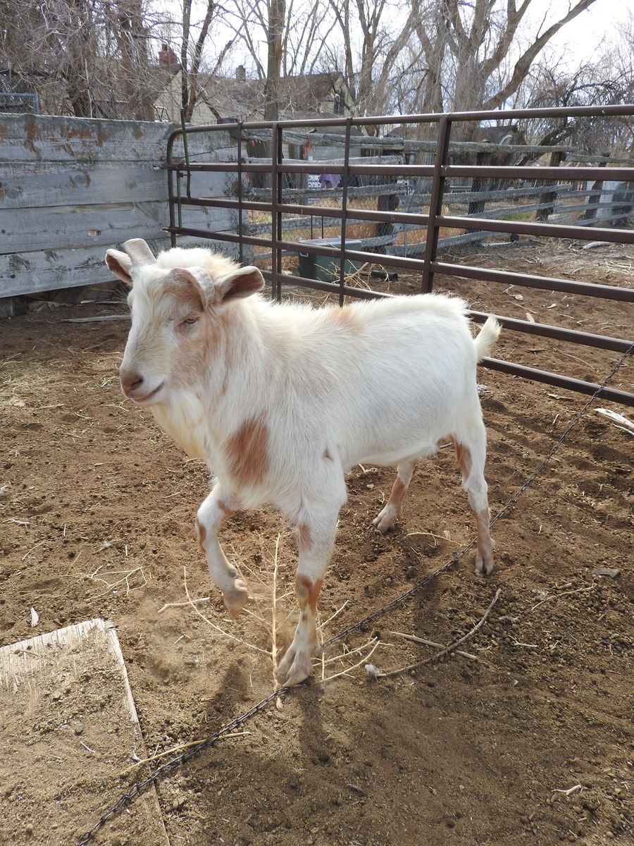This billy goat was born last spring, he has a lot of Saanen in him, and the babies born this year are really cute. He's big, and likes to jump out of his cage, so hopefully you have a tall pen, as he will probably get bigger as time goes by.