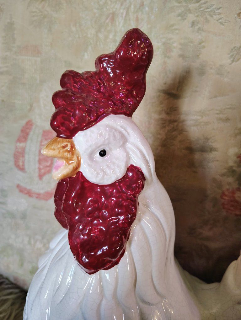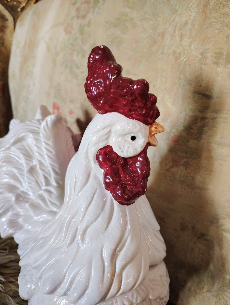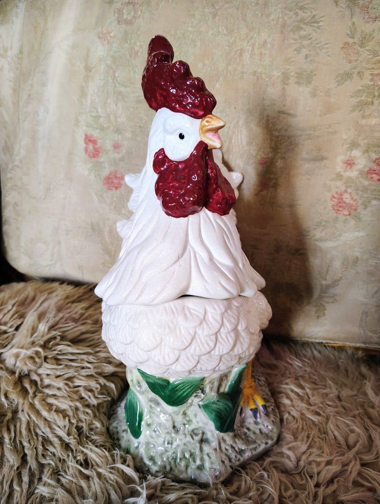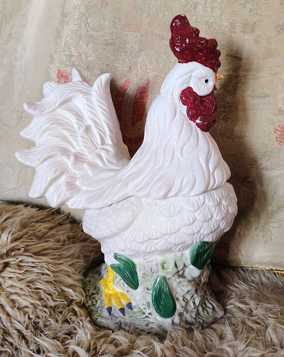 A vintage cookie jar stands approximately 14.5 inches tall. Its design—a white body with a textured red comb and wattle—is characteristic of mid-20th-century ceramic kitchenware often produced in Japan or by companies like Atlantic Mold. Dimensions: 14.5 H, 9 3/4 L, 7 W approximately. Origin: Many similar hand-painted ceramic pieces from the 1940s–1960s are marked as "Made in Japan". Tiny bit chips at the bottom of the upper body probably from the factory (see photo circled in red.)