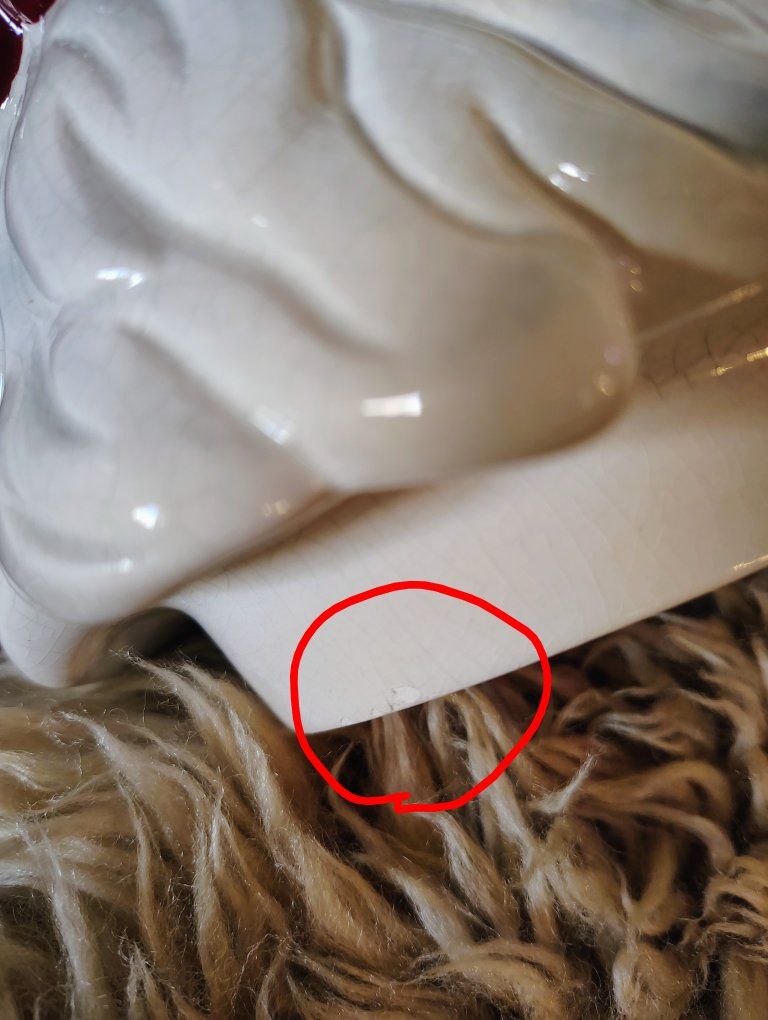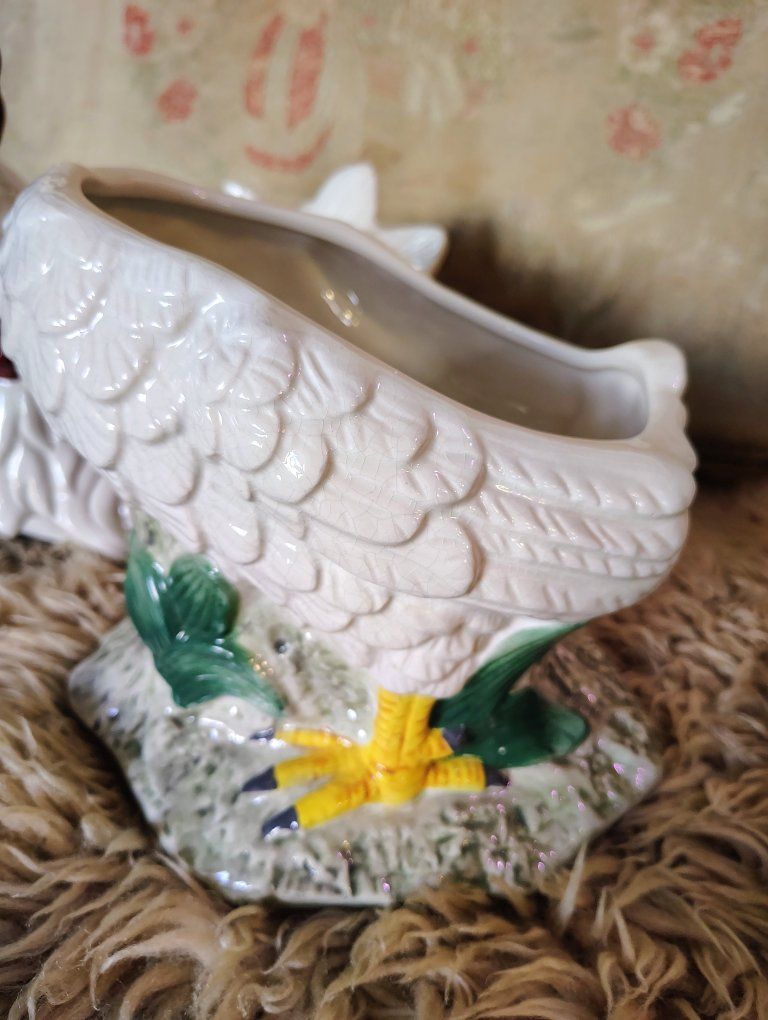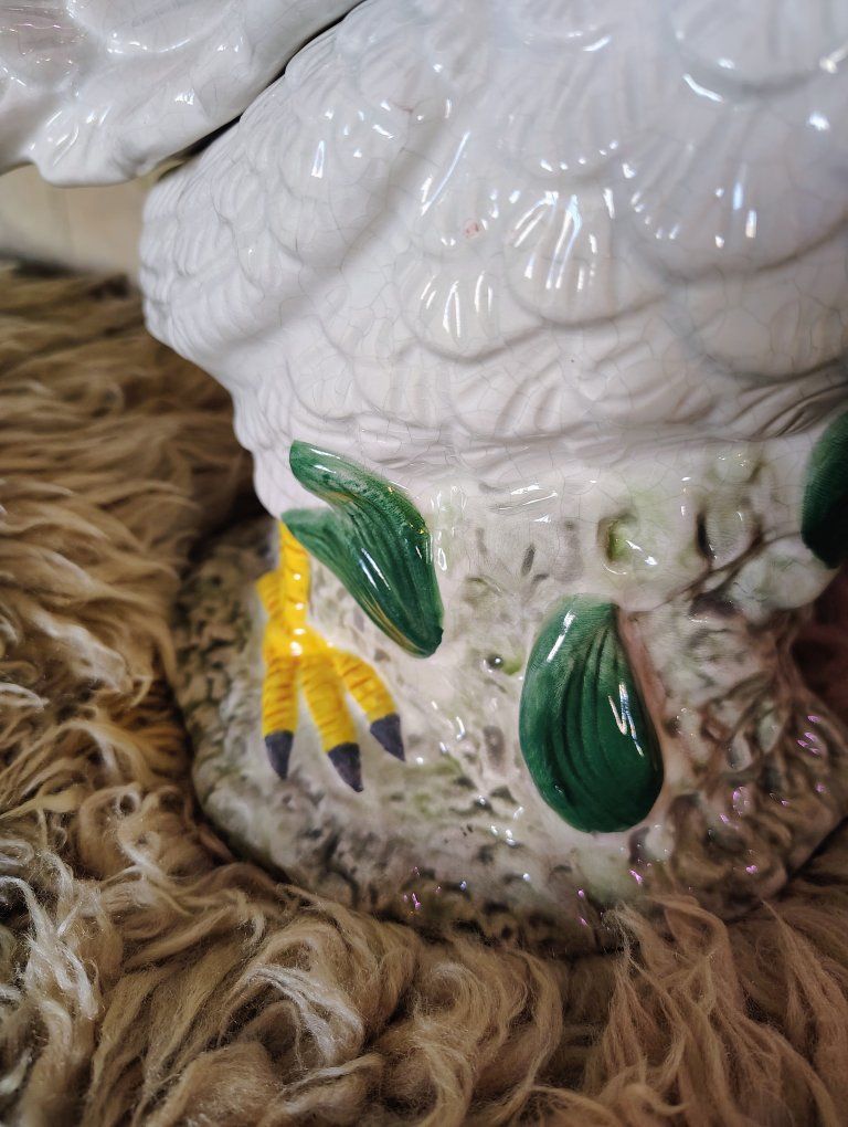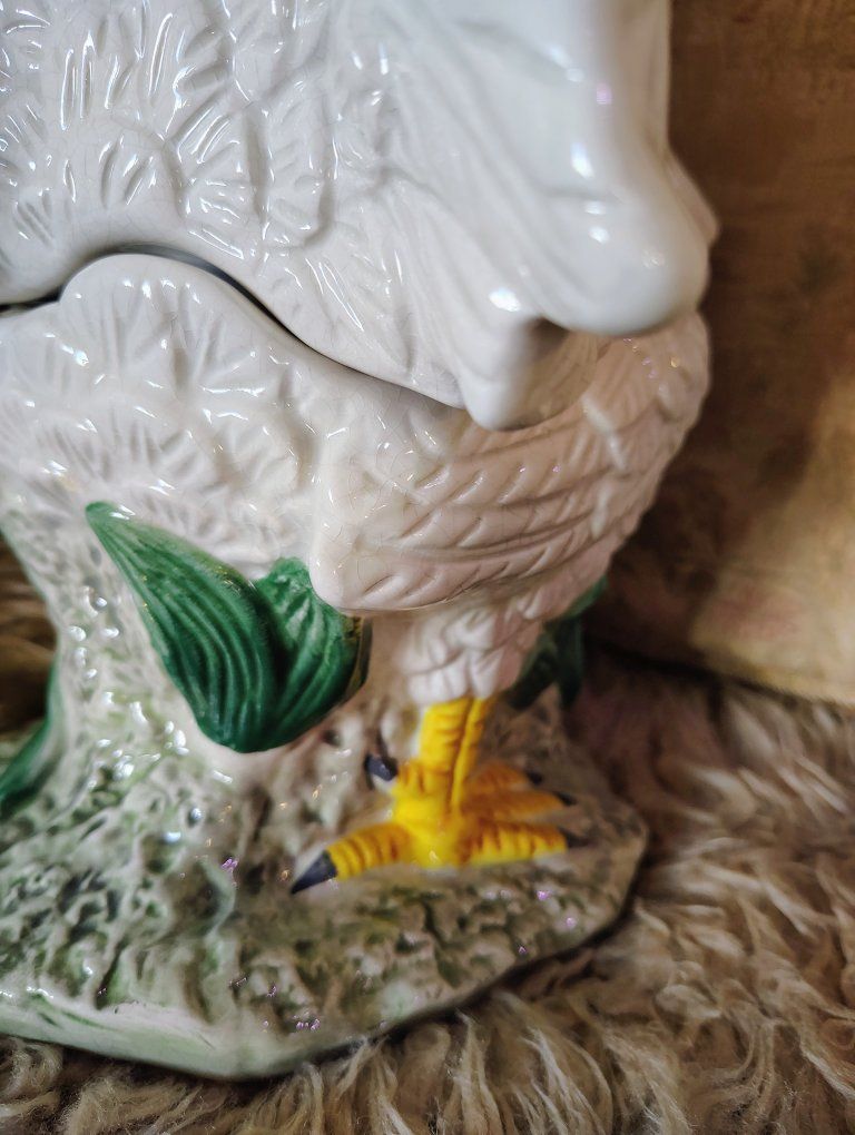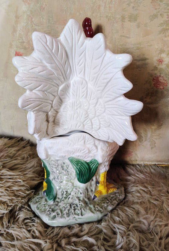 A vintage cookie jar stands approximately 14.5 inches tall. Its design—a white body with a textured red comb and wattle—is characteristic of mid-20th-century ceramic kitchenware often produced in Japan or by companies like Atlantic Mold. Dimensions: 14.5 H, 9 3/4 L, 7 W approximately. Origin: Many similar hand-painted ceramic pieces from the 1940s–1960s are marked as "Made in Japan". Tiny bit chips at the bottom of the upper body probably from the factory (see photo circled in red.)