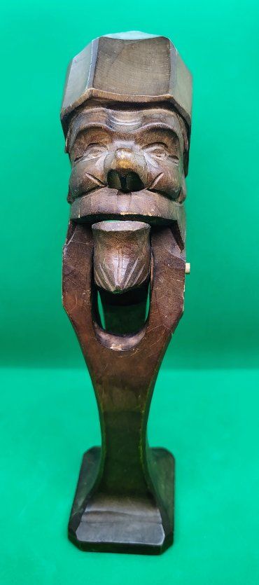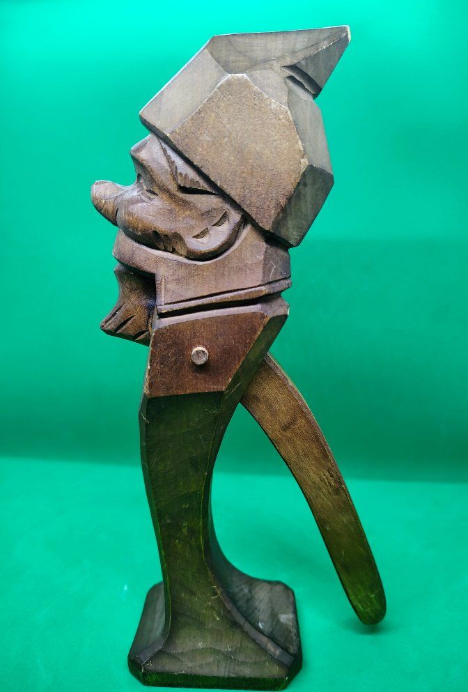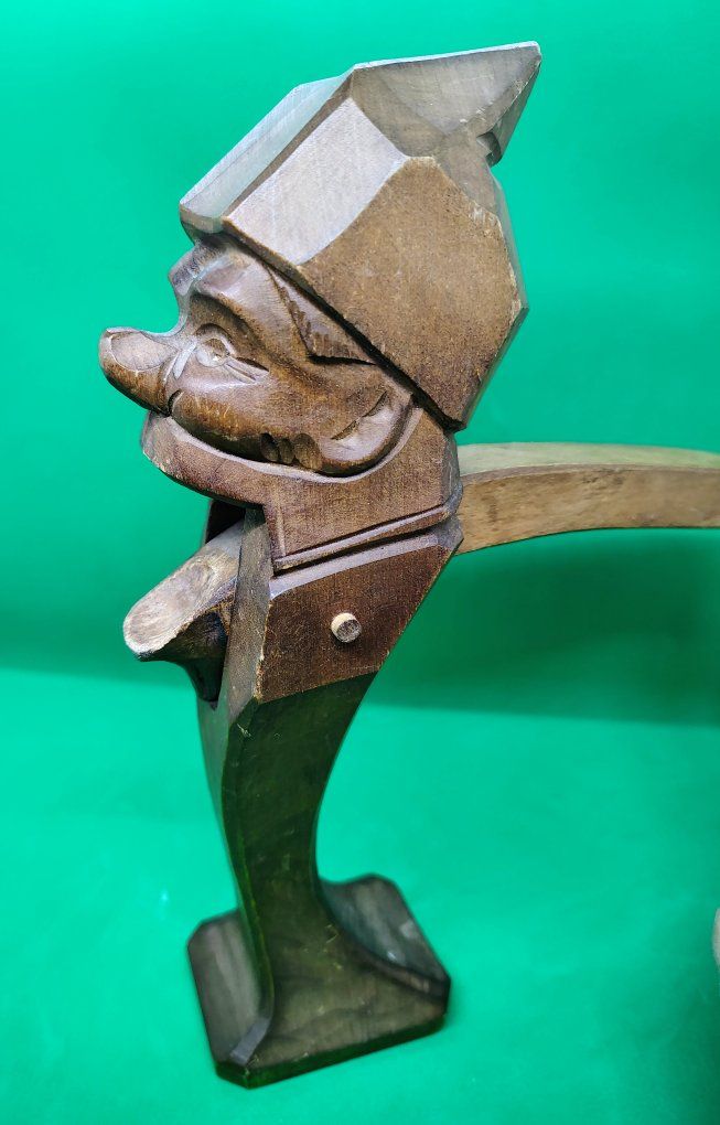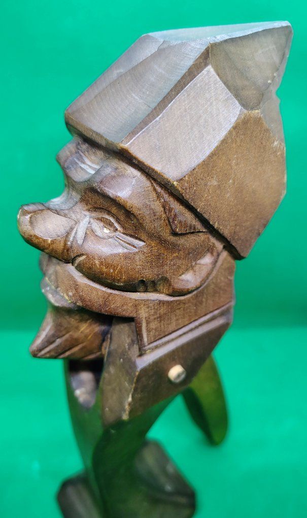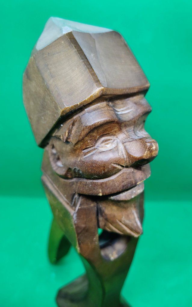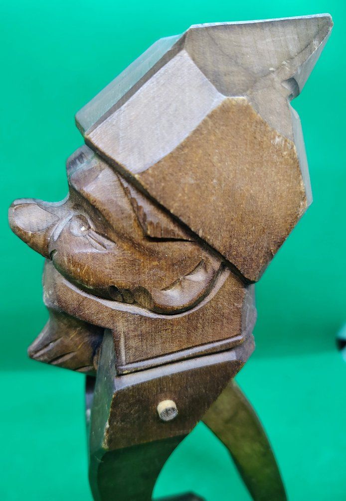This item is an antique Black Forest hand-carved wood nutcracker, crafted in the form of a gnome. This folk-art piece is often attributed to the Black Forest region of Germany and was popular in the early to mid-20th century, with many examples dating specifically to the 1930s. Origin: German Black Forest style, sometimes associated with the Brienz region in Switzerland or Erzgebirge in Germany. Material: Usually carved from walnut or cherry wood. Design: A "lever" style nutcracker where the gnome's lower jaw moves to crack the nut when the back handle is squeezed. Size: approximately 9.5 inches tall. Condition: commensurate with age.