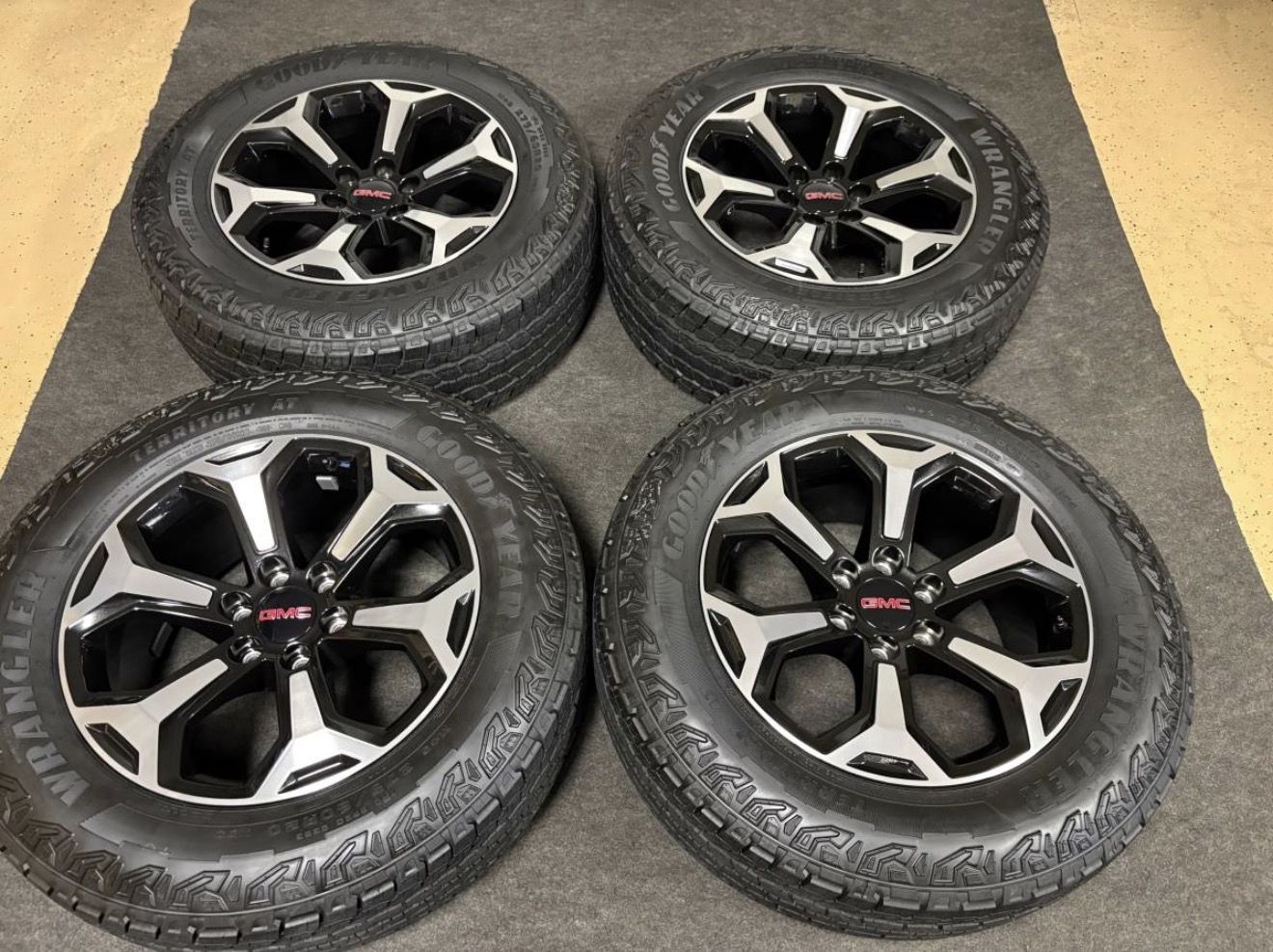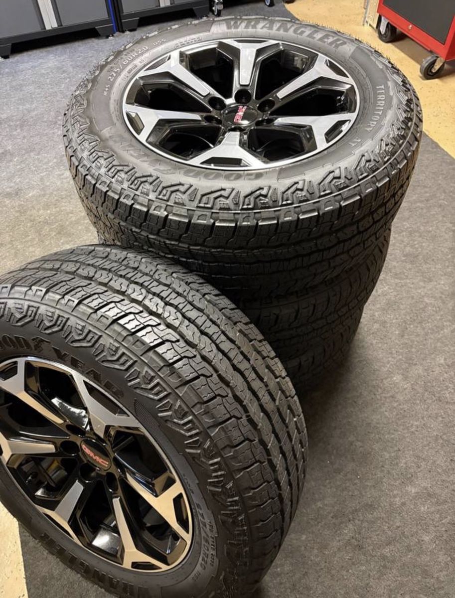 Selling a basically brand new set of (4) OEM 20” GMC Yukon AT4 Ultimate wheels and tires (only 2K miles!!) These are the black/polished aluminum alloy wheels paired with 275/60R20 Goodyear Wrangler Territory All-Terrain tires.