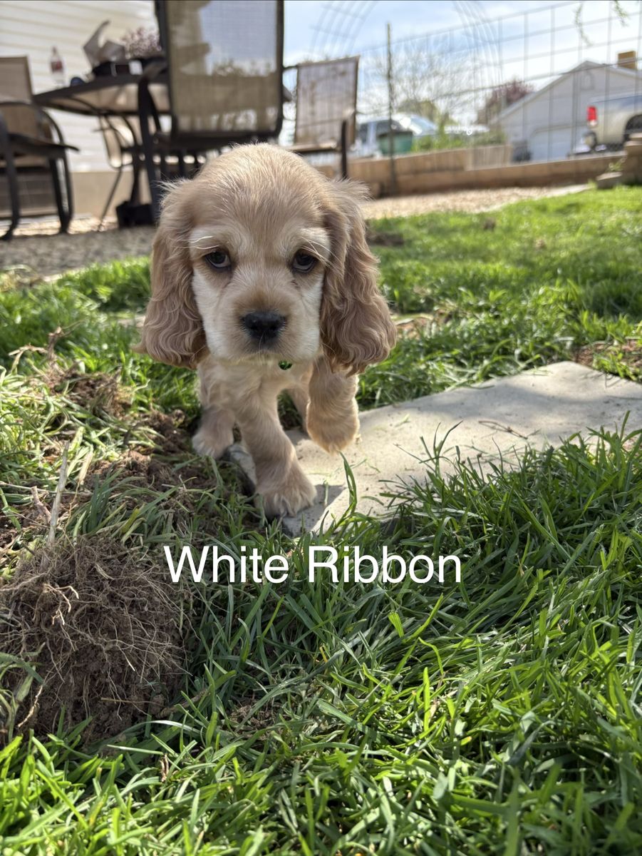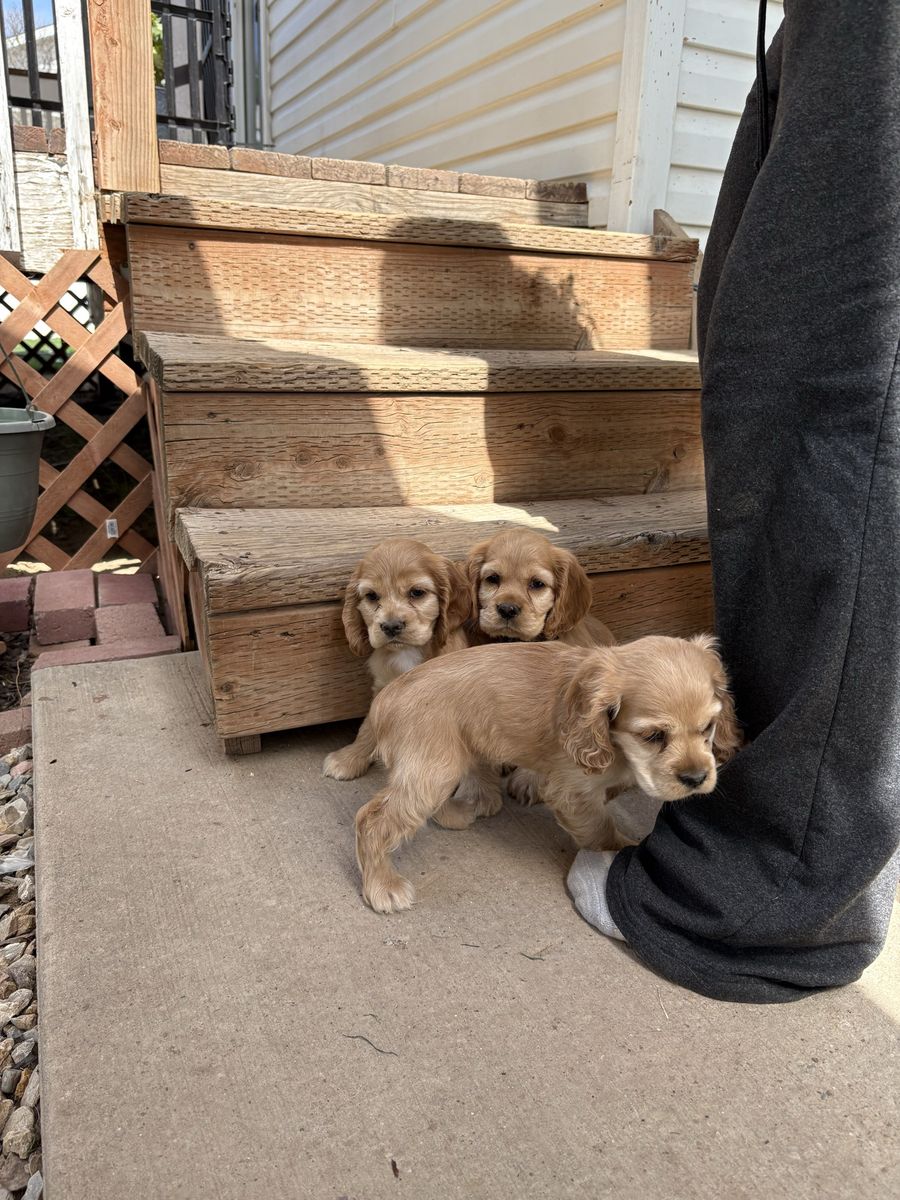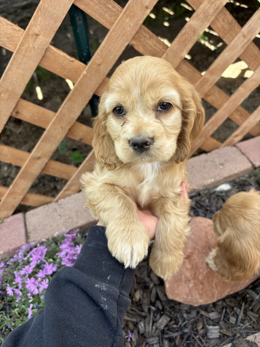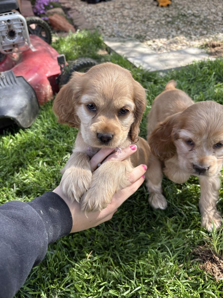 Venmo2 puppies left, READY NOW! Just in time for Easter! Purebred Cocker Spaniel puppies. Born on February 11, are 7 weeks old. They have their first shots, tails docked, and dew claws removed. 3 females, 1 male, all buff. Handled and loved daily, raised in our home! These puppies are amazing! Don’t miss out! Blue ribbon boy AVAILABLE White ribbon girl AVAILABLE Pink ribbon girl SOLD Tan ribbon girl SOLD Photos of mom, dad and grandparents included! Dad (Dutch) and mom (Brandi) are excellent family dogs with happy-go-lucky, friendly dispositions. Dad weighs about 25 lbs and mom around 15 lbs. Ready for a hike or to relax on the couch. Great beginner breed, extremely versatile and loving! Our dogs have exposure to chickens, cats, other dogs, and children. Will be in Clinton, UT around Easter. Based in Moab, UT. Can work to meet for delivery.