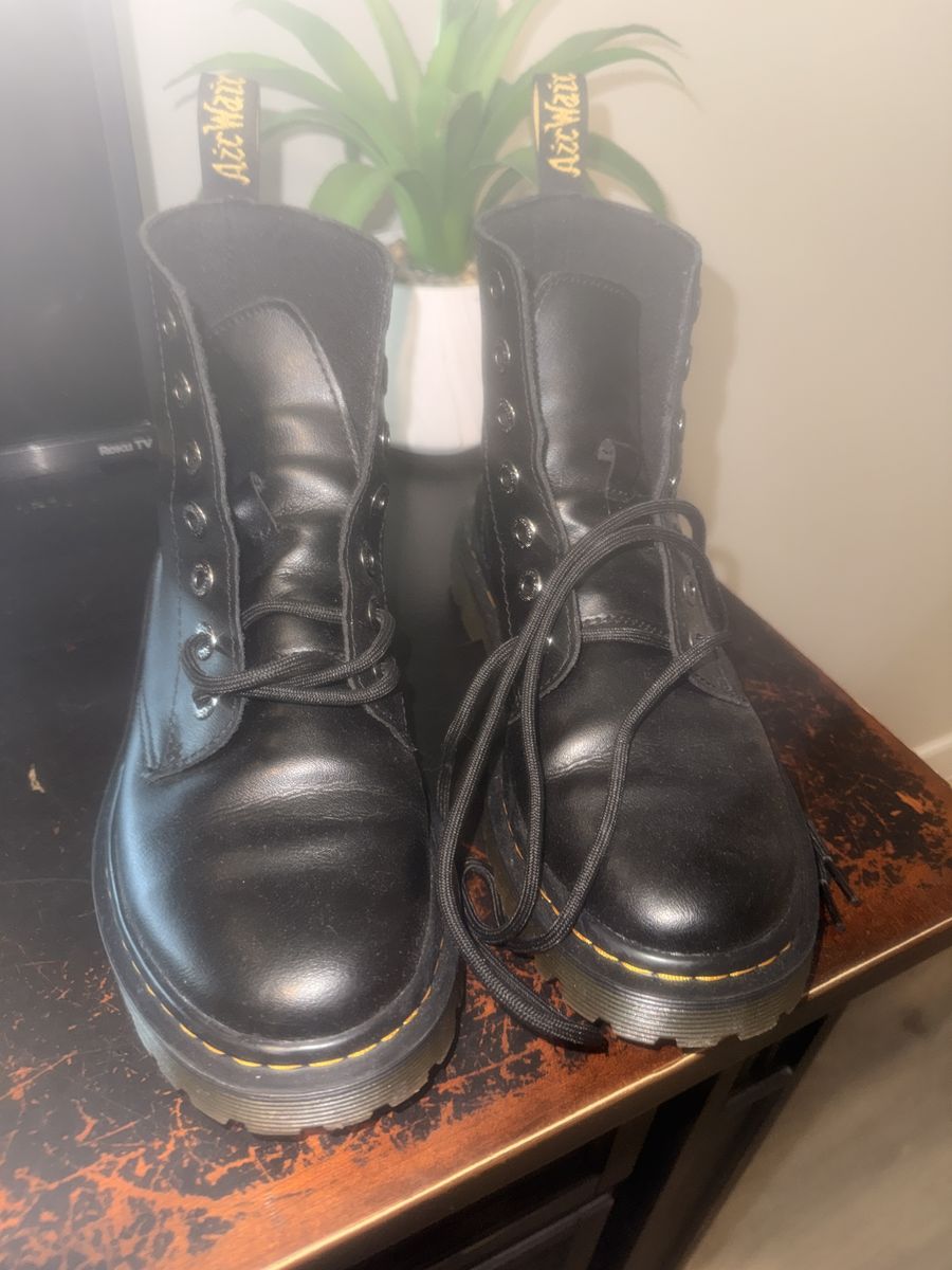 Dr. Martens black leather 8-eye combat boots in very good condition. These boots have only been lightly worn and are still in great shape with plenty of life left. Made with durable leather uppers, the classic yellow stitching, and the iconic AirWair cushioned sole for comfort and traction. Stylish, tough, and perfect for everyday wear. Clean and well cared for. Great deal compared to buying new. Size 7