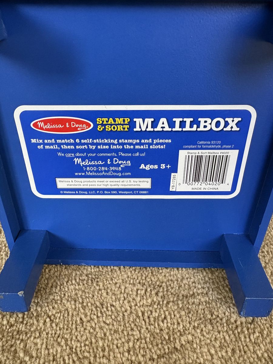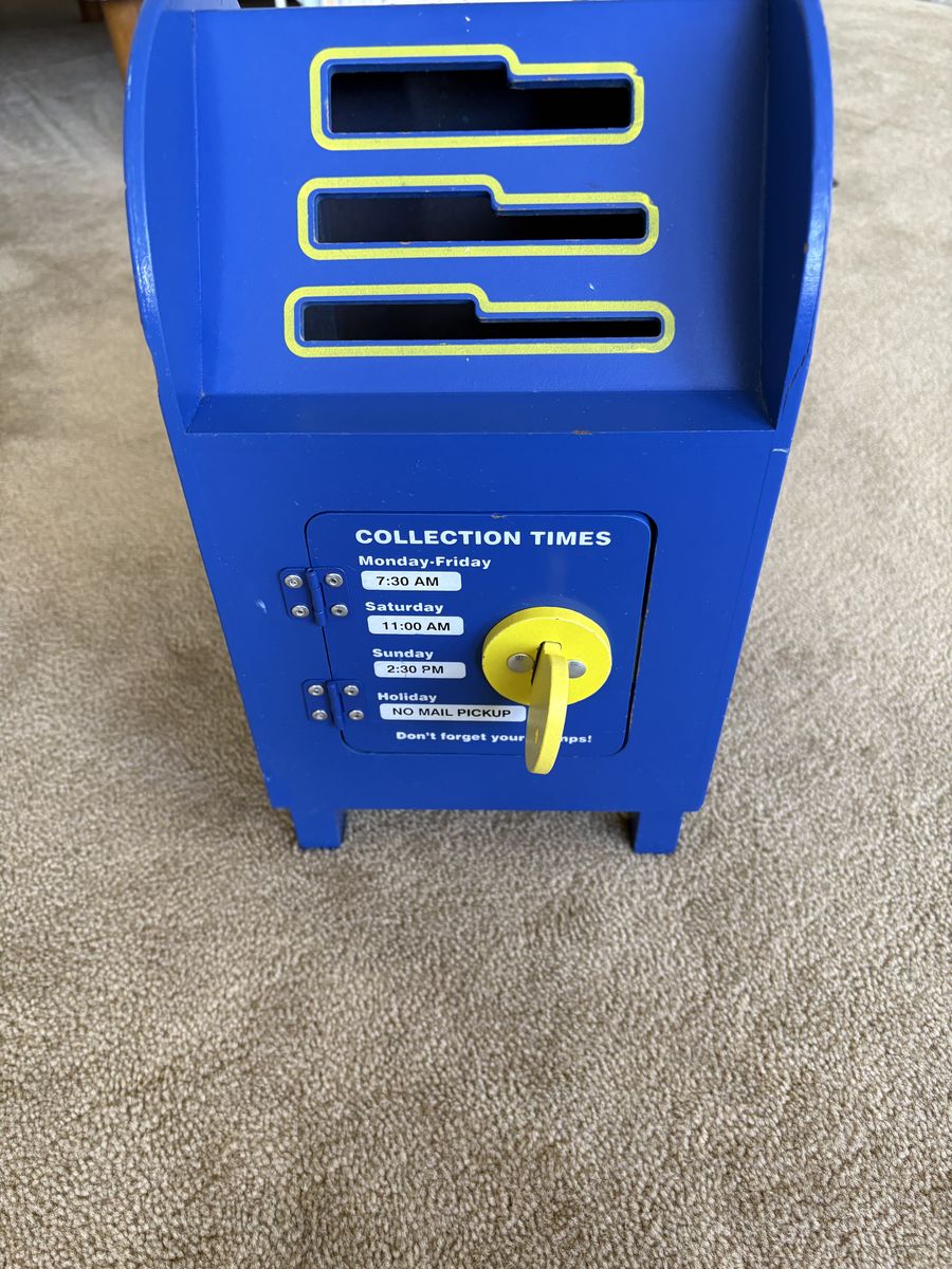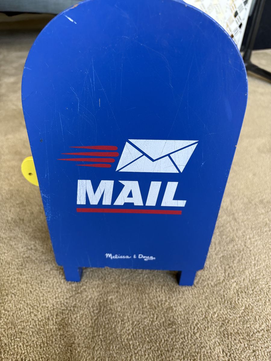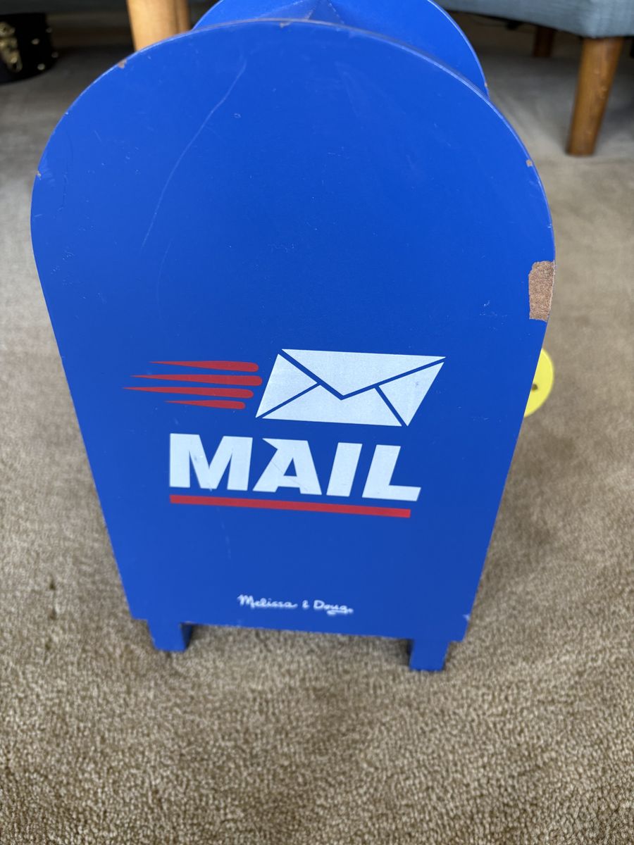 Melissa and Doug Stamp & Sort Mailbox Set. Includes everything shown in photos: large mailbox with slots and collection times, key to open door, 5 letters/postcards, and 5 stamps (attach with Velcro). Sturdy wooden toys, high quality. Some wear from play, still in very good condition. Text only. Cash or Venmo. Discount on multiple items.