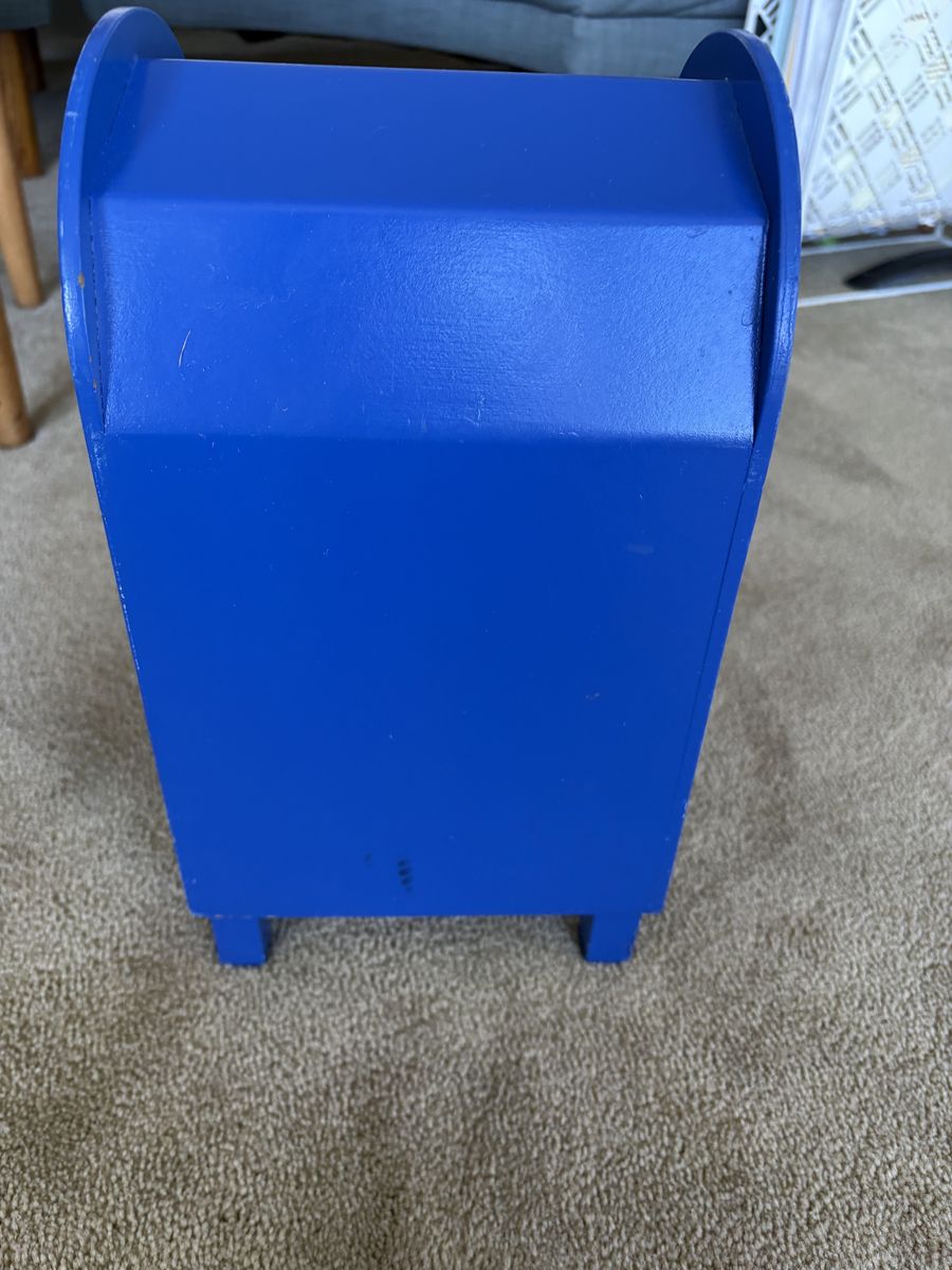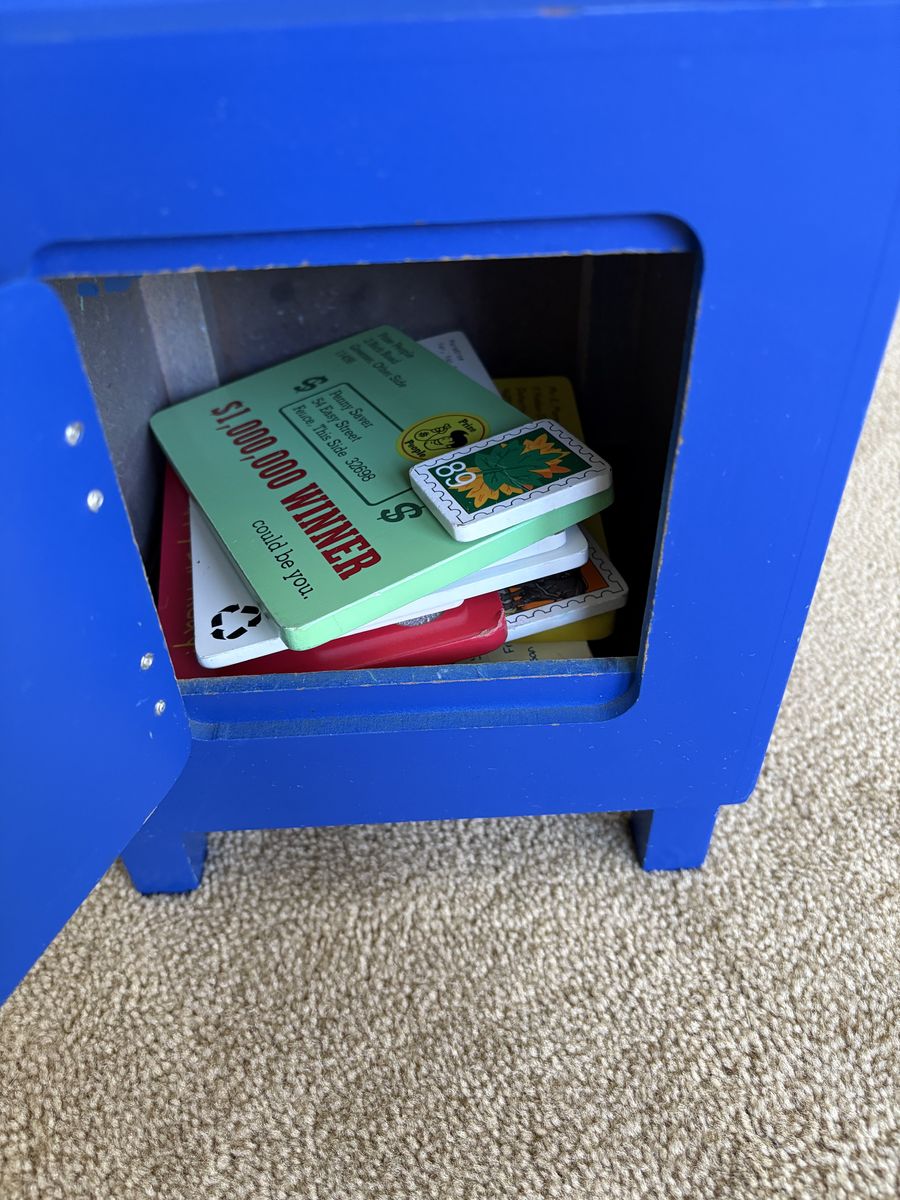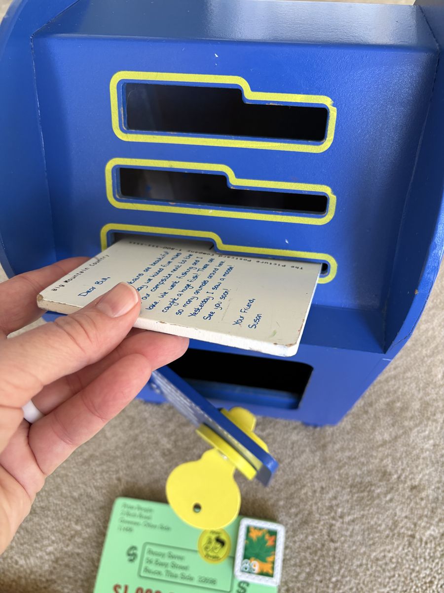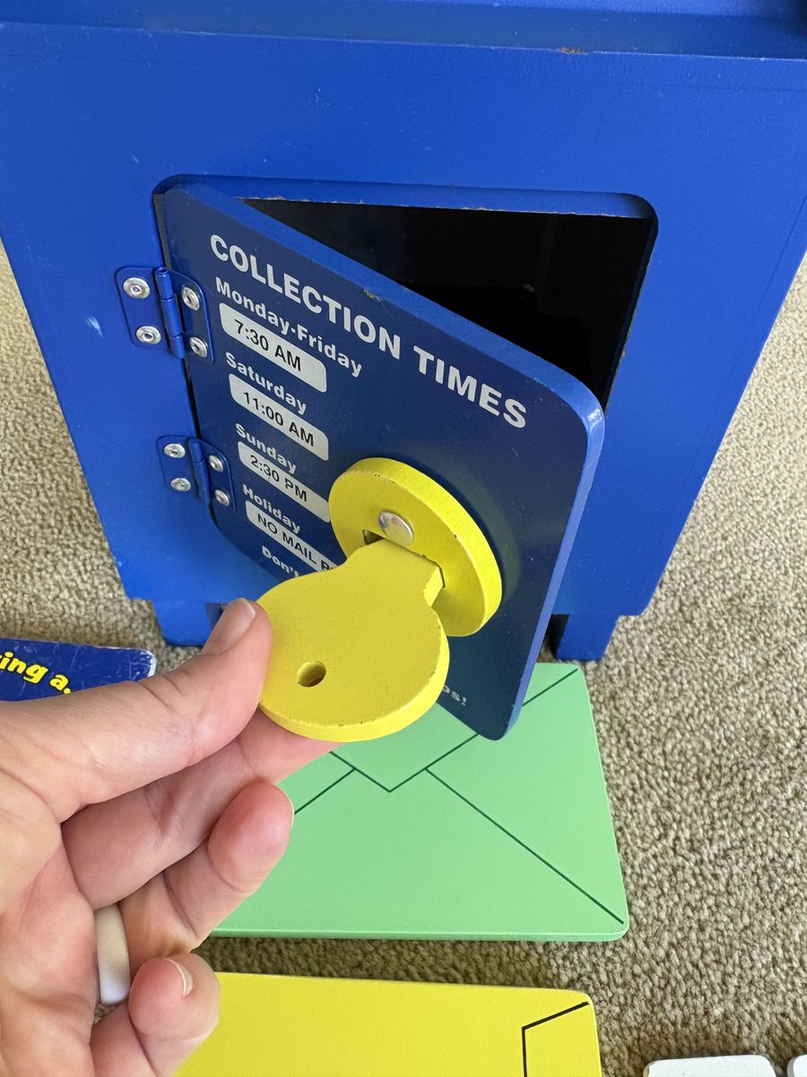 Melissa and Doug Stamp & Sort Mailbox Set. Includes everything shown in photos: large mailbox with slots and collection times, key to open door, 5 letters/postcards, and 5 stamps (attach with Velcro). Sturdy wooden toys, high quality. Some wear from play, still in very good condition. Text only. Cash or Venmo. Discount on multiple items.