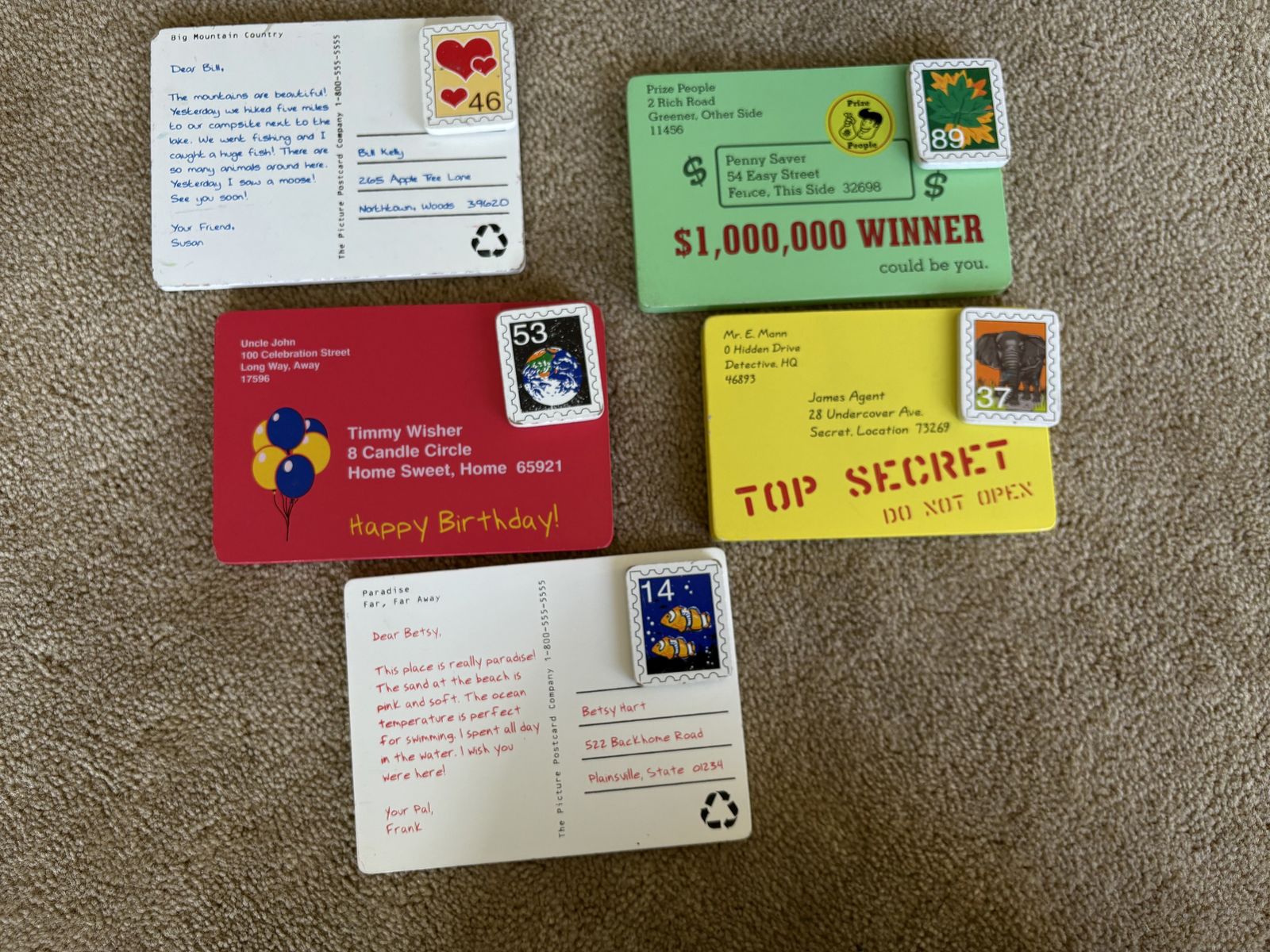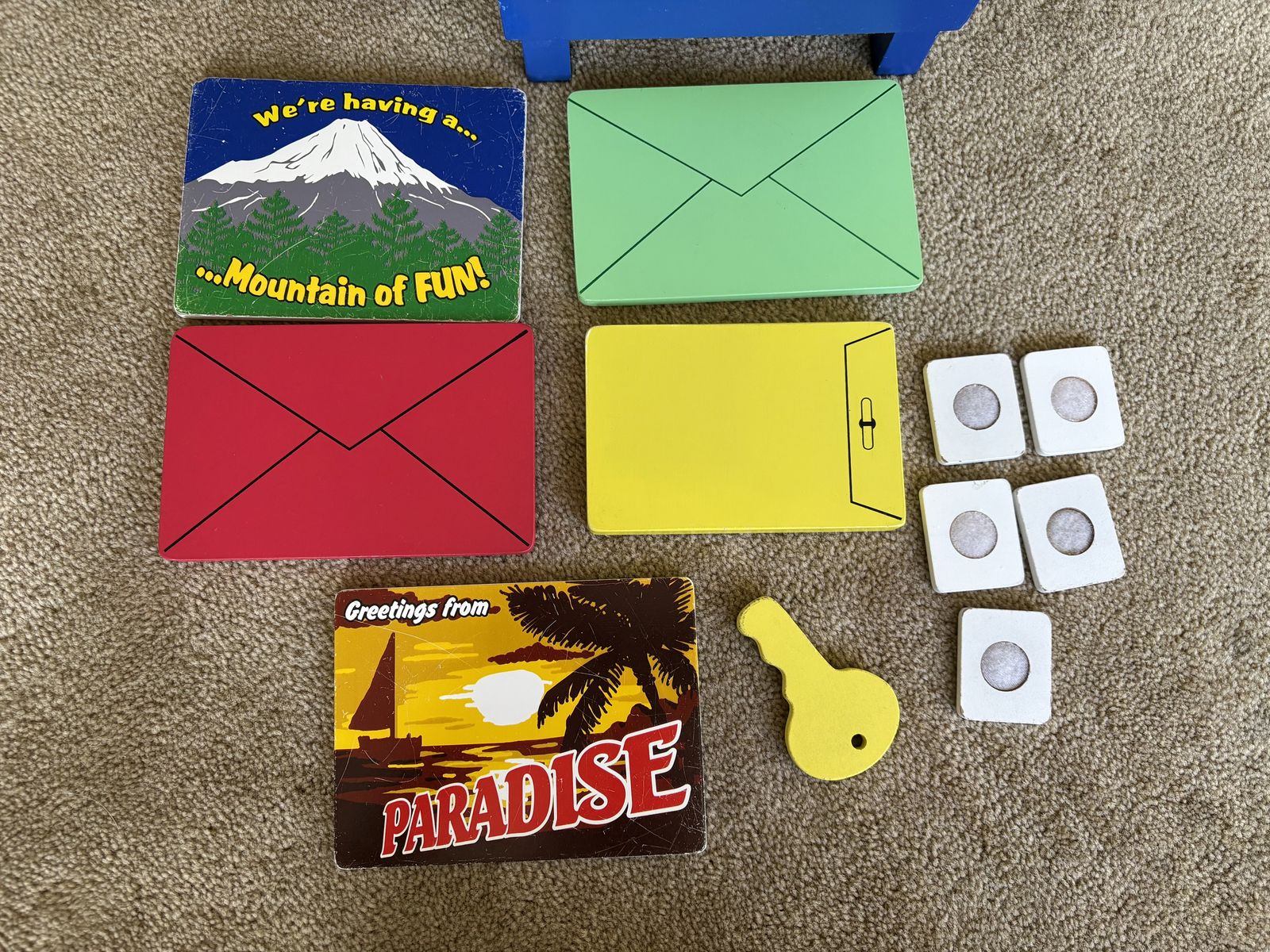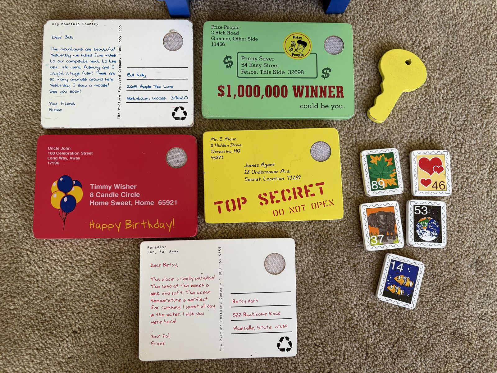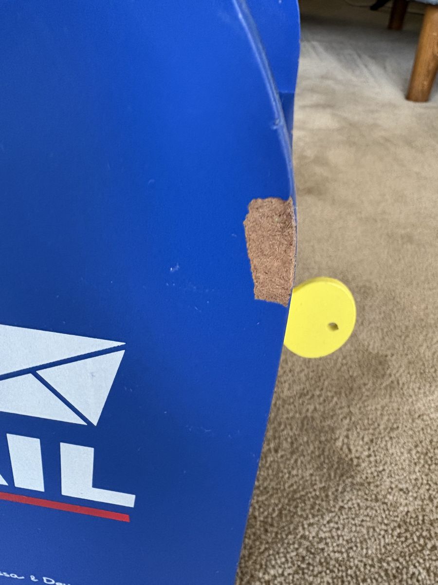 Melissa and Doug Stamp & Sort Mailbox Set. Includes everything shown in photos: large mailbox with slots and collection times, key to open door, 5 letters/postcards, and 5 stamps (attach with Velcro). Sturdy wooden toys, high quality. Some wear from play, still in very good condition. Text only. Cash or Venmo. Discount on multiple items.