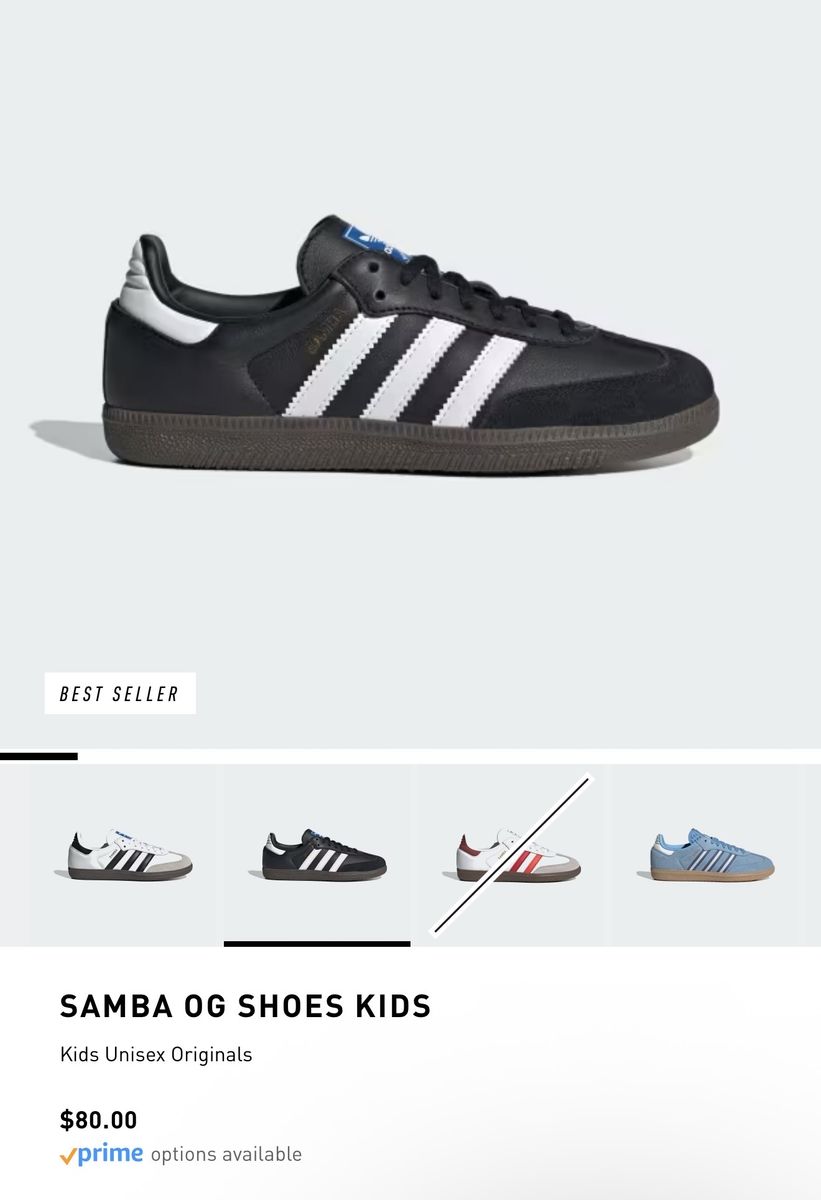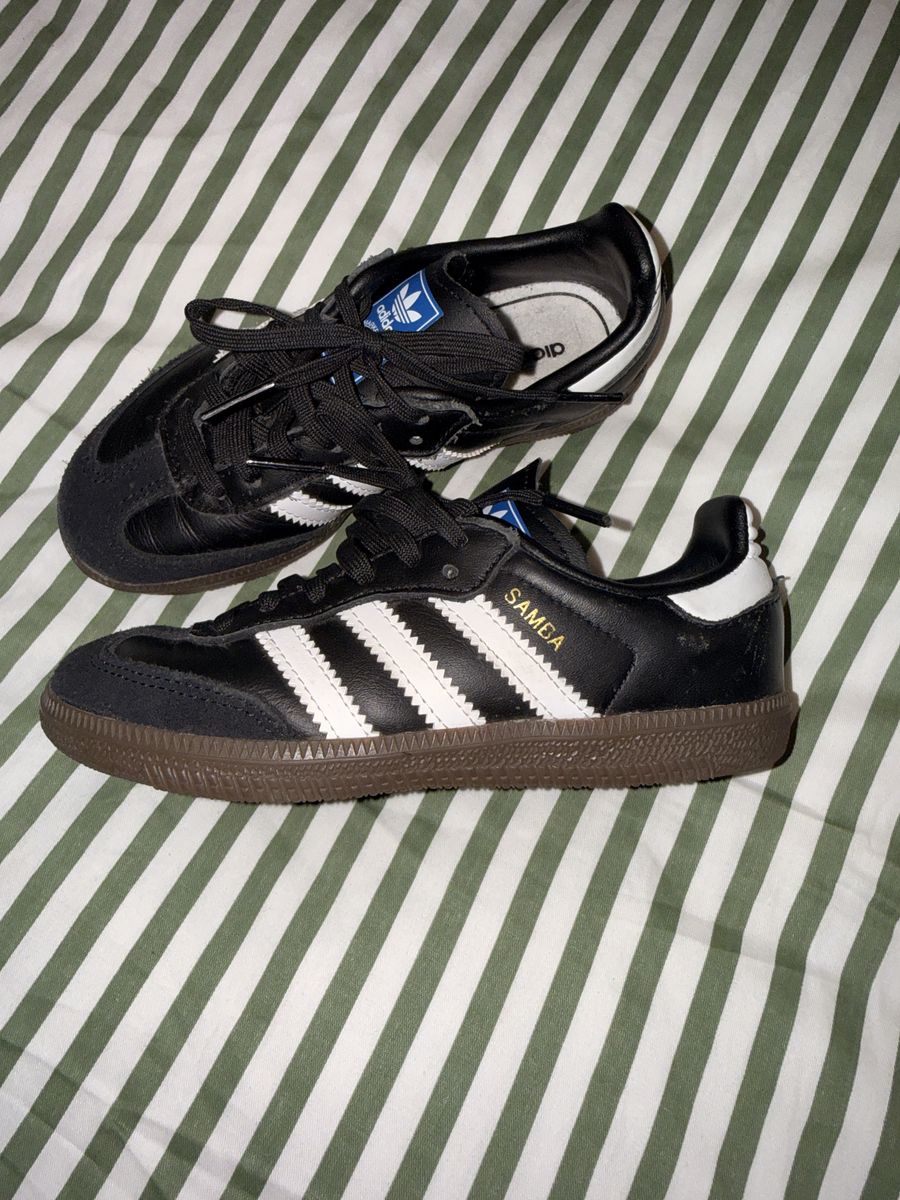 Great pair of classic Adidas Samba OG shoes for kids. These are stylish, comfortable, and perfect for everyday wear, school, or sports. The iconic black and white design goes with almost anything. They are in great condition and still have lots of life left in them. Adidas Sambas are known for their durability and timeless look. Asking a great price for a quality pair of shoes!