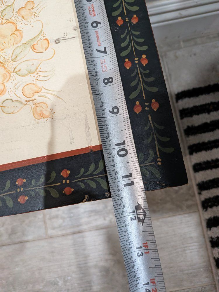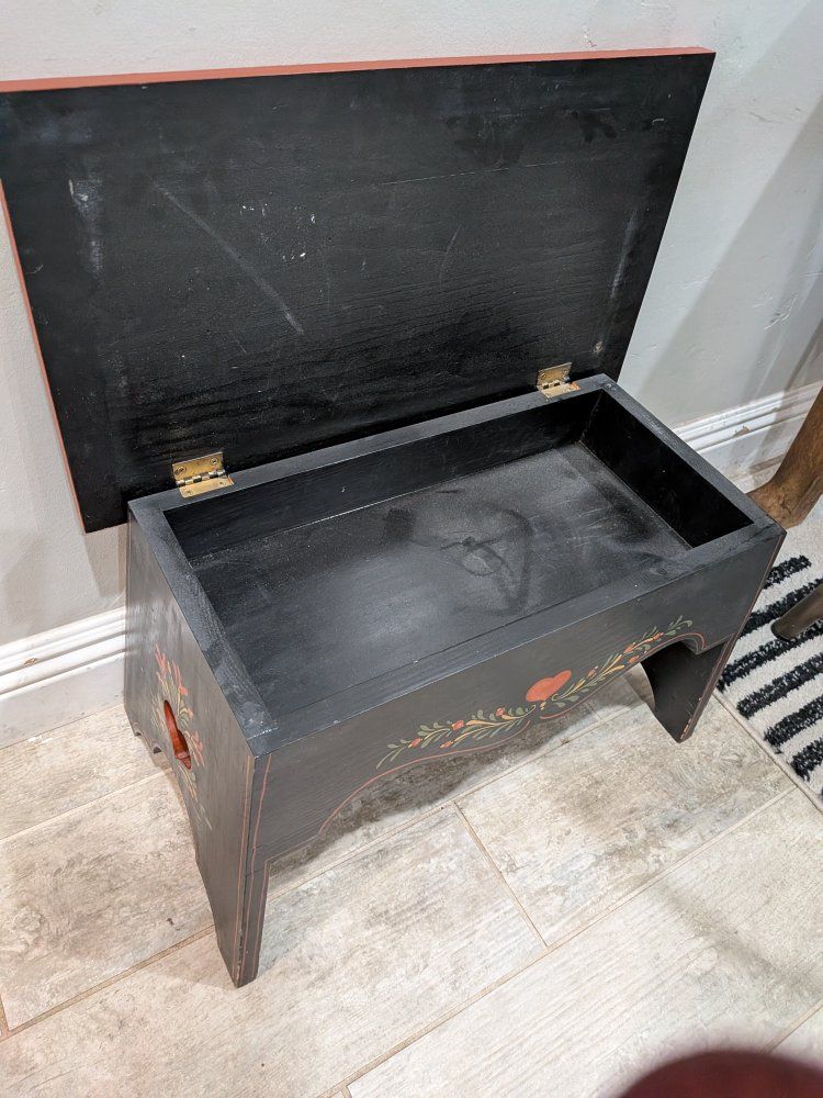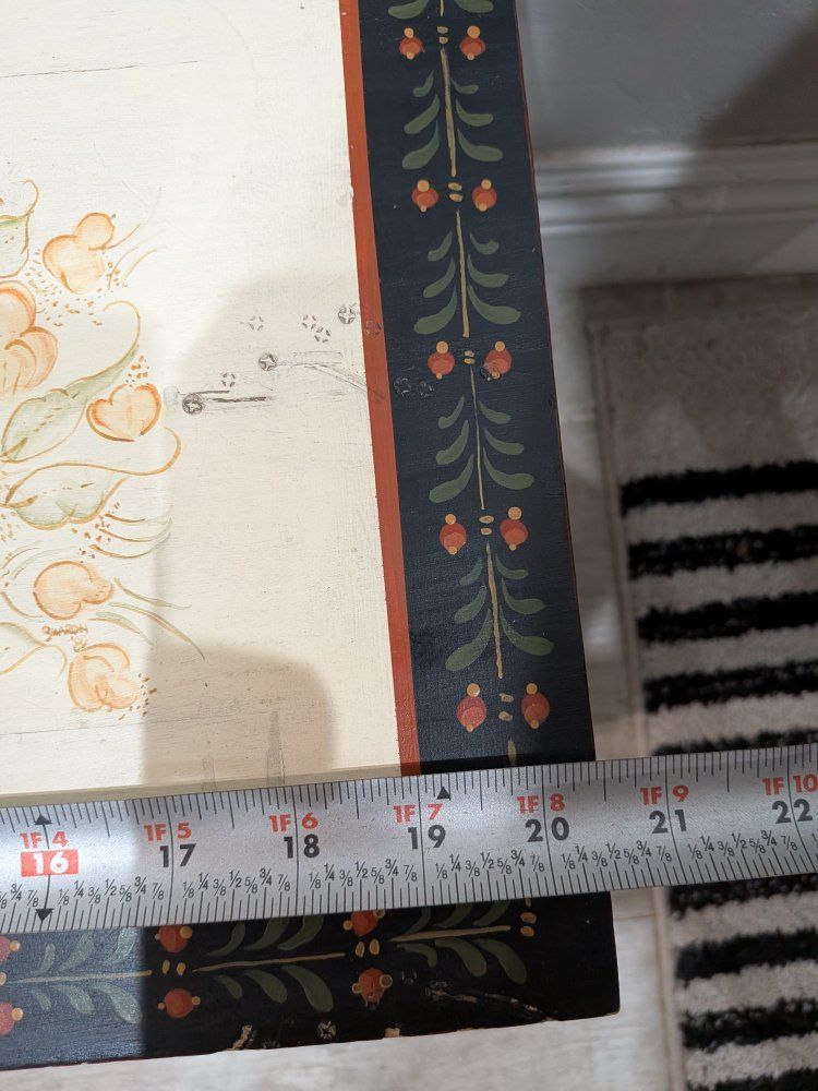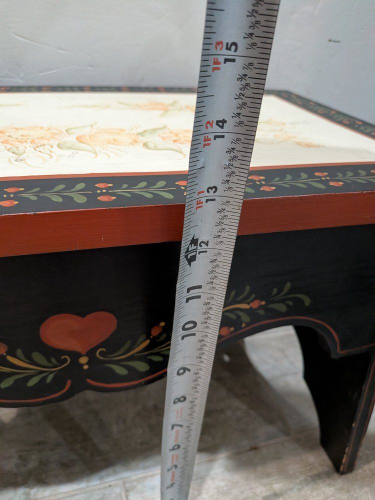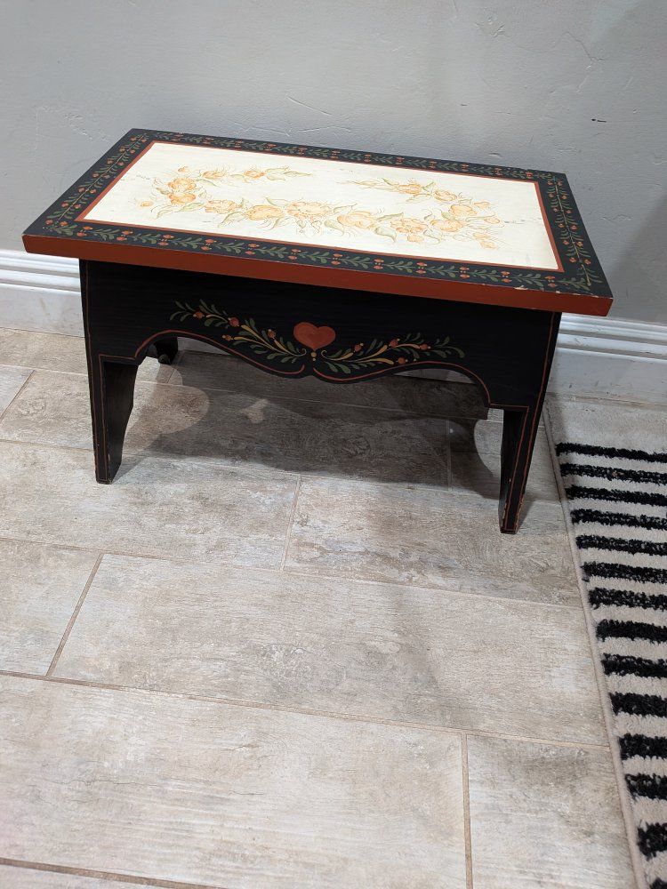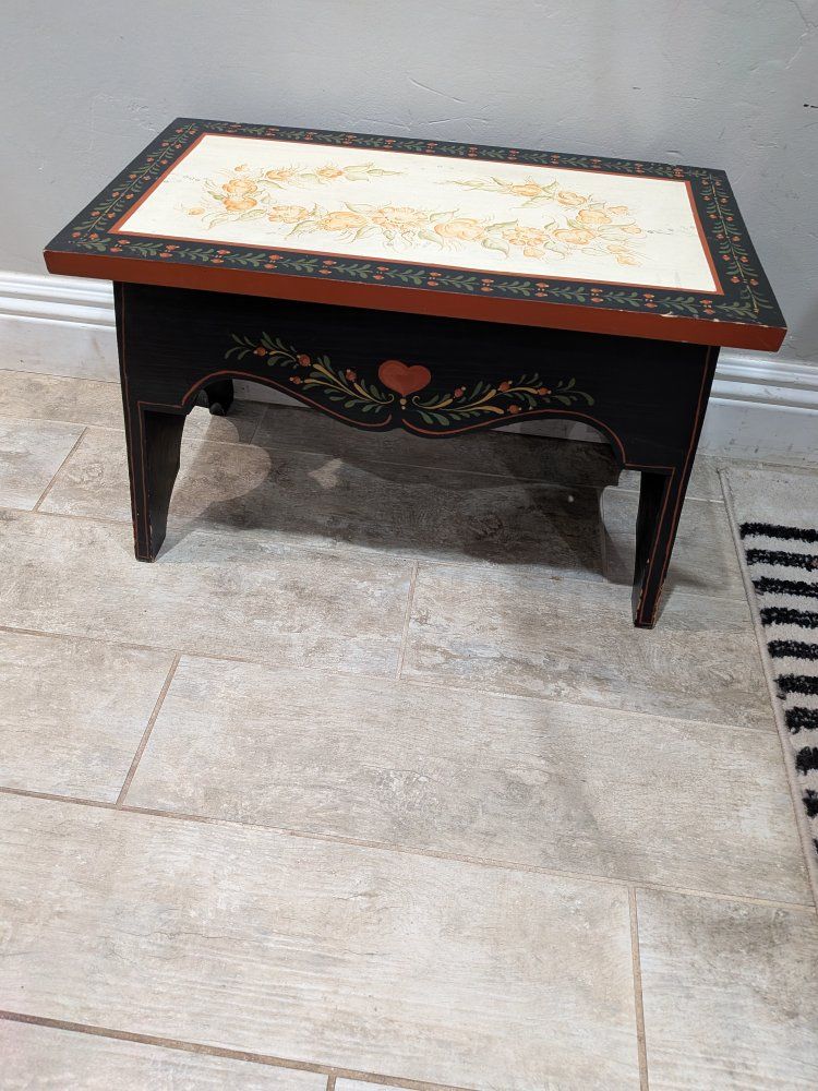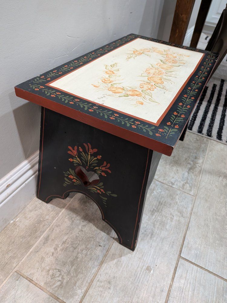 Vintage Folk Art Decorative Stool. Hand‑painted folk art wooden stool featuring a floral top panel and heart motif. A sweet, cottage‑style accent perfect as a plant stand, entryway perch, or decorative stool. Lovely patina, sturdy build, and full of cozy, vintage character