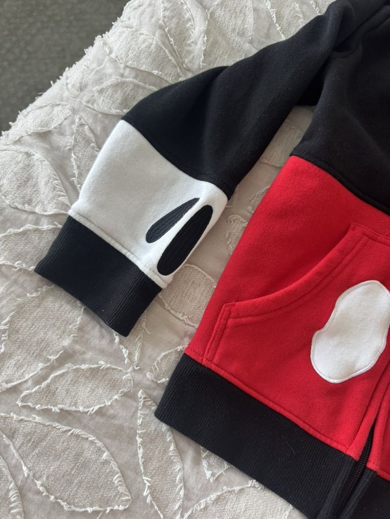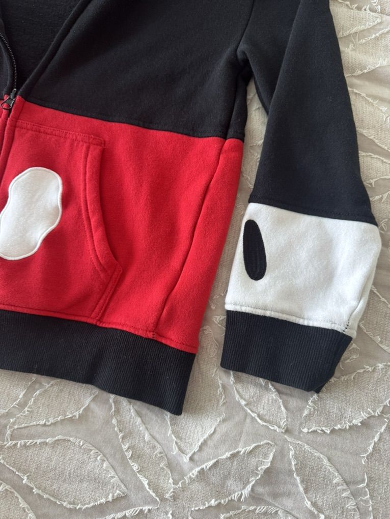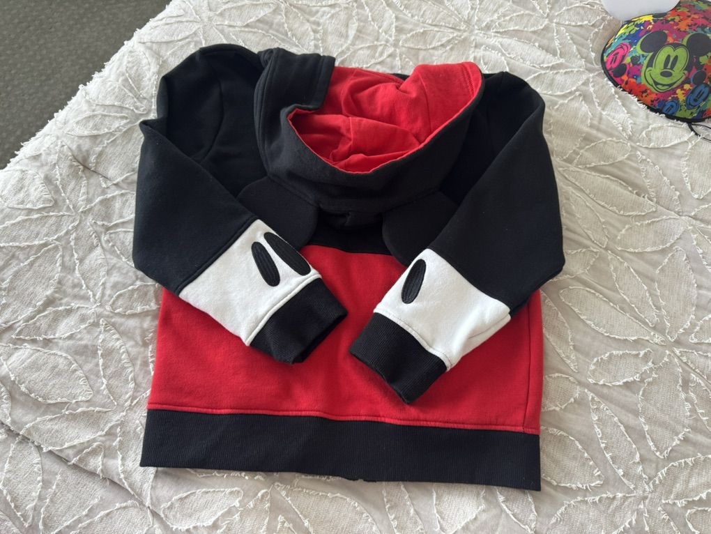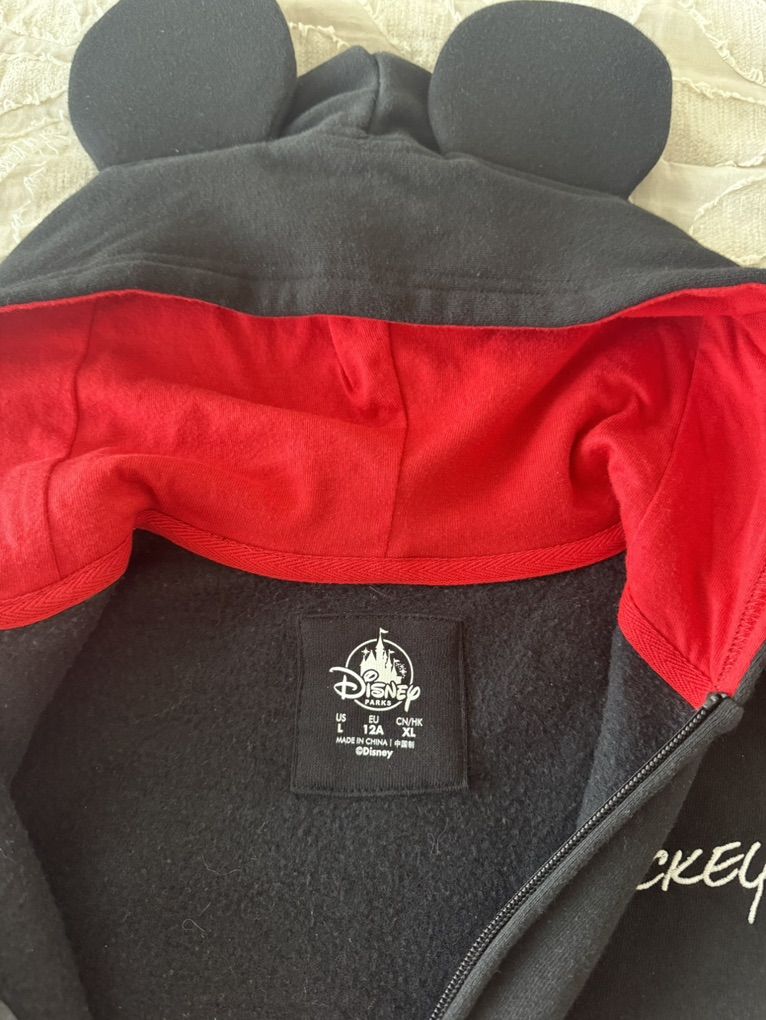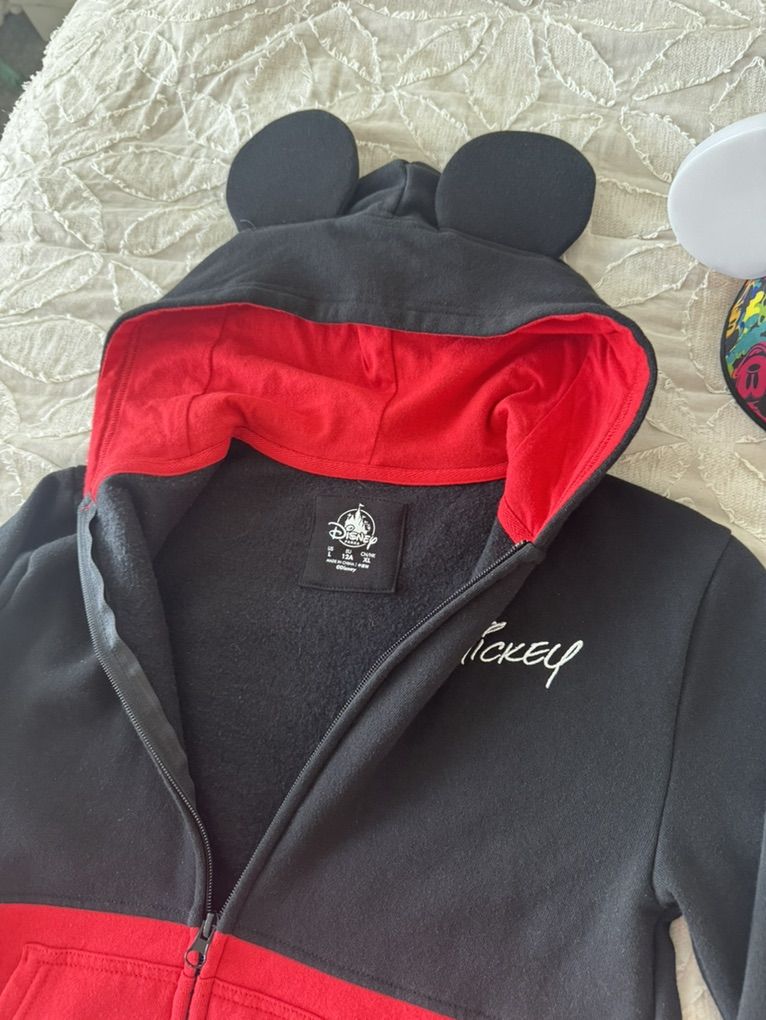 ApplePayFun Disney Parks Mickey hoodie in kids size Large with the classic Mickey colors and ears on the hood.