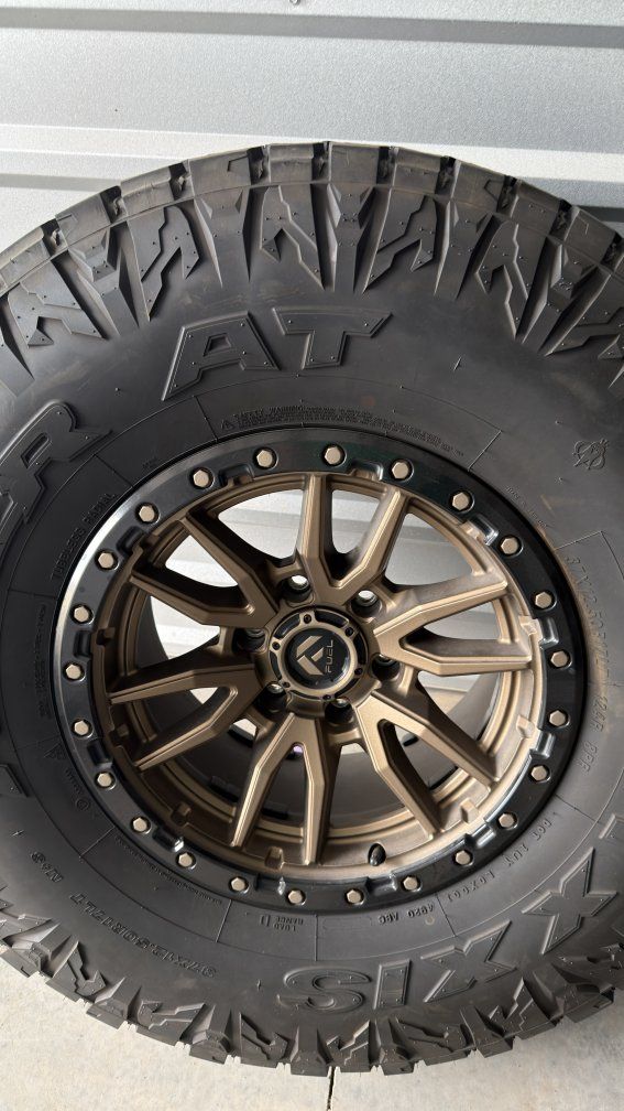 The Wheels: Fuel Off-Road Rebel (D680) wheels are in great shape! Finish: Matte Bronze center with a Black simulated beadlock ring (non-beadlock for easier balancing/maintenance). Condition: Great shape, providing that iconic "bronze on black" look that fits almost any vehicle color. Specs: * Bolt Pattern: 6 x 139.7mm (6 x 5.5") Center Bore: 93.1 mm Thread Size: M12 x 1.5