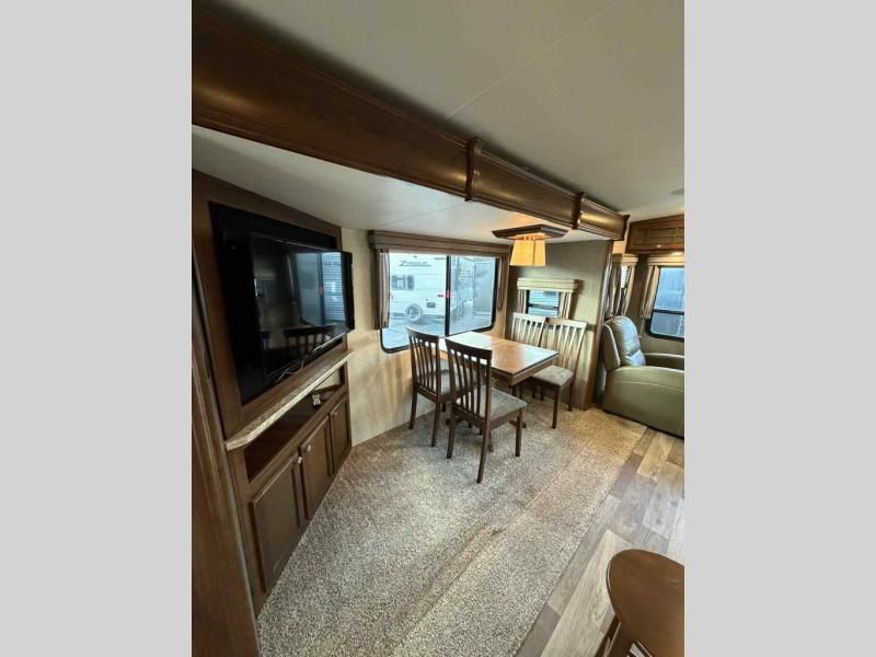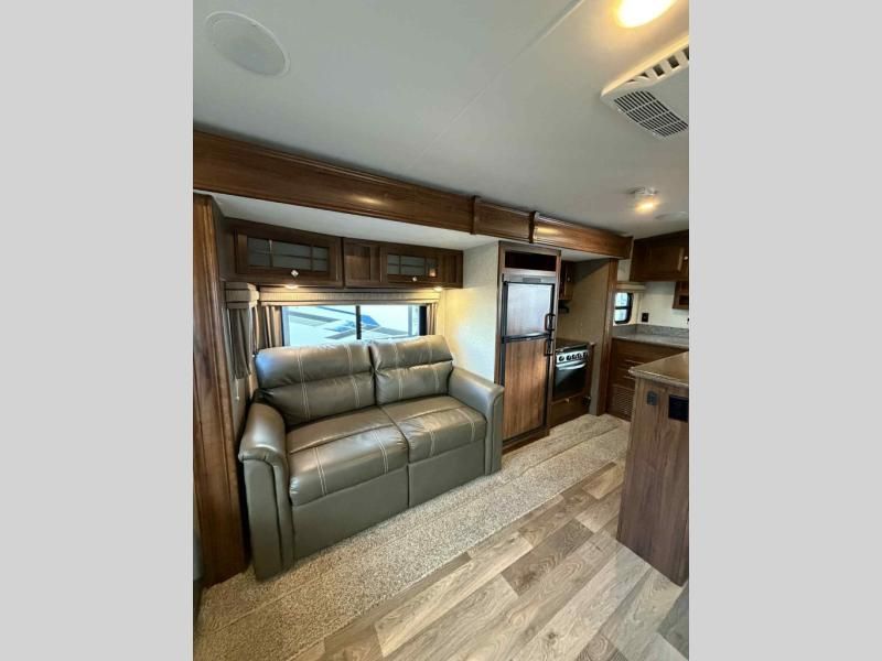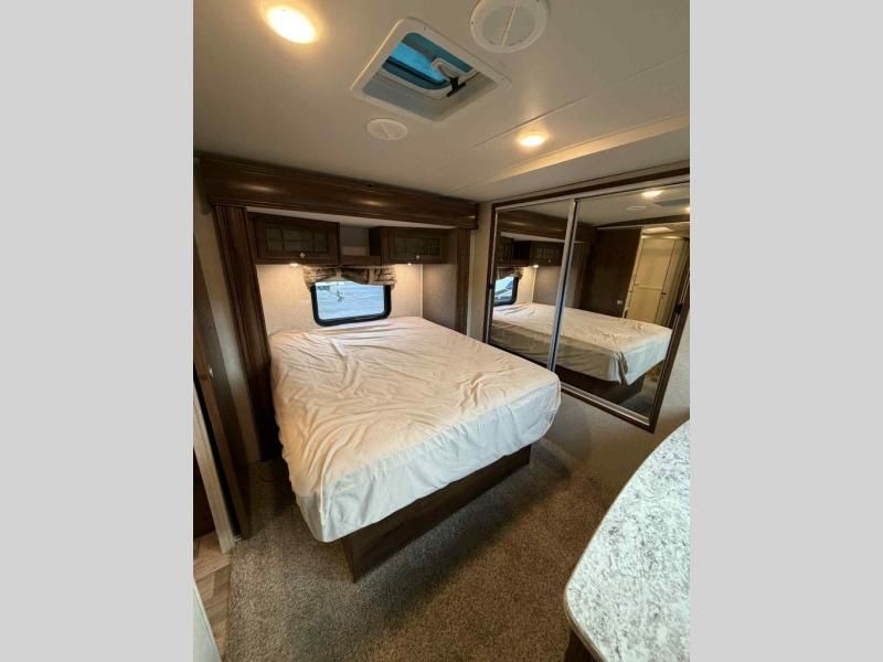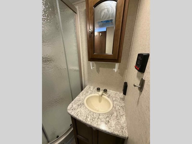In the front bedroom you will enjoy a spacious room with slide out queen bed with overhead cabinet. Across there is dresser storage, and along the front wall of the room you will find a wardrobe. A flat screen TV can be mounted on the interior bedroom wall opposite the bed for easy viewing.