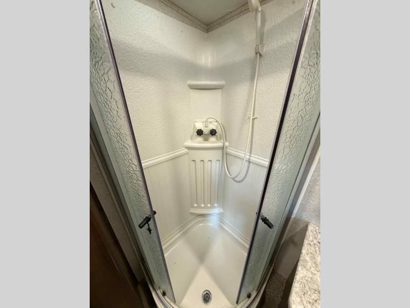 Step inside and notice how convenient the bathroom is located. No running through the unit when enjoying the great outdoors. There is an angled shower, linen cabinet, toilet, and sink with storage above. The sliding door inside the bath leads directly into the front master suite.