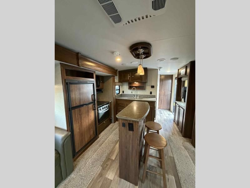 The slide opposite has a sofa, refrigerator, three burner range, and overhead cabinet. Adjacent to the slide is a double kitchen sink with extra counter space for preparing meals. In the middle of the kitchen find an island with two bar stools for added dinner space, and along the rear of the trailer there are two swivel lounge chairs, shelves, and an overhead cabinet providing more seating for family and friends.