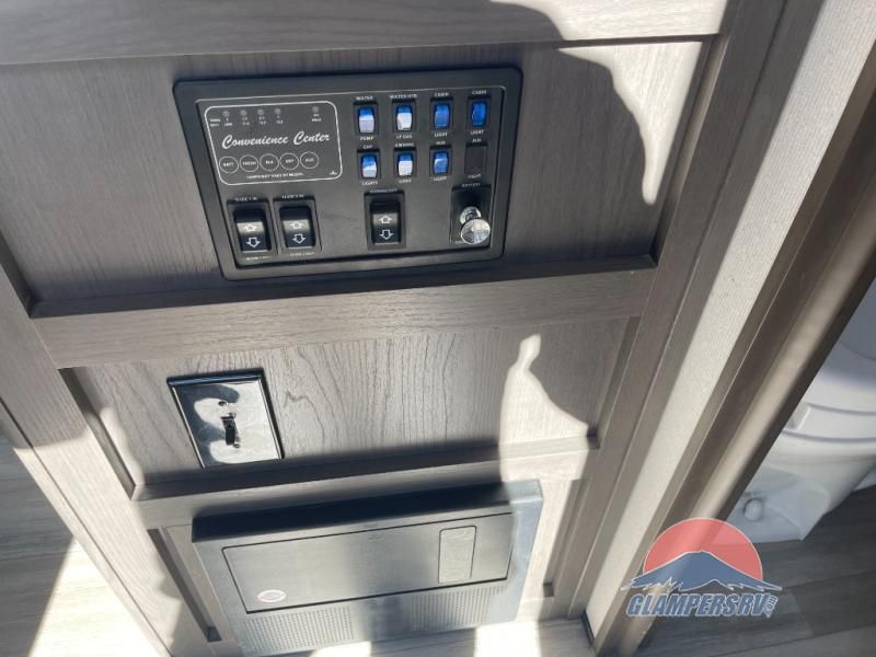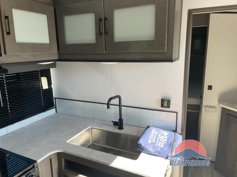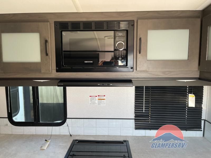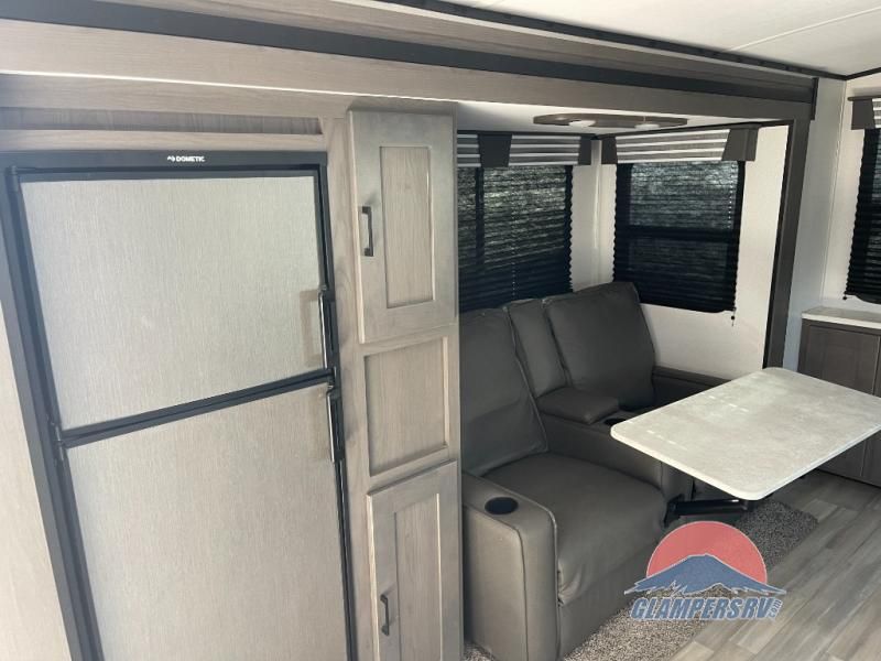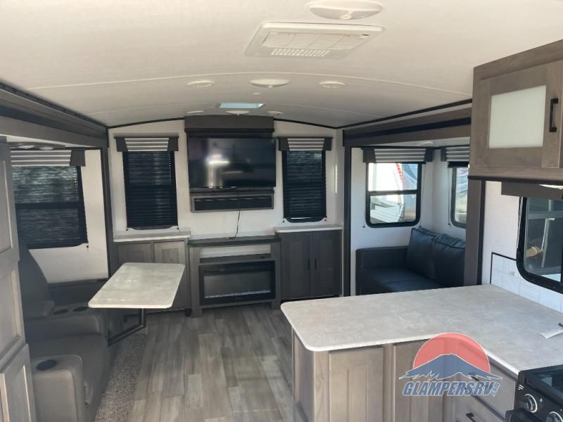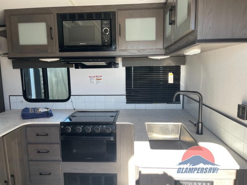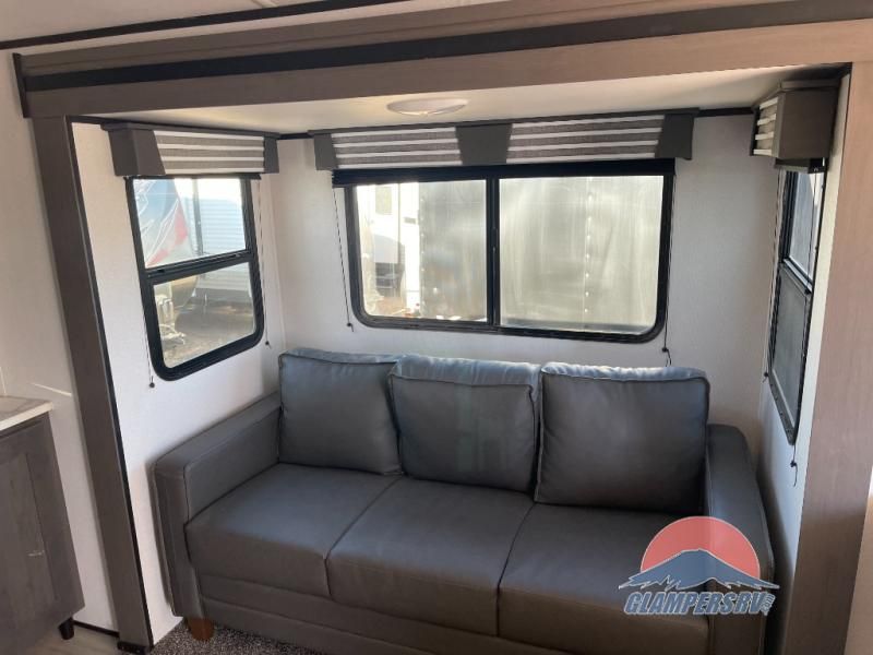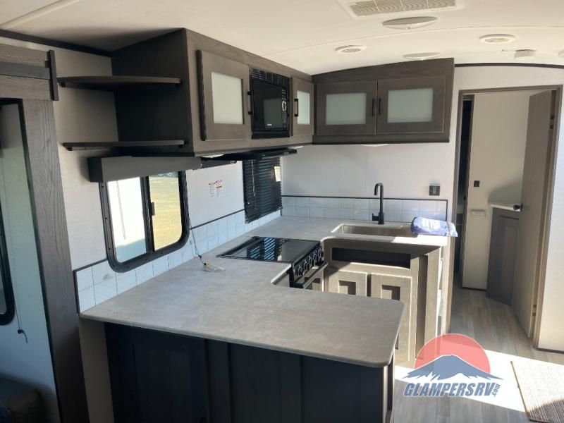 The thing that you are going to like best about this MPG travel trailer is the spacious rear living area! This part of the trailer has a rear entertainment center and a set of opposing sofa slides, and since this section is also adjacent to the kitchen, you can sit in one of the two bar stools at the breakfast bar while still being a part of the living area. Having a walk-through bath is convenient because it means that you can access the bathroom from the main living area or from the comfort of the front private bedroom, and having a king-size bed in the bedroom means that you will be able to sleep in supreme comfort each night.