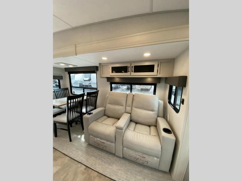 Are you wanting to trade out your busy work weeks for relaxing vacations? This fifth wheel can give you just that! Once you arrive at your destination, set up the 16' power awning with LED lights and enjoy some fresh air before you unpack your bags. The chef can start lunch on the GE Profile 21" oven with a residential cooktop, and there is an island with two barstools if the little ones want to color while they wait on their food. This model also includes a large pantry plus extra counter space with overhead storage for dishes. Everyone can take turns cleaning up in the full bath that includes a spacious shower with a seat and a linen closet to keep clean towels close by. When it's time to call it a night, you'll enjoy the king bed slide out in the front bedroom, while your guests take the rear tri-fold hide-a-bed sofa!