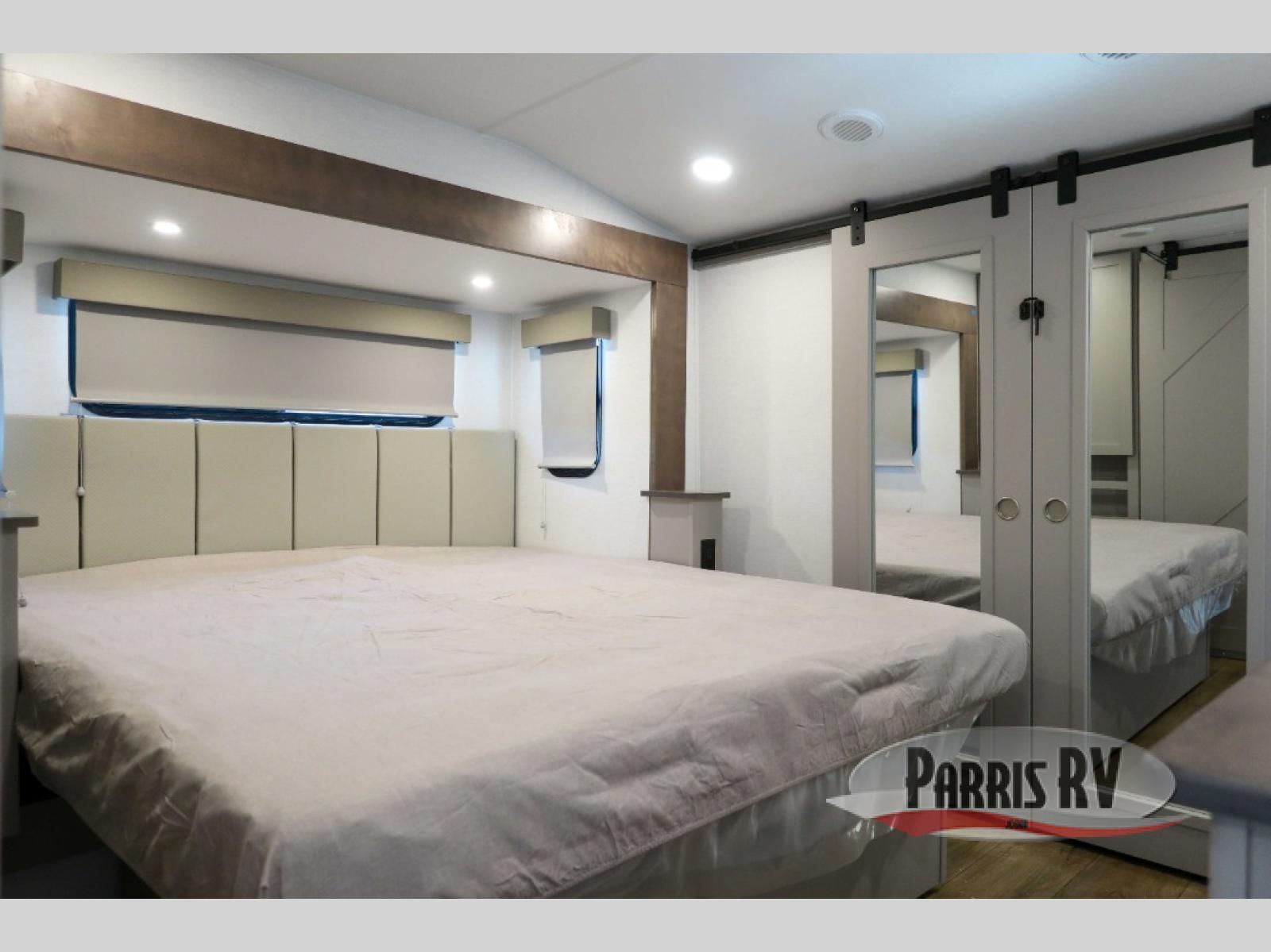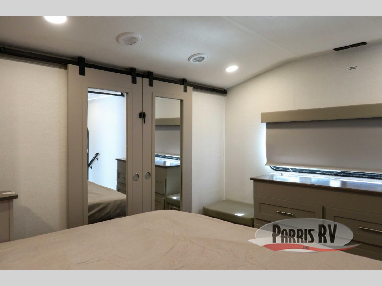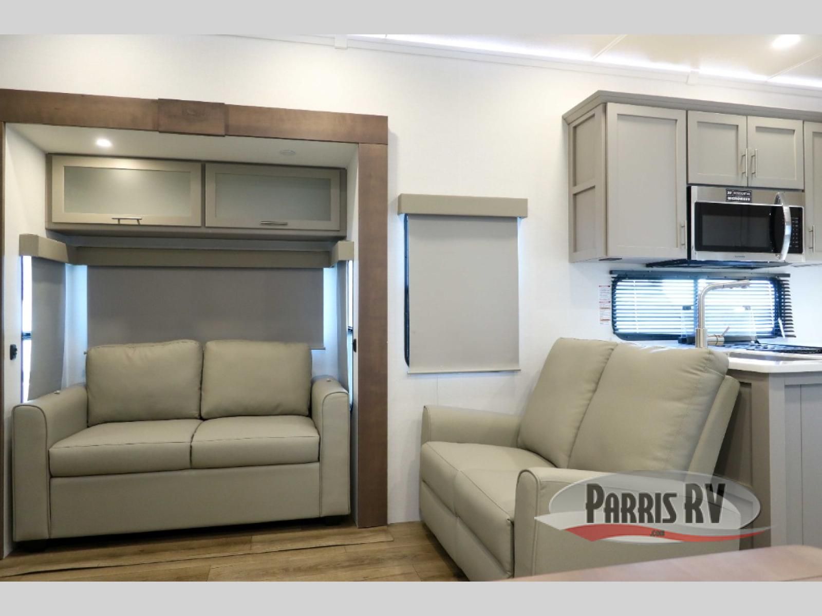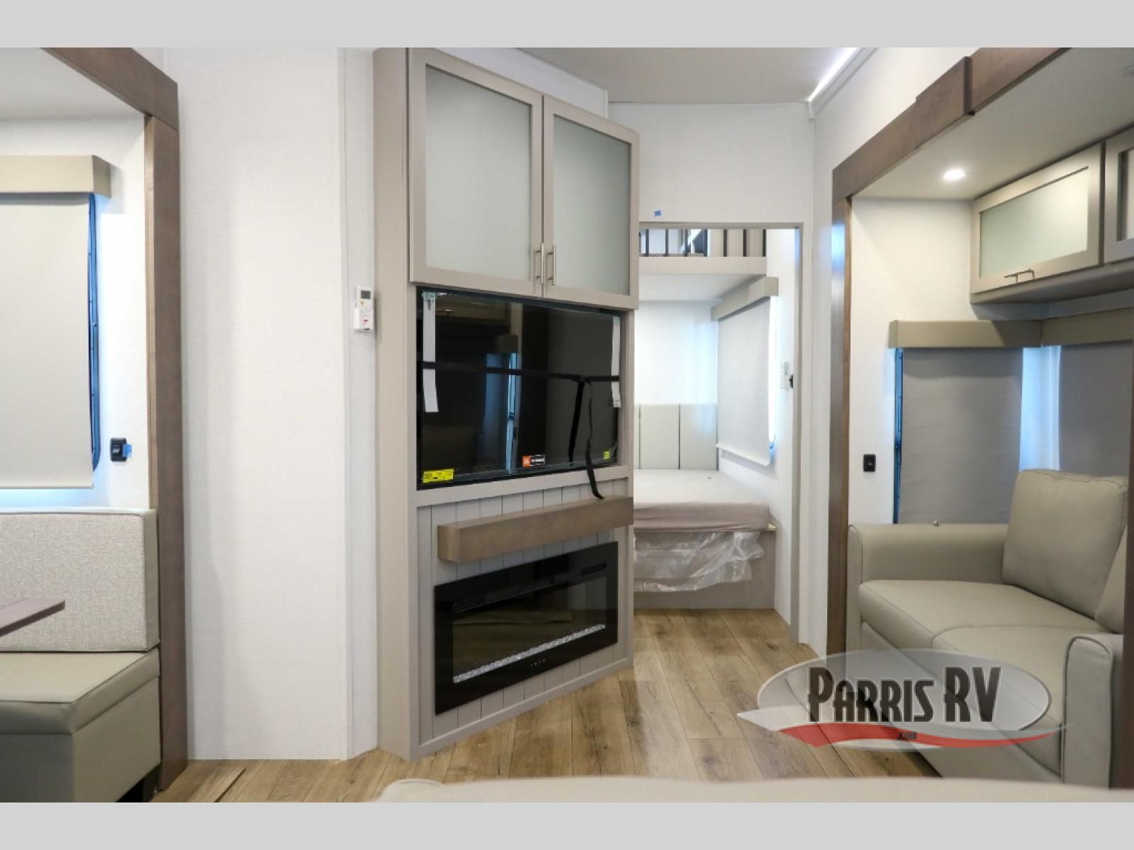 The whole gang can join in on the fun in this fifth wheel! The rear private 54" x 74" loft bed features a lower 60" x 70" bed beneath with storage and a TV, and its very own half bathroom with private entry/exit to the outside. There is also an exterior baggage door so you can easily pack gear straight into this room. The living area comes with dual recliner theater seating, a swing out 50" class HDTV, and a floating dinette table with two chairs and a movable ottoman with flip up storage. There is also a 16 cu. ft. 12 volt refrigerator and pull-out pantry here for food storage. And you can easily prepare your best home cooked meals using the three burner cooktop. When you're ready to wind down your night, head to the front private bedroom and relax on the queen bed slide which could be switched out for the optional king bed if you like! This unit also features an outdoor griddle and refrigerator under the loft space.