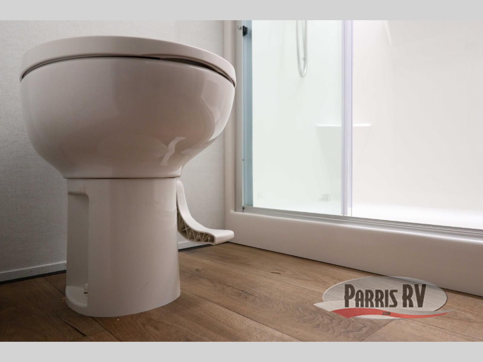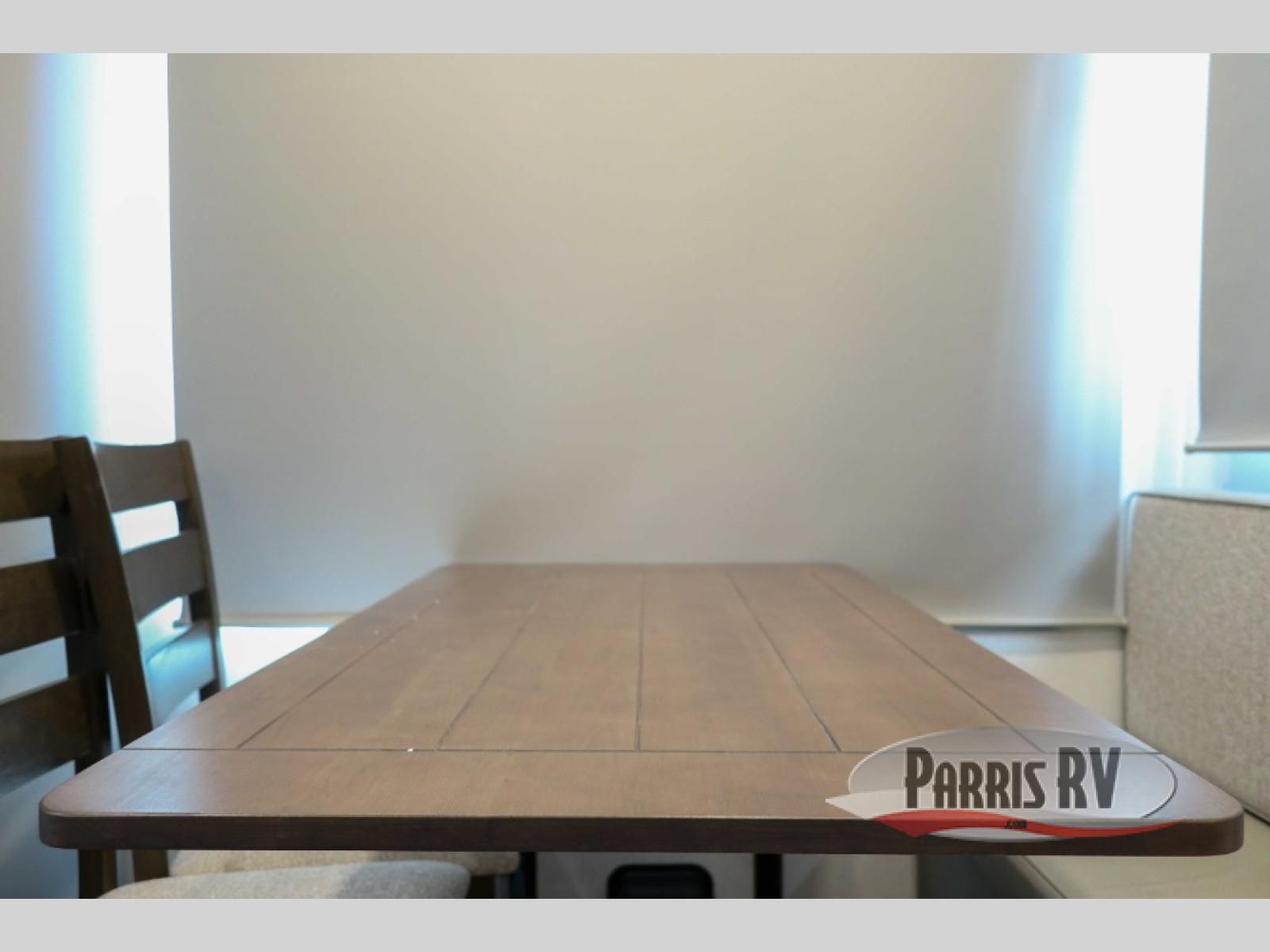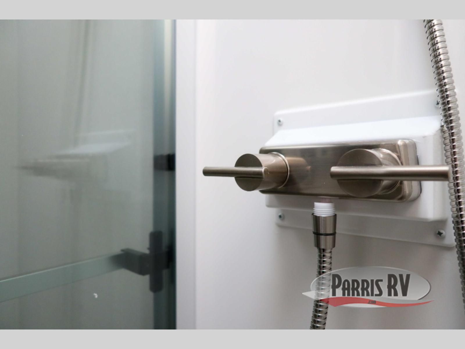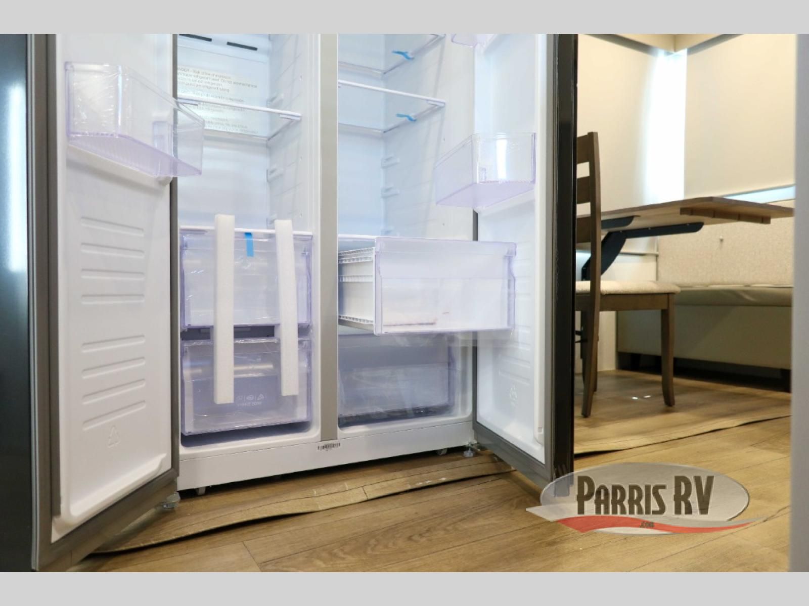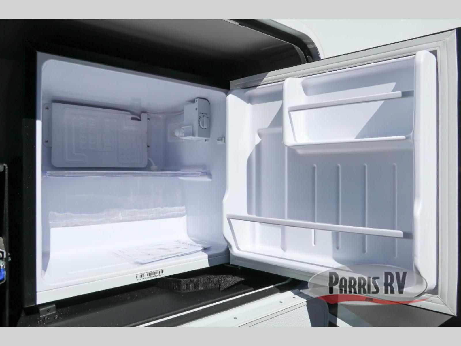 The whole gang can join in on the fun in this fifth wheel! The rear private 54" x 74" loft bed features a lower 60" x 70" bed beneath with storage and a TV, and its very own half bathroom with private entry/exit to the outside. There is also an exterior baggage door so you can easily pack gear straight into this room. The living area comes with dual recliner theater seating, a swing out 50" class HDTV, and a floating dinette table with two chairs and a movable ottoman with flip up storage. There is also a 16 cu. ft. 12 volt refrigerator and pull-out pantry here for food storage. And you can easily prepare your best home cooked meals using the three burner cooktop. When you're ready to wind down your night, head to the front private bedroom and relax on the queen bed slide which could be switched out for the optional king bed if you like! This unit also features an outdoor griddle and refrigerator under the loft space.