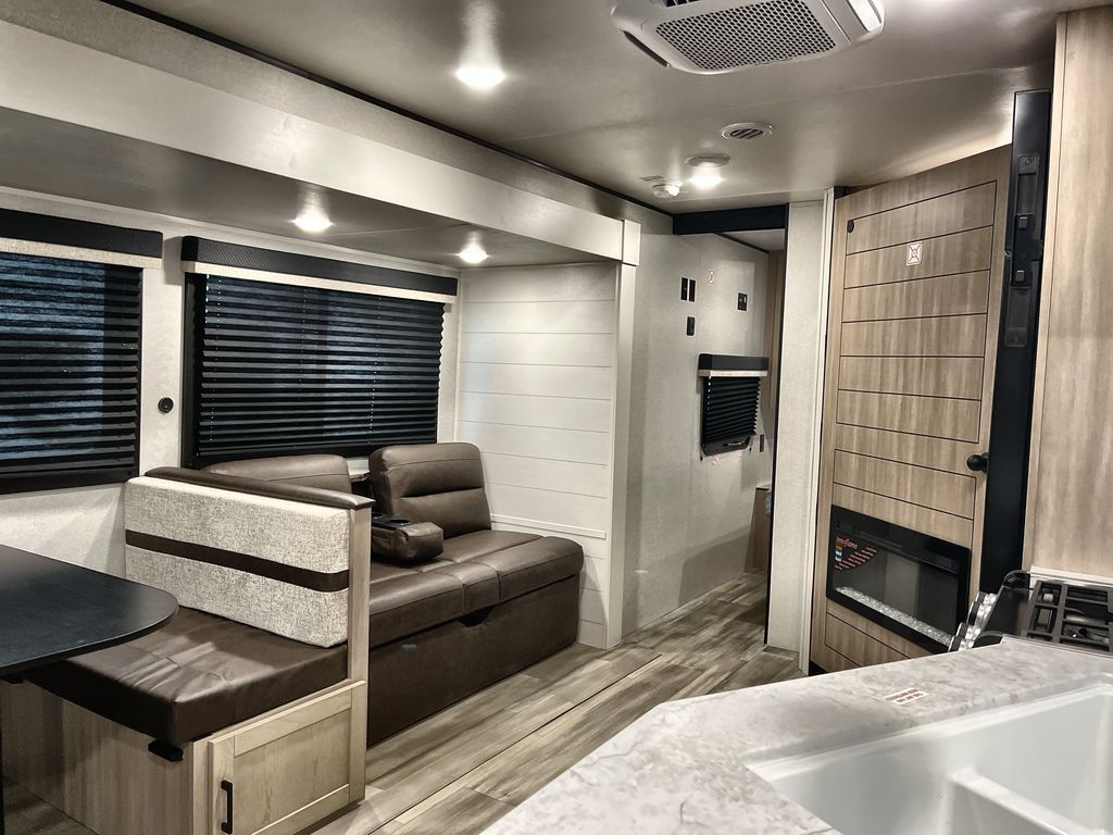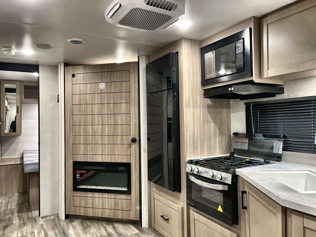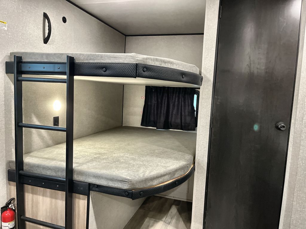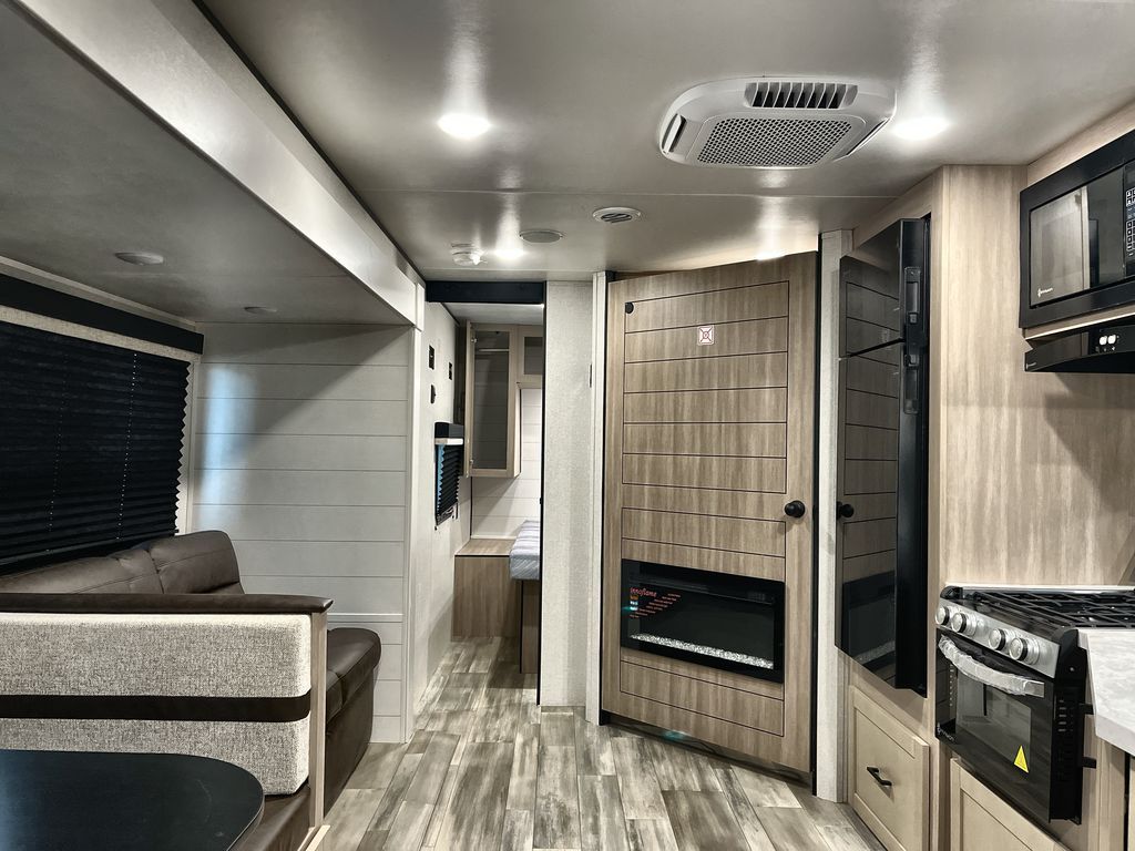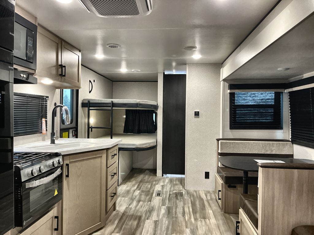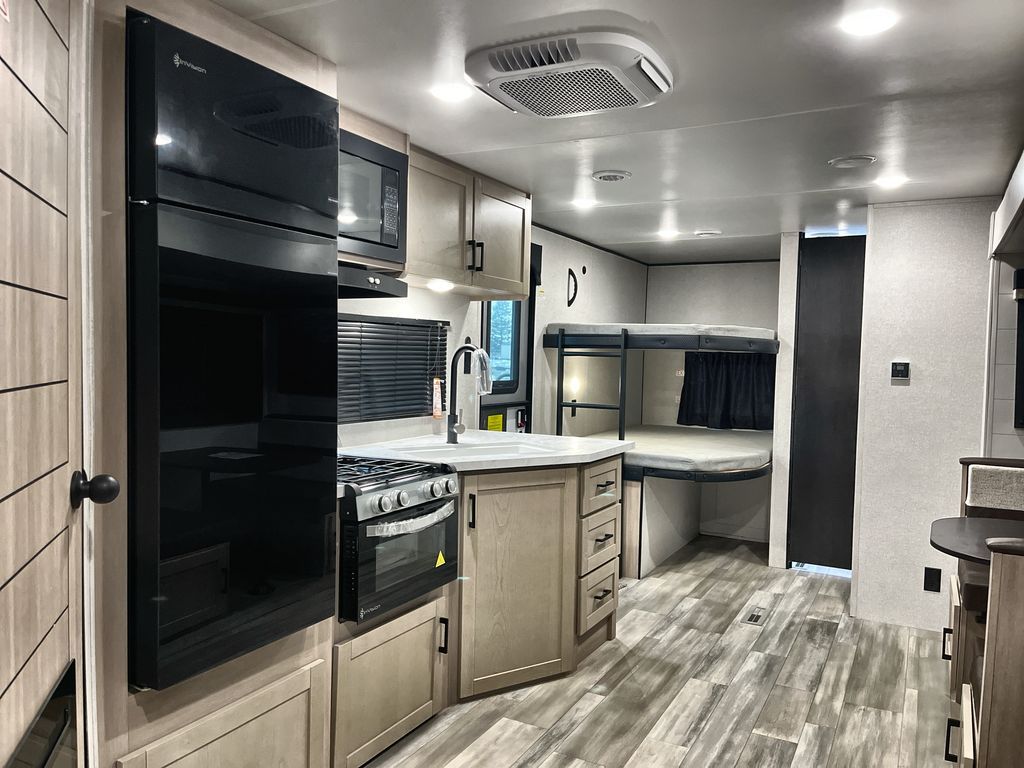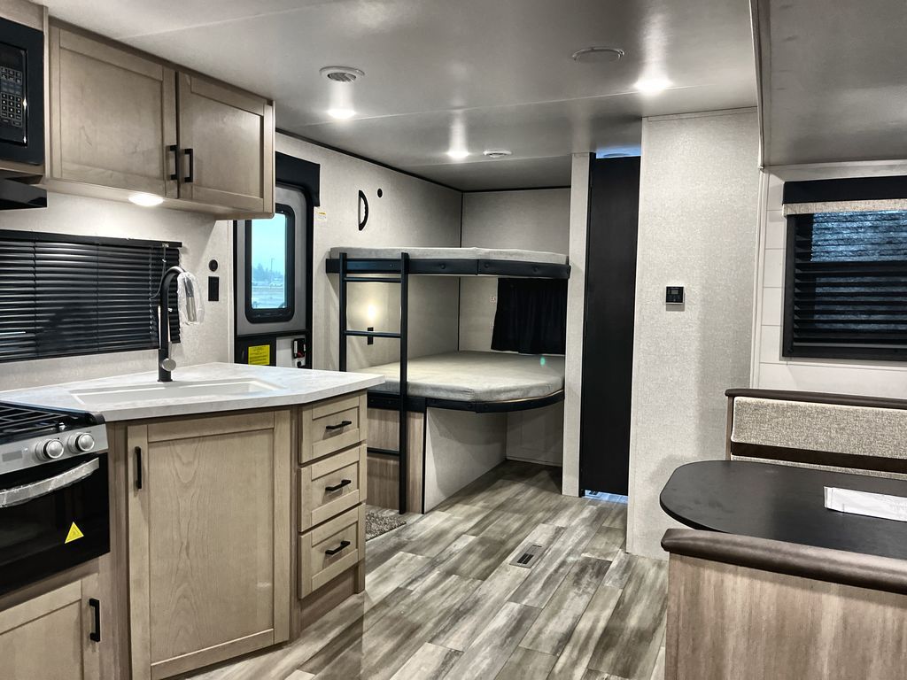 The whole gang will love weekends in the woods with this travel trailer in tow! There is a large slide out for added space, and here you'll find the jack-knife sofa and booth dinette. There is also an entertainment center with a fireplace with a hidden pantry behind, along with storage shelves for snacks, board games and more! You can claim the front private bedroom to yourselves, while your guests or little ones take the double-size bunks. A full kitchen is complete with a three-burner cooktop and microwave oven to make meals each day, plus a 12V refrigerator and pantry for food storage. This unit also includes an outdoor kitchen with a refrigerator to keep cold drinks ready to enjoy!
