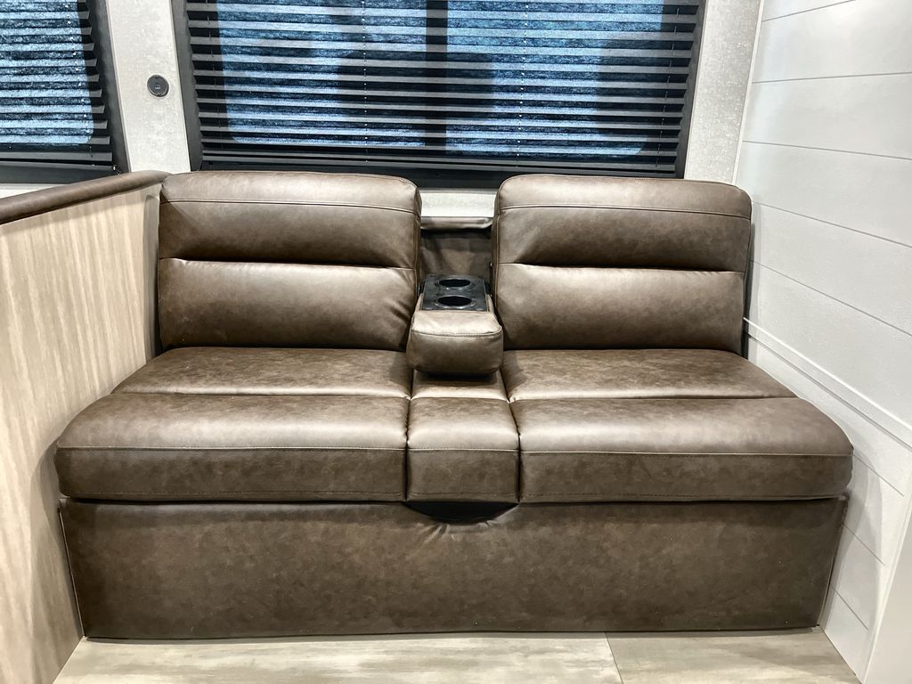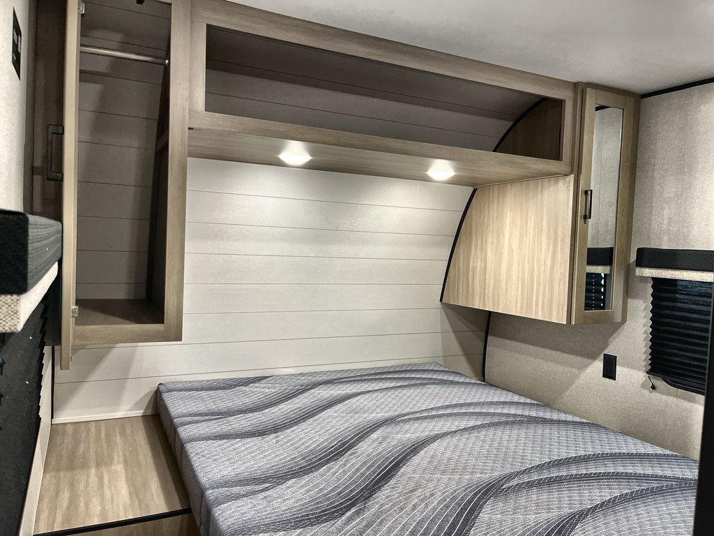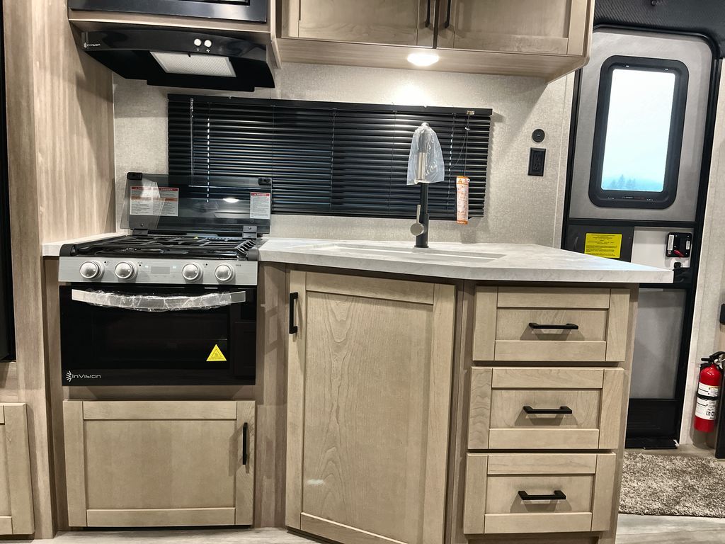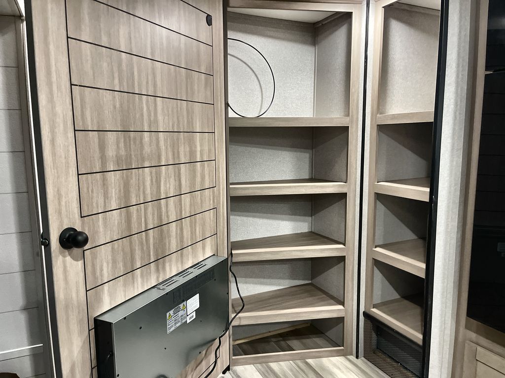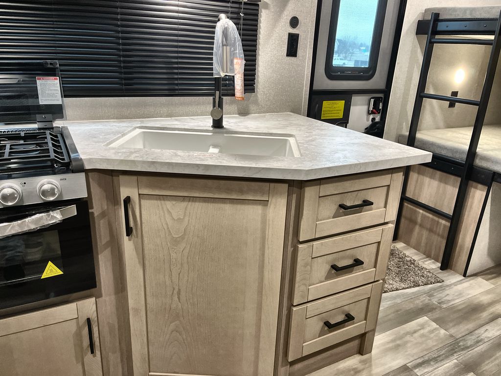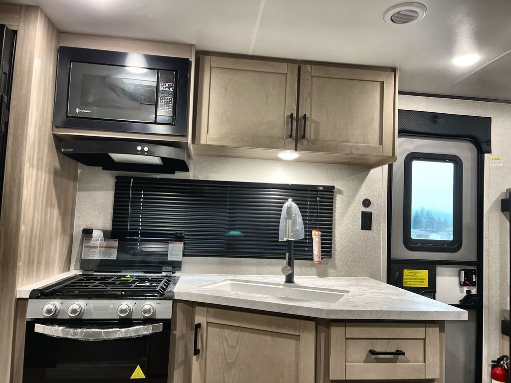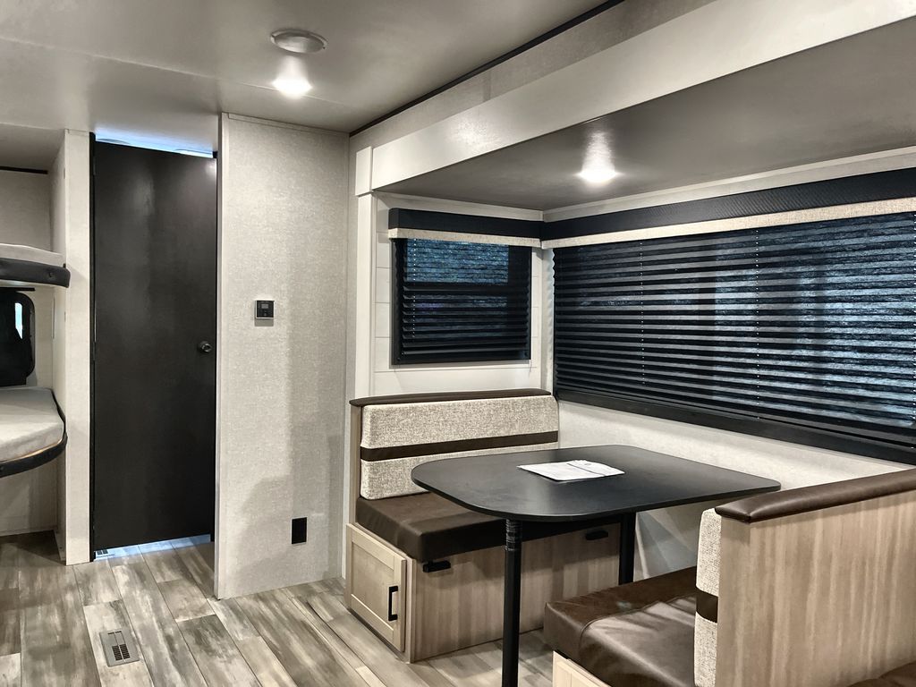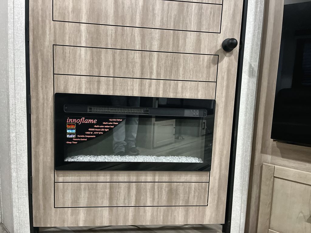 The whole gang will love weekends in the woods with this travel trailer in tow! There is a large slide out for added space, and here you'll find the jack-knife sofa and booth dinette. There is also an entertainment center with a fireplace with a hidden pantry behind, along with storage shelves for snacks, board games and more! You can claim the front private bedroom to yourselves, while your guests or little ones take the double-size bunks. A full kitchen is complete with a three-burner cooktop and microwave oven to make meals each day, plus a 12V refrigerator and pantry for food storage. This unit also includes an outdoor kitchen with a refrigerator to keep cold drinks ready to enjoy!