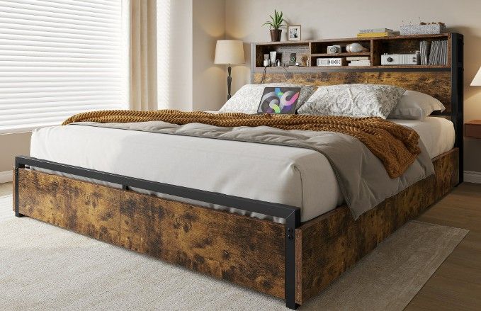 VenmoNew - EnHomee Queen Bed Frame w/ 6 Storage Drawers w/ Headboard & Charging Station, No Noise, Vintage Brown. Still in the Box!