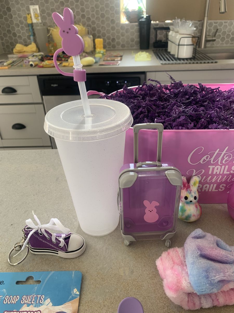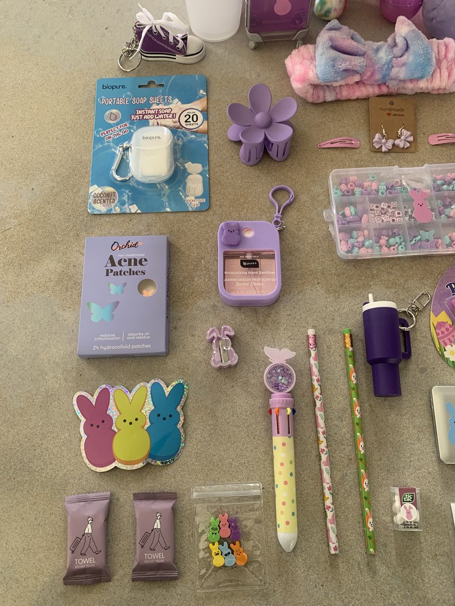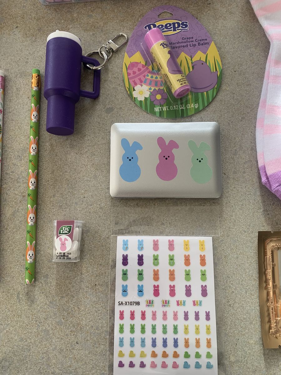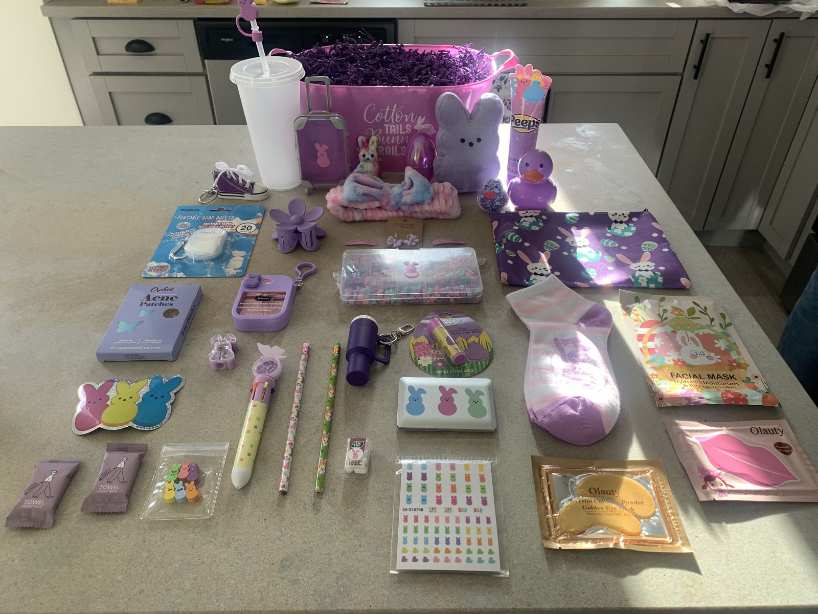 ApplePayPurple Easter basket Travel towels Peeps vinyl sticker to put on cup etc. Cup with snap lid and Peeps straw topper Acne patches Mini converse keychain Travel soap sheets Hair clip Hair barrettes Spa headband Mini rolling luggage Peeps squishy Bracelet kit Pen Pencils Bunny pencil sharpener Mini Stanley keychain to hold chapstick Peeps chapstick Mini laptop mirror Peeps nail stickers Peeps socks Eye mask Lip mask Facial mask Make up bag Plastic duck Easter egg Rubber duck 6 inch plush Peeps Plastic easter egg Bow earrings Peeps bubble bath Basket, bow, tag and cellophane wrap Delivery available