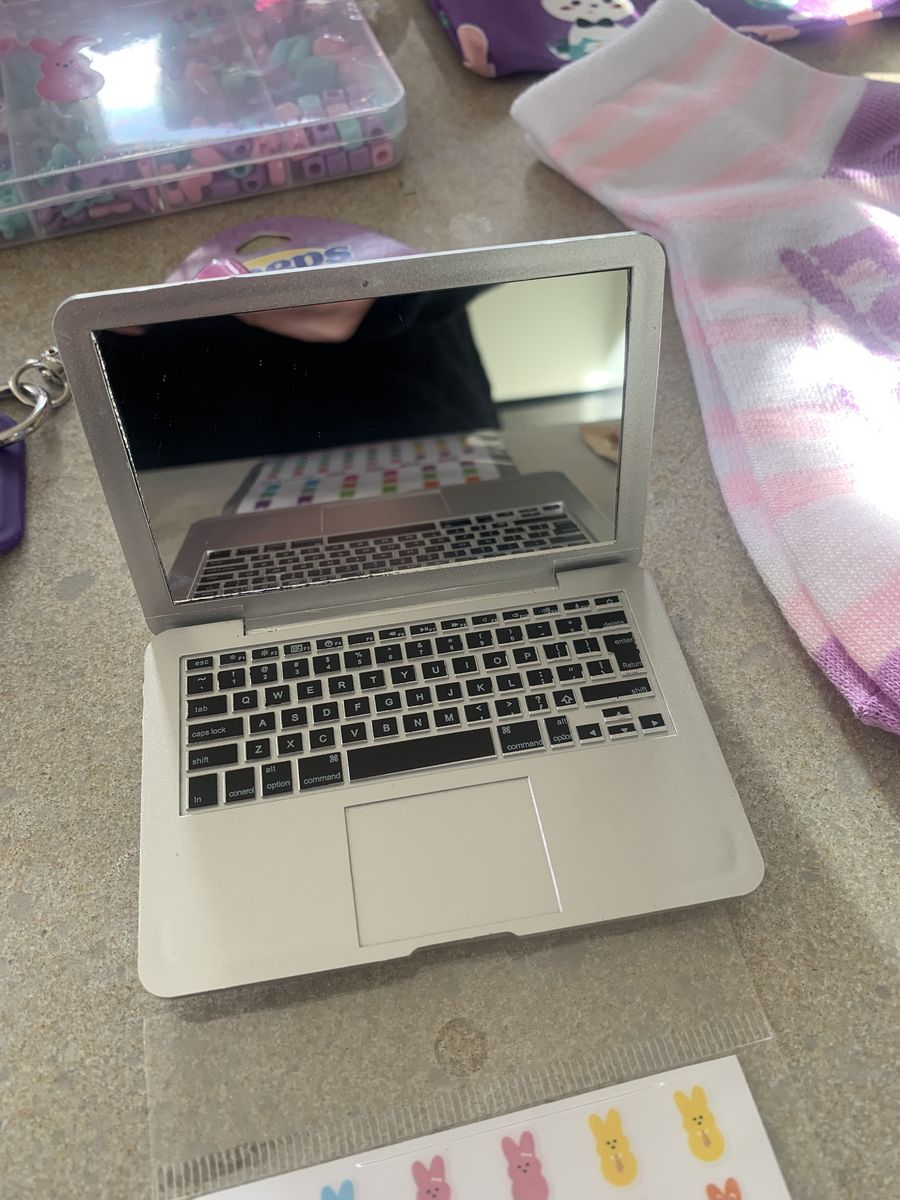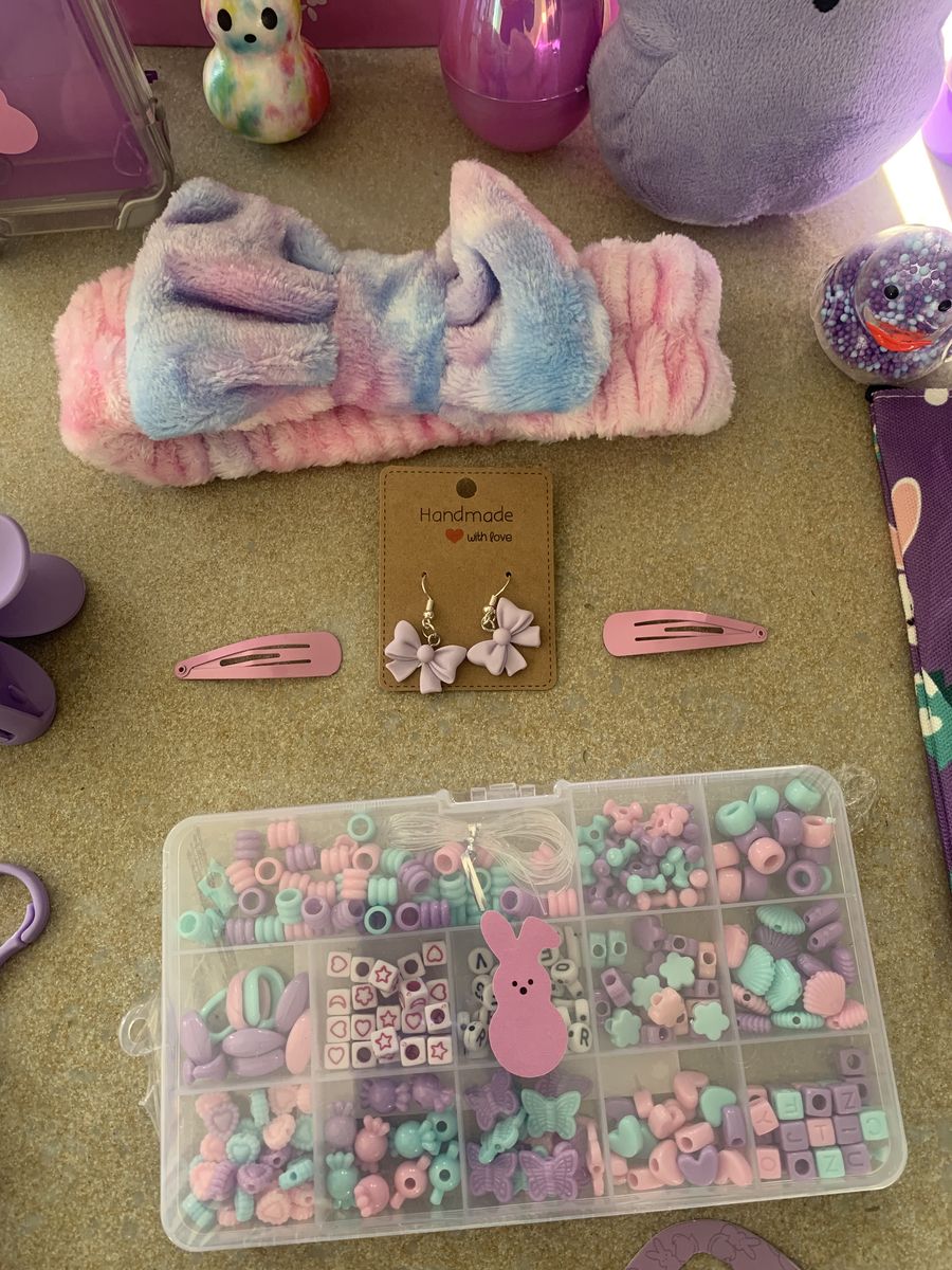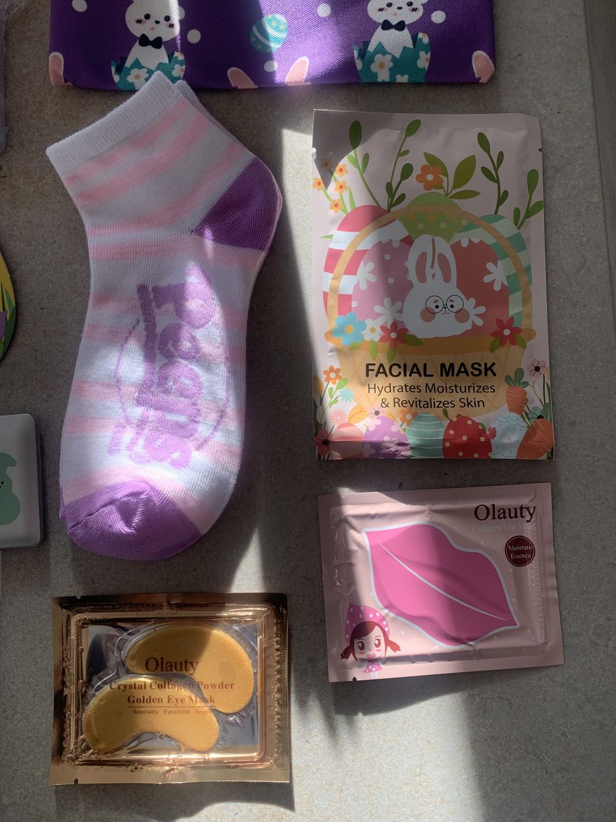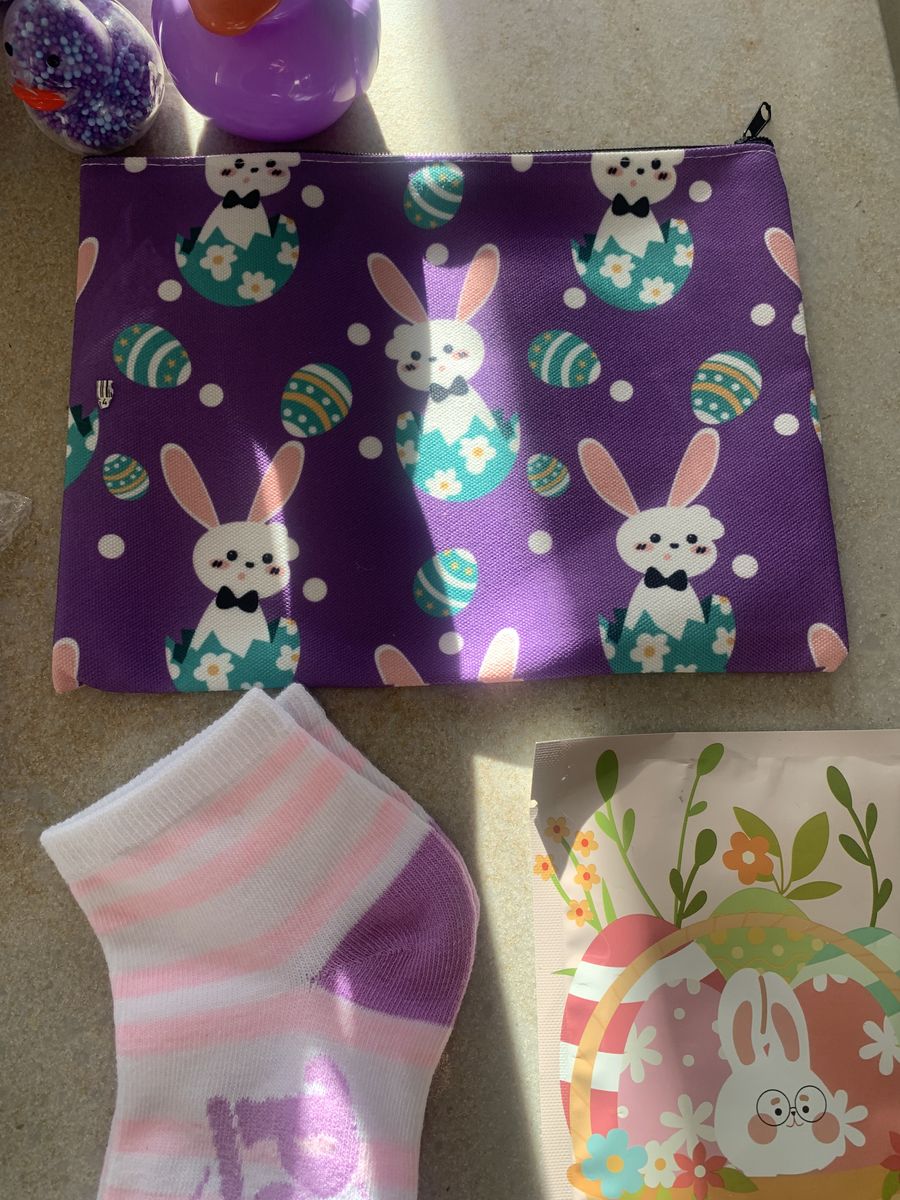 ApplePayPurple Easter basket Travel towels Peeps vinyl sticker to put on cup etc. Cup with snap lid and Peeps straw topper Acne patches Mini converse keychain Travel soap sheets Hair clip Hair barrettes Spa headband Mini rolling luggage Peeps squishy Bracelet kit Pen Pencils Bunny pencil sharpener Mini Stanley keychain to hold chapstick Peeps chapstick Mini laptop mirror Peeps nail stickers Peeps socks Eye mask Lip mask Facial mask Make up bag Plastic duck Easter egg Rubber duck 6 inch plush Peeps Plastic easter egg Bow earrings Peeps bubble bath Basket, bow, tag and cellophane wrap Delivery available