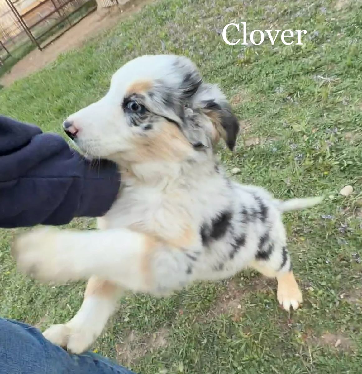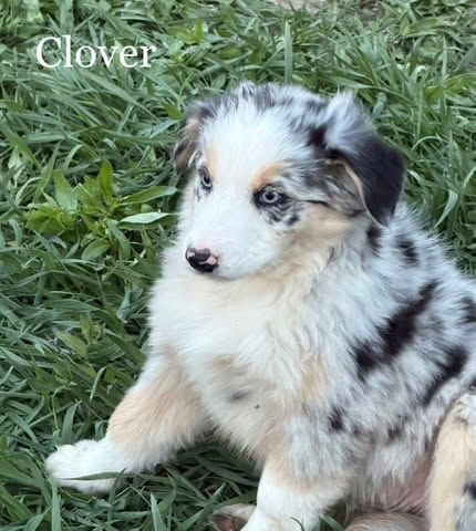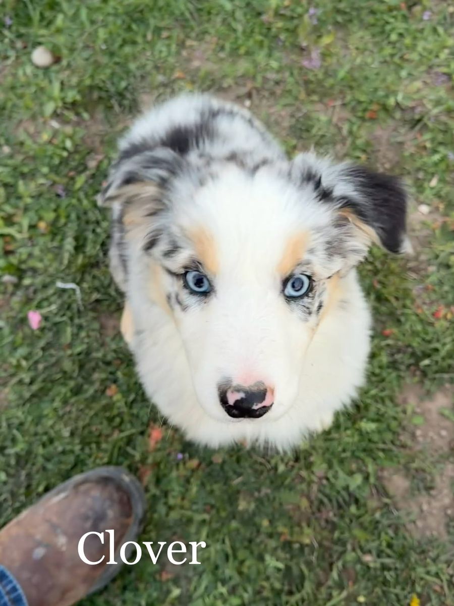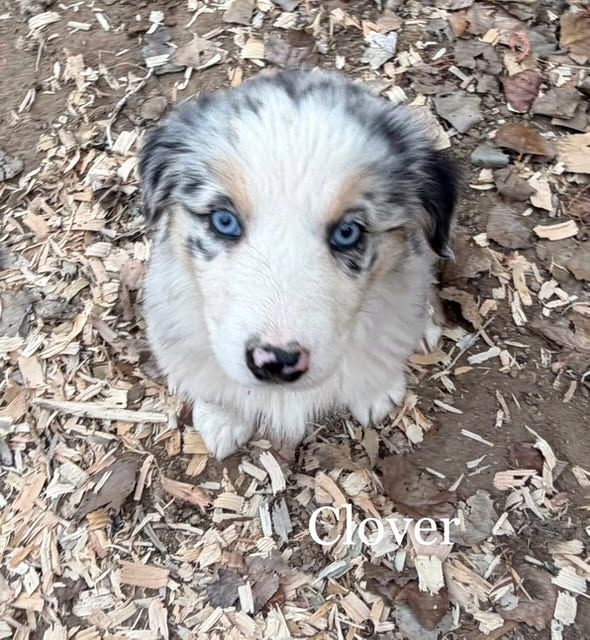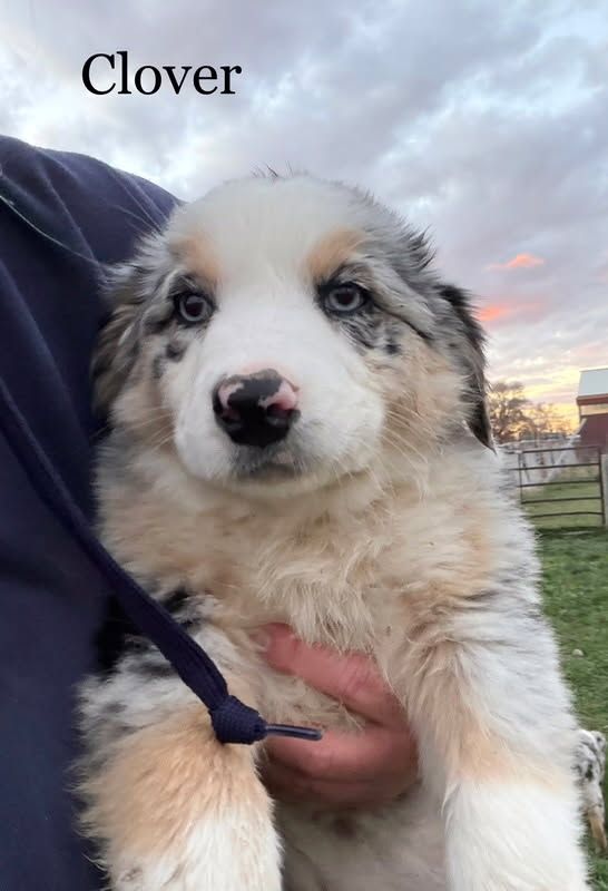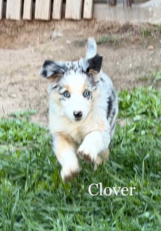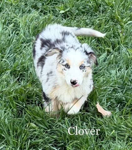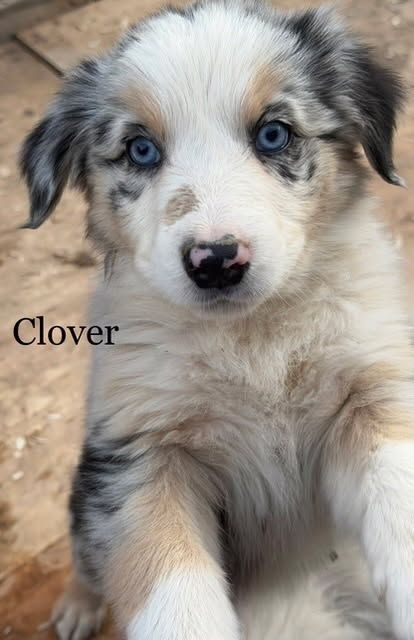 Clover - Blue Merle Female with 2 blue eyes $1,750 - smart enough to do your taxes, always thinking, very awake, very aware, very human connected. Excellent therapy dog prospect.
