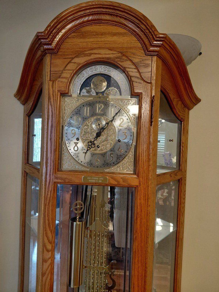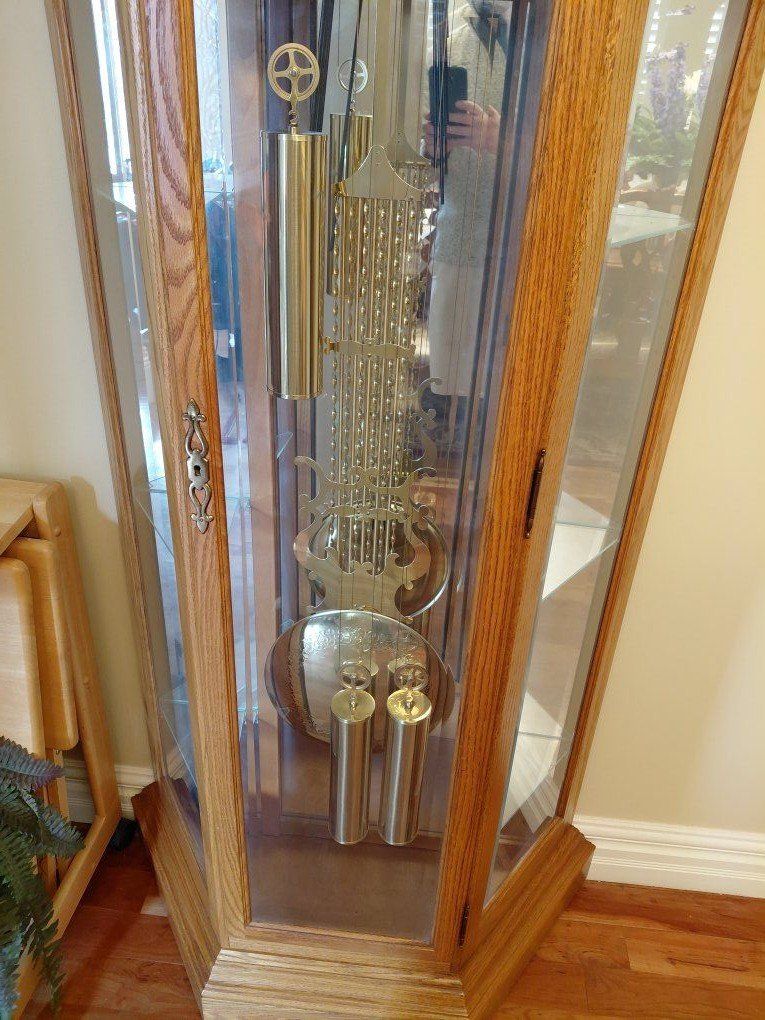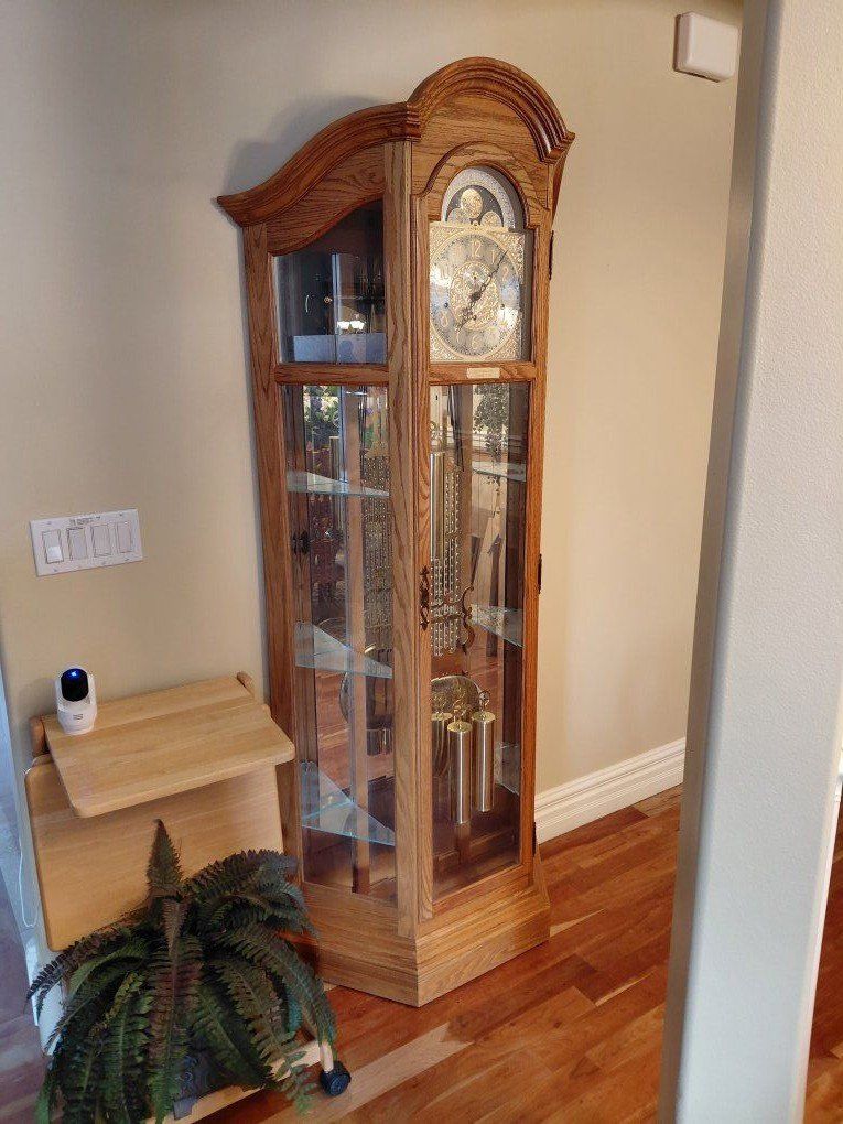 VenmoBeautiful solid oak grandfather clock with a classic design and elegant glass cabinet. This clock features a polished brass dial, decorative moon phase display, and a traditional Westminster chime that adds timeless charm to any home. The glass panels allow you to see the detailed pendulum and weights in motion. The clock keeps time well and makes a stunning statement piece for an entryway, living room, or office. Features: • Solid oak cabinet with curved bonnet top • Westminster chime • Moon phase dial • Brass pendulum and weights • Glass side panels to view the movement • Classic heirloom-style design This clock has been well cared for and is in very good condition. Pickup required due to size and weight. Message if you have questions or would like to come see it.