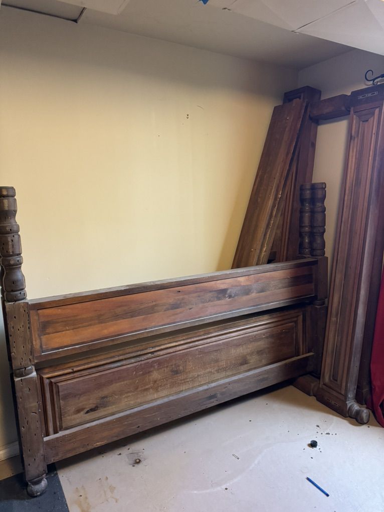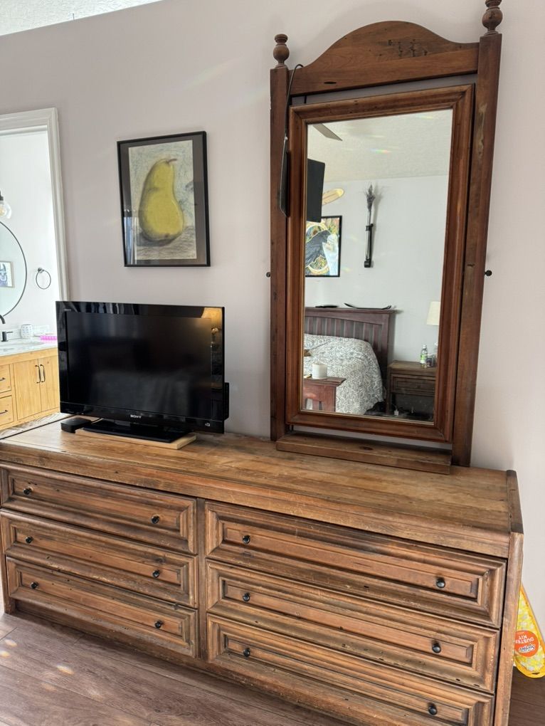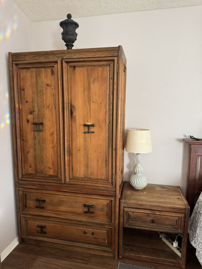VenmoSolid worm wood bedroom Vanity w mirror, large armoire, 2 side tables w drawer and four post bed frame