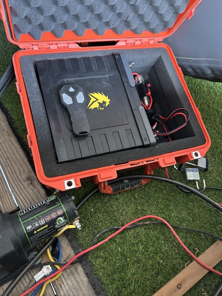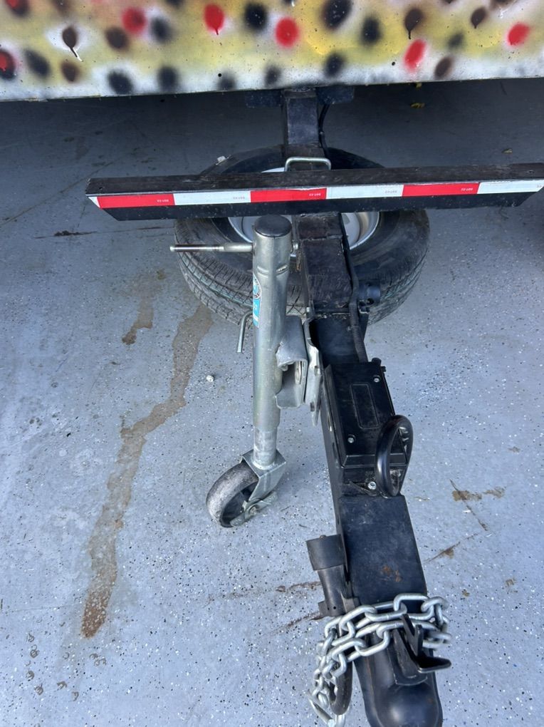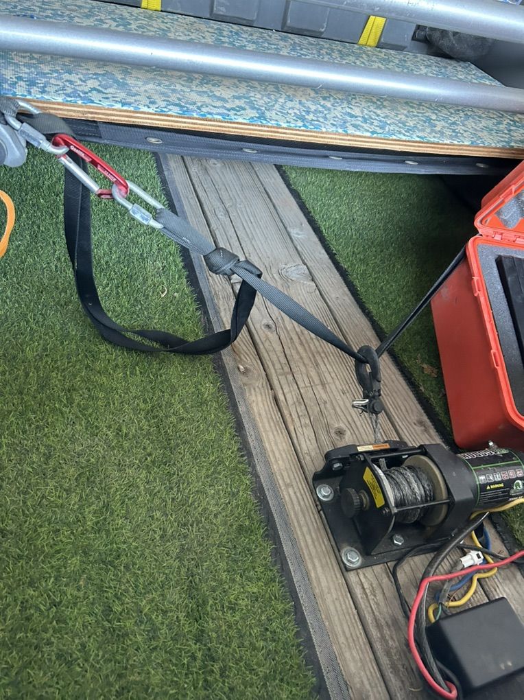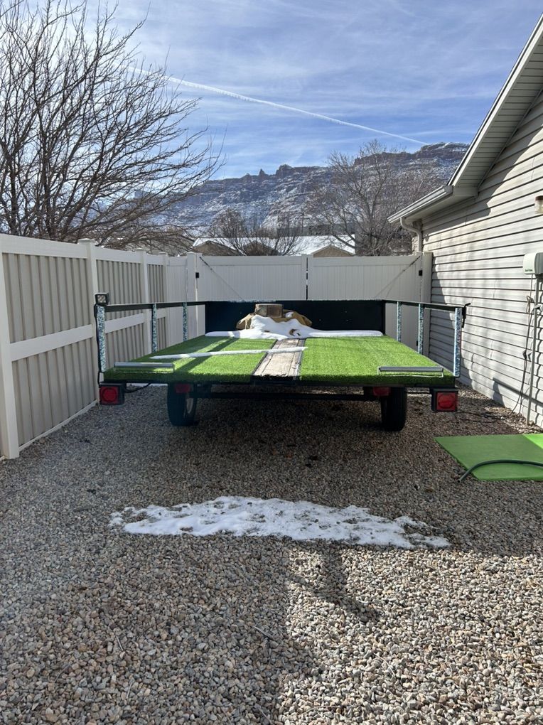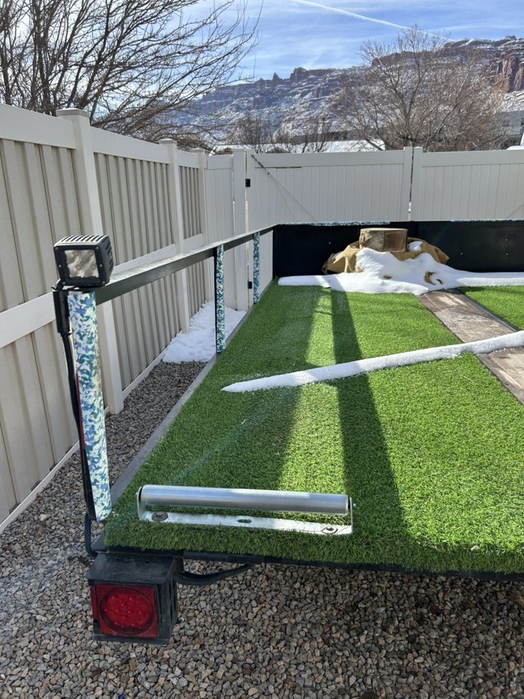 Venmo14’ x 8’ slick deck boat trailer. It has a remote control winch system which made solo loading easy for me. It has an expensive lithium battery that is stored in a waterproof container. There are rollers on the back and a flood light for those nighttime take outs. It has a high profile for the remote areas. Tires have a ton of tread.