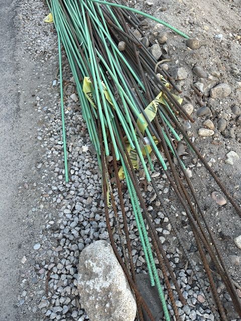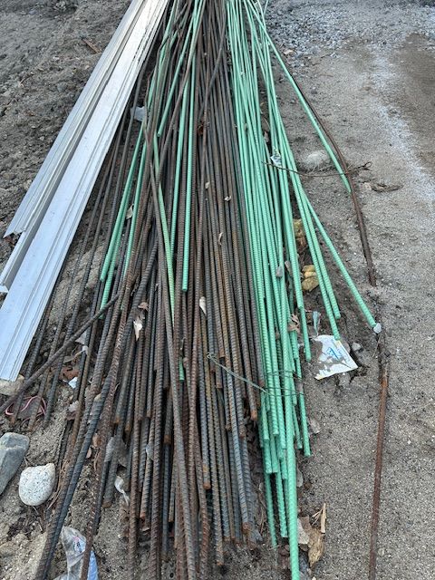 Rebar - approximately 100 pieces, 20 feet in length. Some are coated with the green epoxy coating (corrosion resistance). Most are regular rebar.