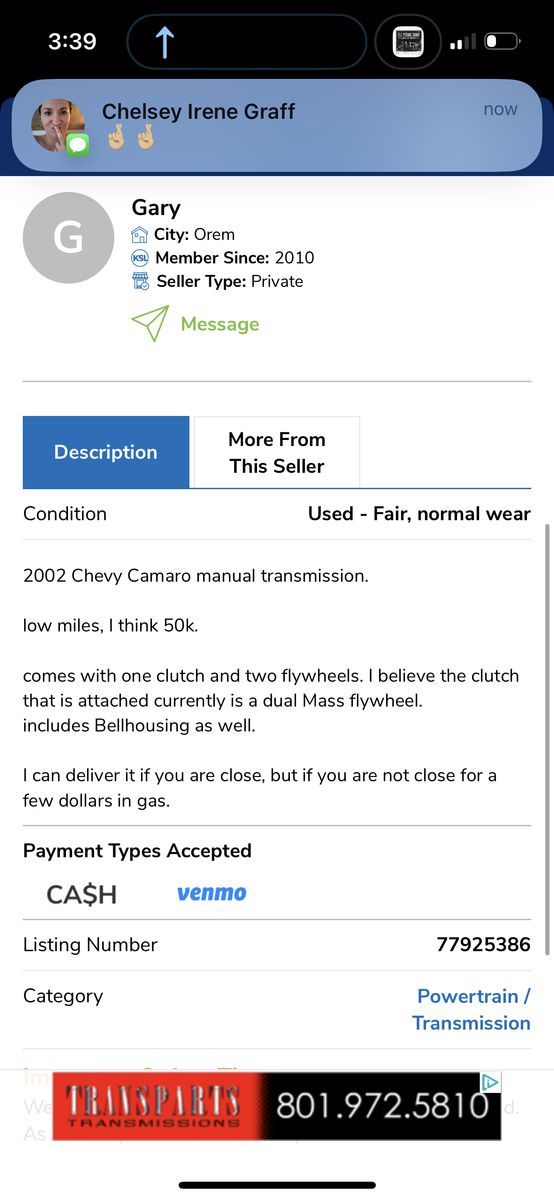 “Condition Used - Fair, normal wear 2002 Chevy Camaro manual transmission. low miles, I think 50k. comes with one clutch and two flywheels. I believe the clutch that is attached currently is a dual Mass flywheel. includes Bellhousing”
