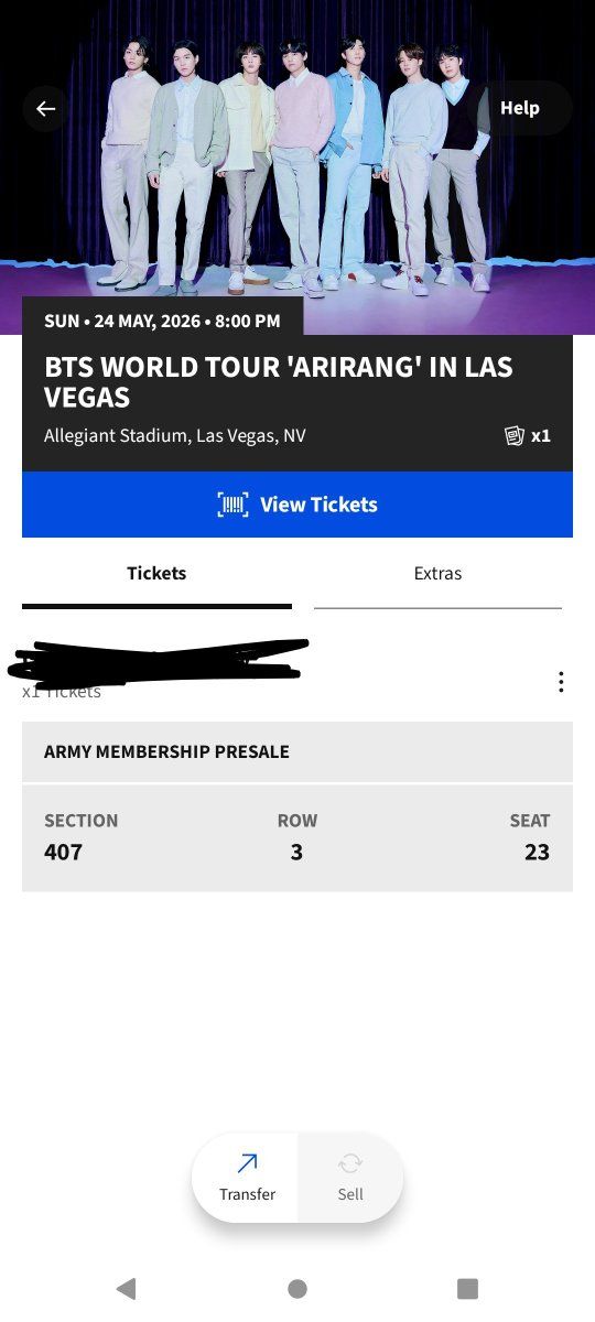 VenmoTICKET FOR BTS ARIRANG WORLD TOUR in LAS VEGAS Sun MAY 24th Section 407 row 3 seat 23- $100!
