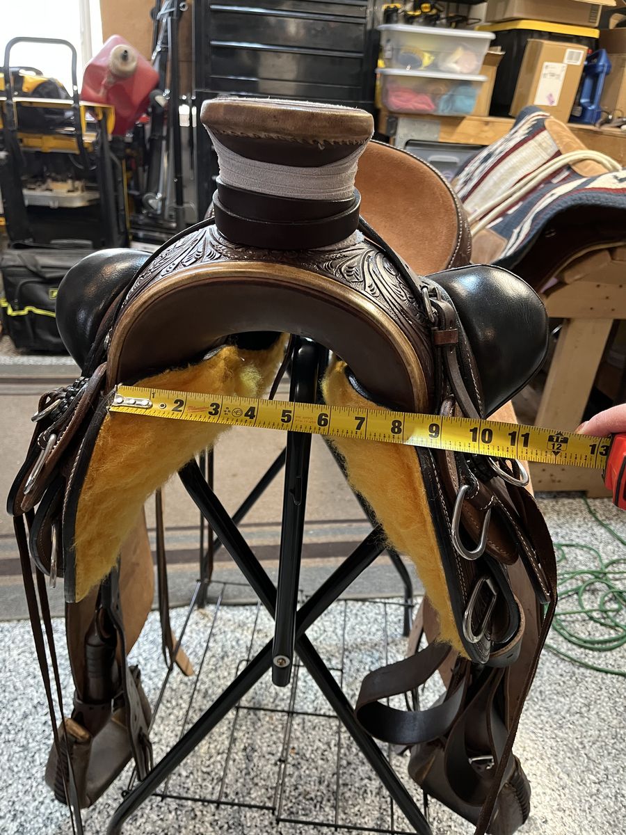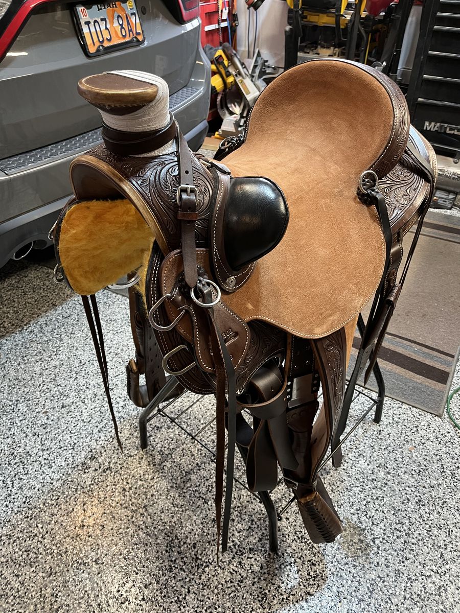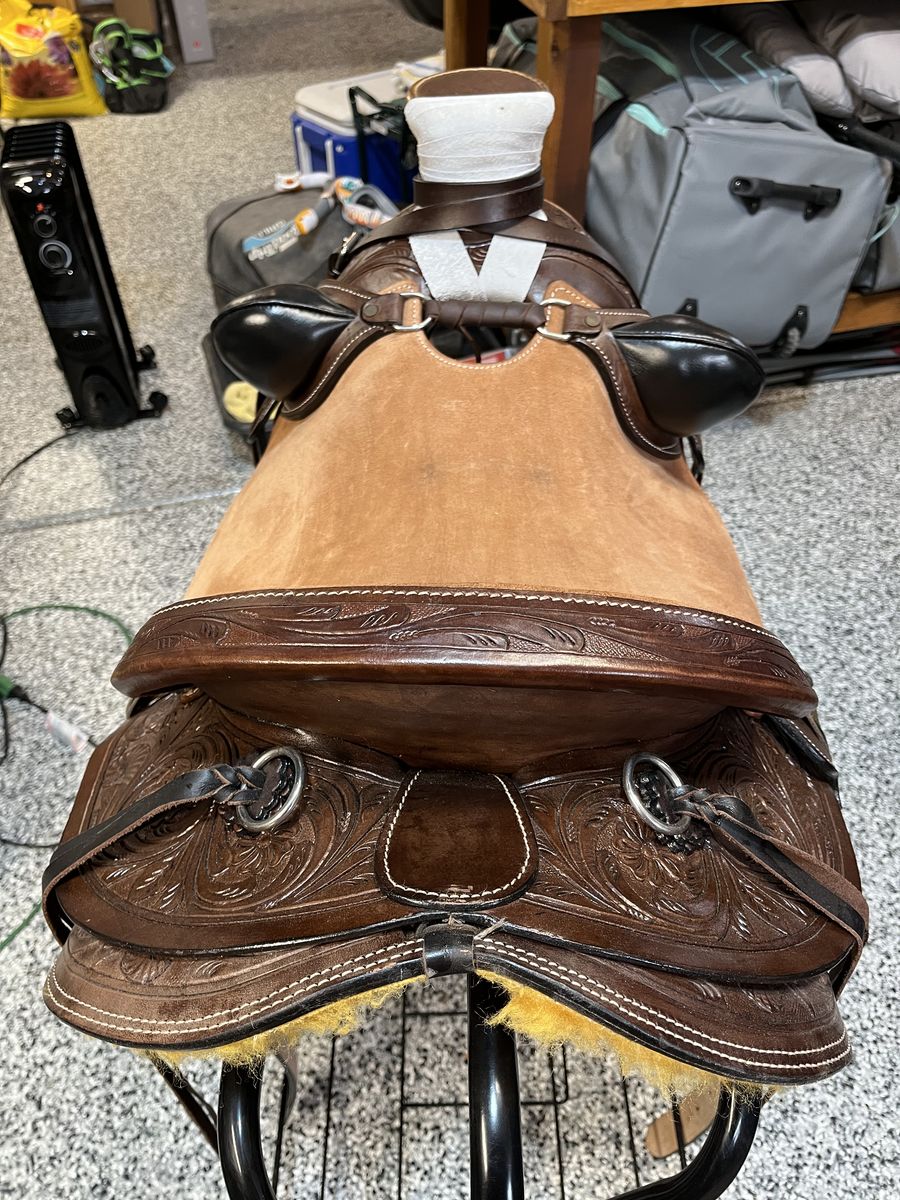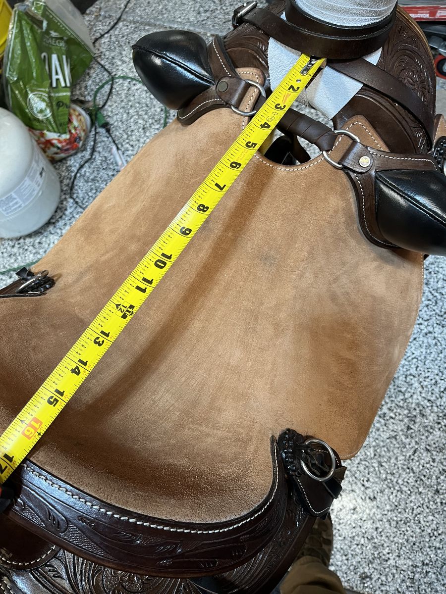 VenmoThis is a brand new, only been thrown on my horse to test the fit. It fit great on the withers, but unfortunately just a tad too narrow for my friesian’s wide back. It’s a 16” rough out seat with full quarter horse bars. Comes with matching breast collar. I paid $900, asking $800.