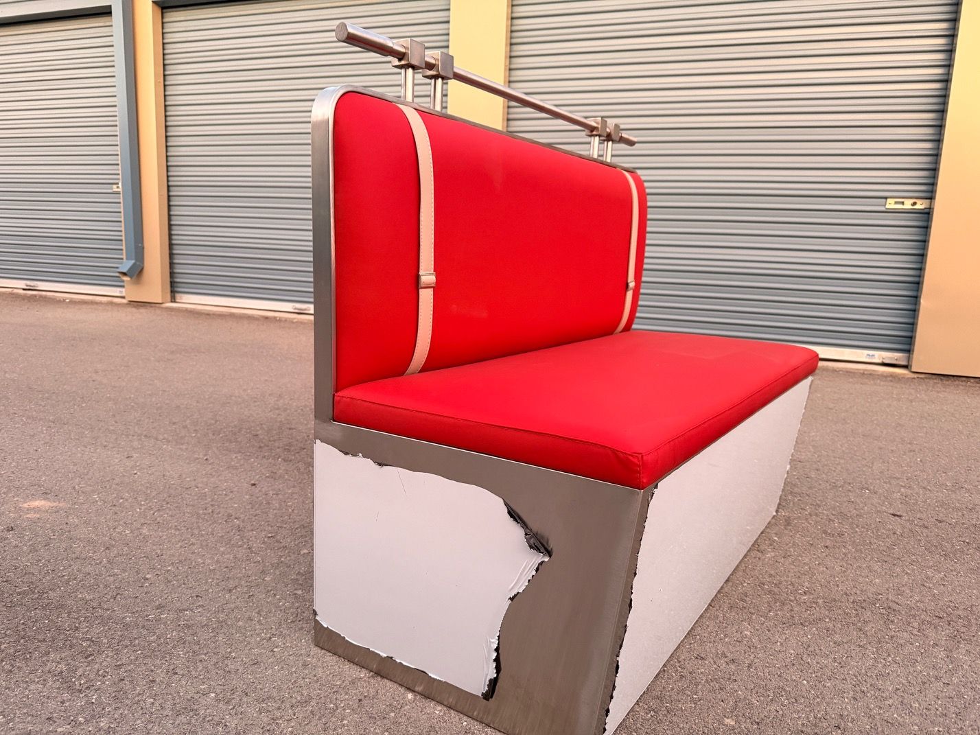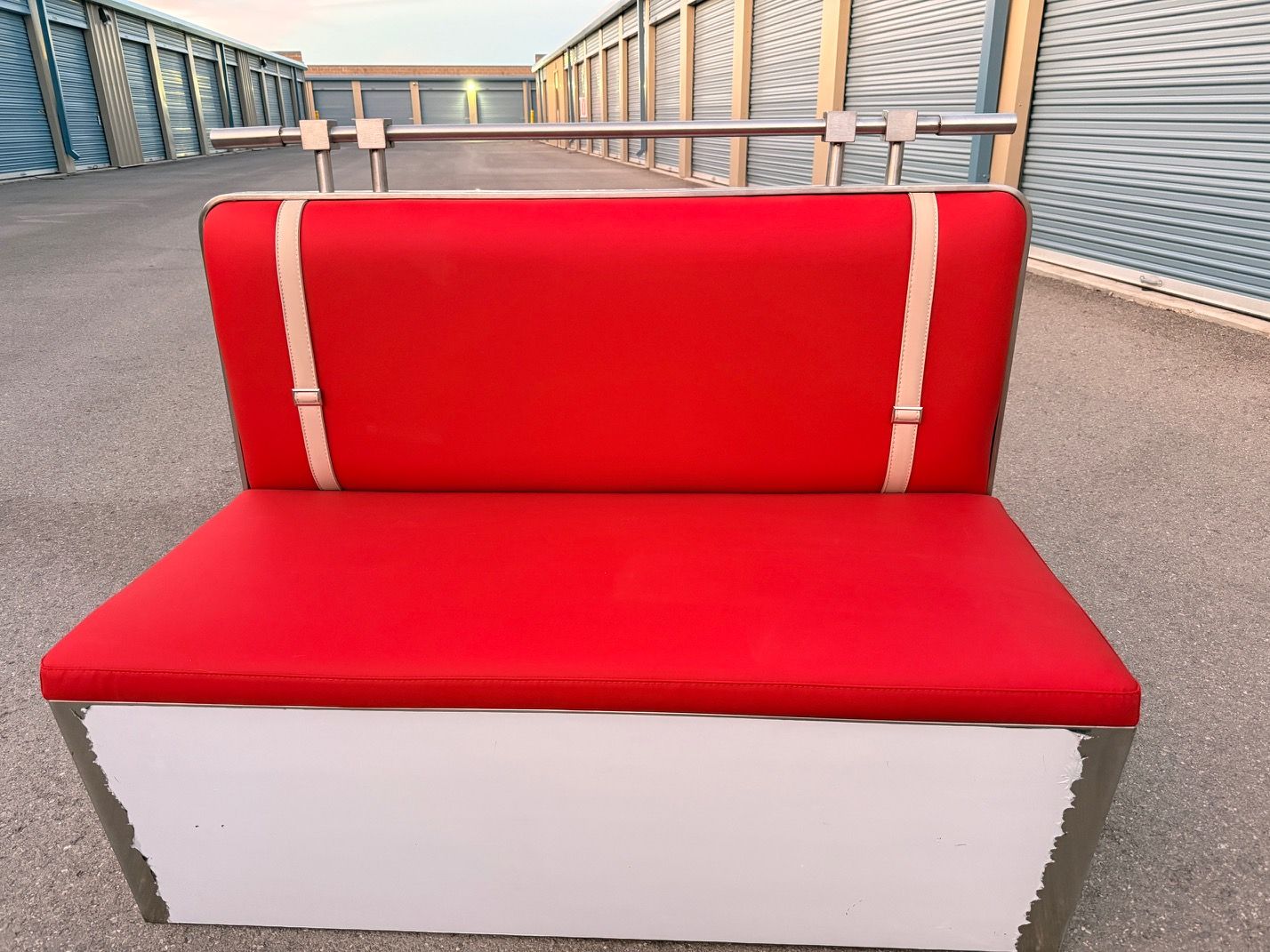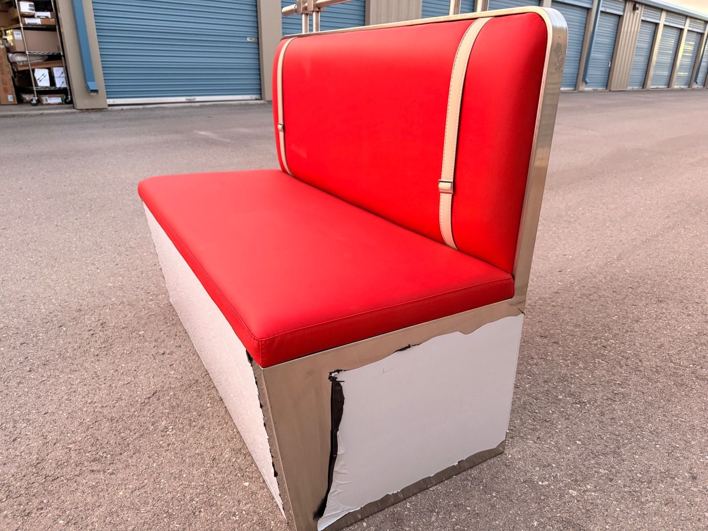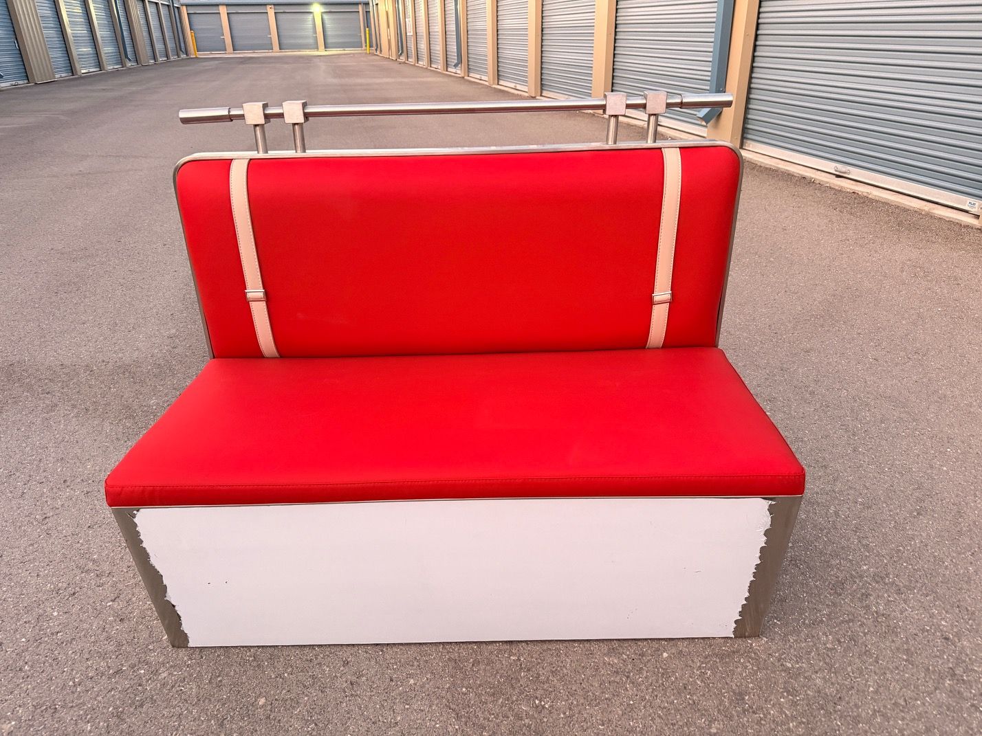 Add classic diner charm to your space with this eye-catching retro red booth bench seat. Featuring vibrant red upholstery and vintage-style beige accent straps, this bench captures the timeless look of traditional American diners. The sturdy base provides solid support, while the polished stainless steel rail along the back adds a stylish and functional touch.