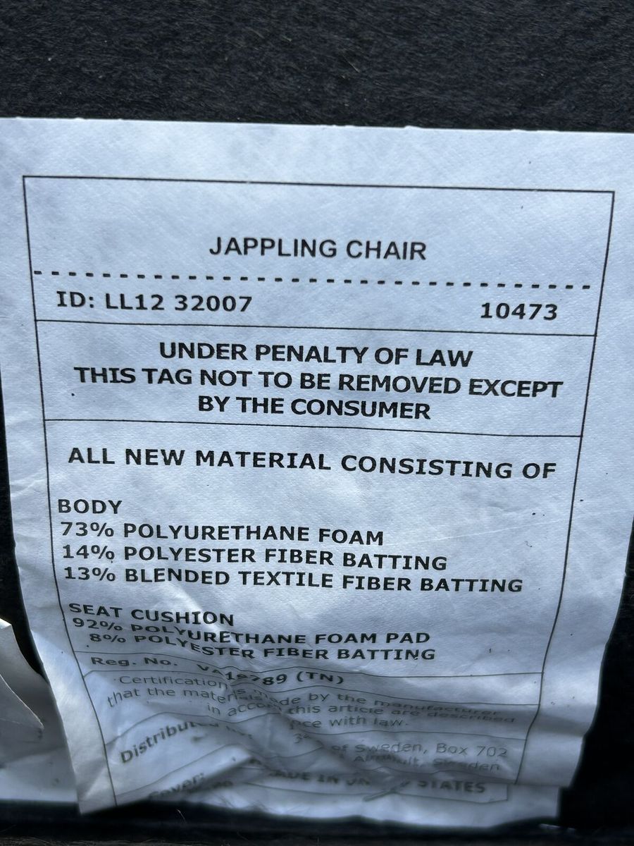 Comfortable and durable IKEA Jappling armchair in black faux leather. This model is discontinued and known for its clean, modern lines and deep, supportive seat.