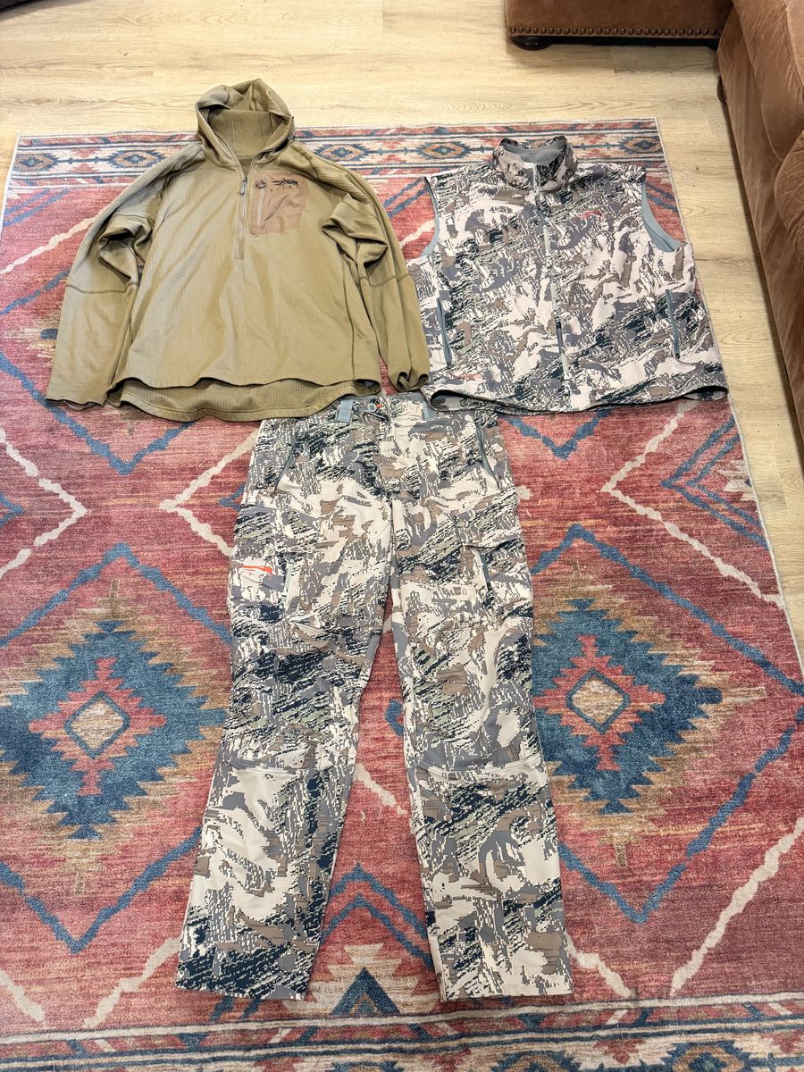 VenmoThis is a set of Sitka camo it’s a hoodie, vest, and pants. The heavyweight hoodie in solid tan XXL The mountain pants in subalpine 38 The mountain vest in subalpine XXL Ideally selling as a set but will sell individually