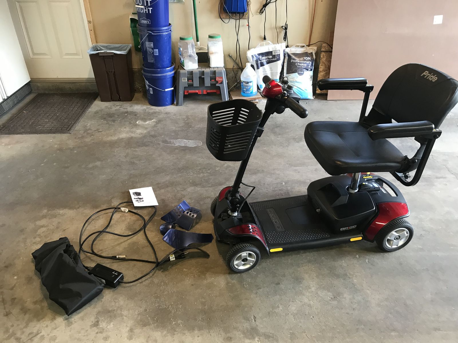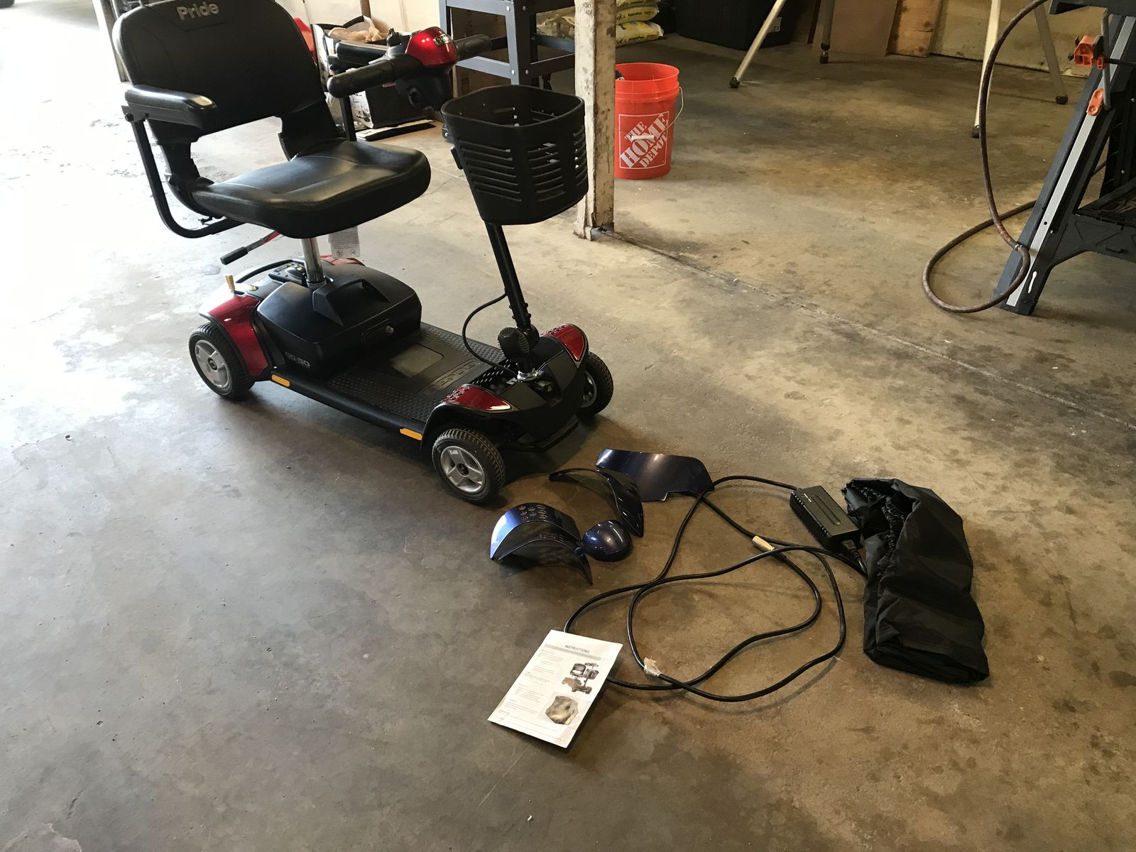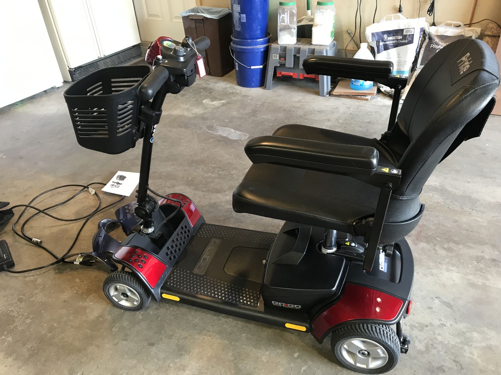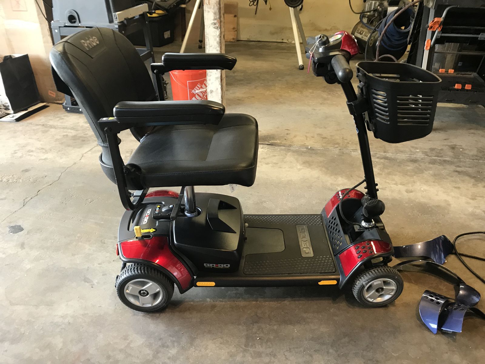 Pride GoGo Elite mobility scooter, this scooter is in brand new condition it comes with a battery charger snap on replacement parts to change scooter from red to blue and dust cover this scooter has barely been used works great and also runs great.