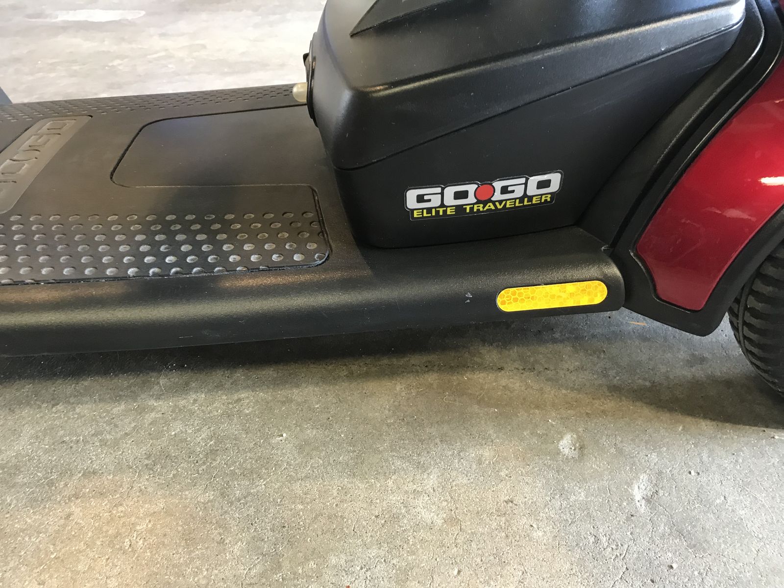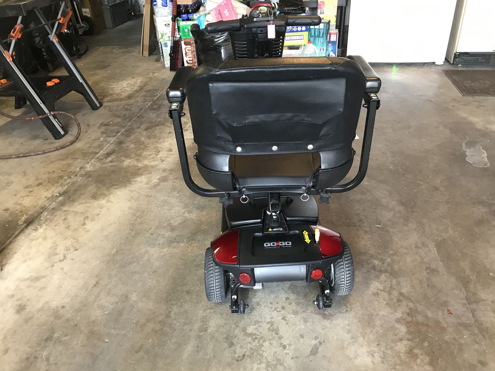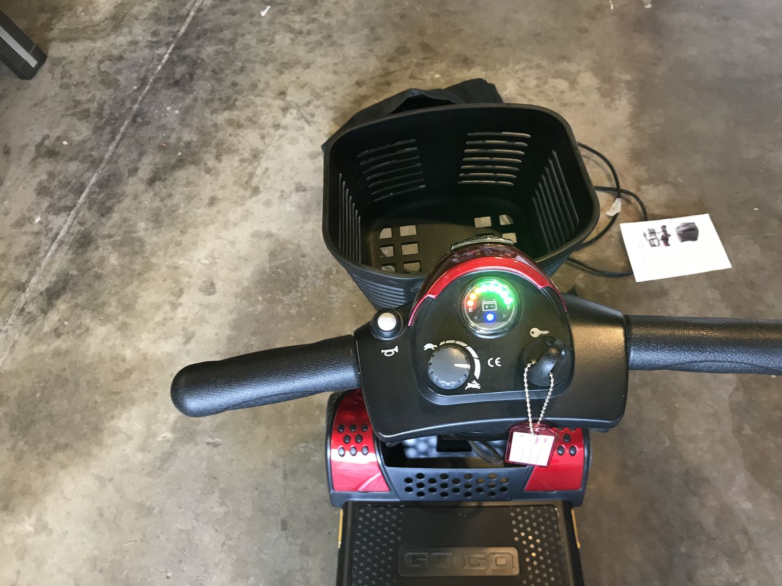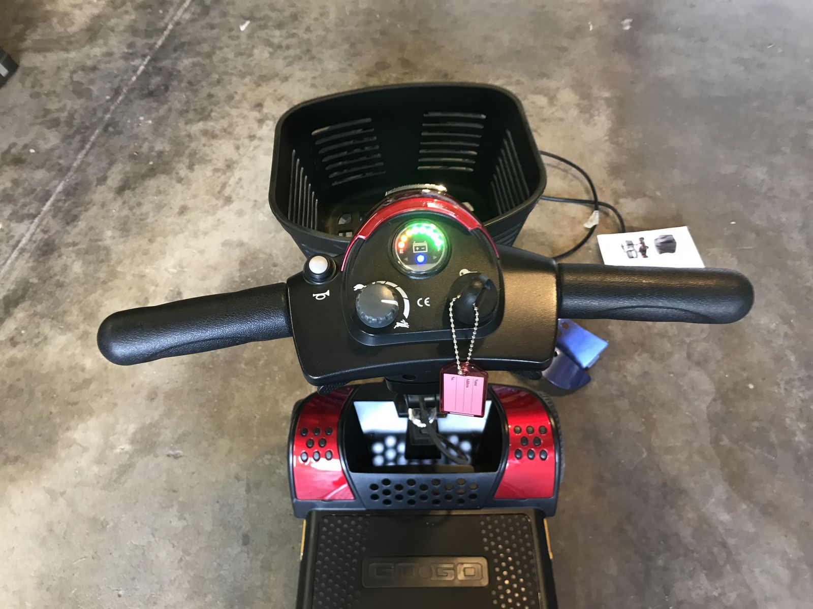 Pride GoGo Elite mobility scooter, this scooter is in brand new condition it comes with a battery charger snap on replacement parts to change scooter from red to blue and dust cover this scooter has barely been used works great and also runs great.