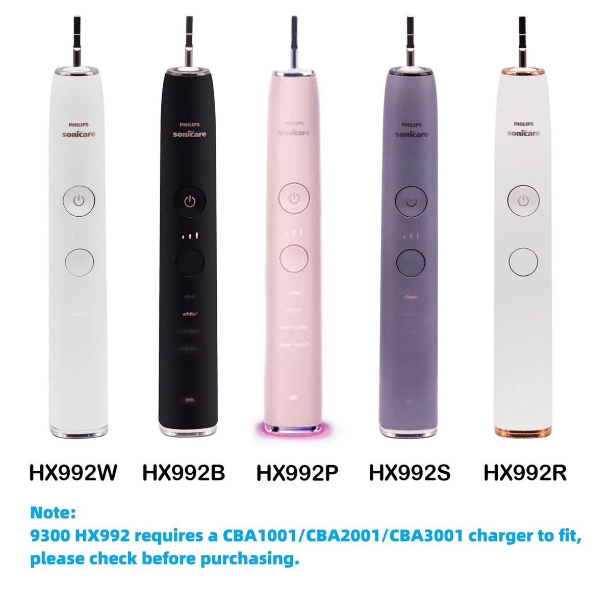 We have two of these Philips HX992 Sonicare DiamondClean Single Electric Toothbrushes #103798 available. These toothbrushes have been lightly used and come out of boxes along with handle, glass cup, and charging pad. May not include head. We have inspected and tested each unit to make sure that it is in good working condition. These come in various colors, colors available depend on what we have in stock at the time.