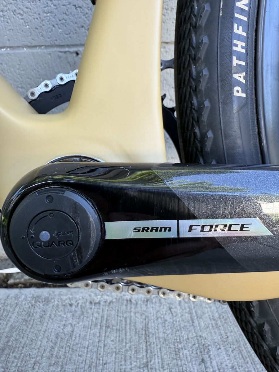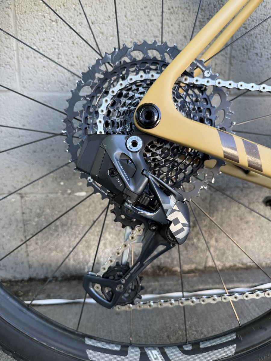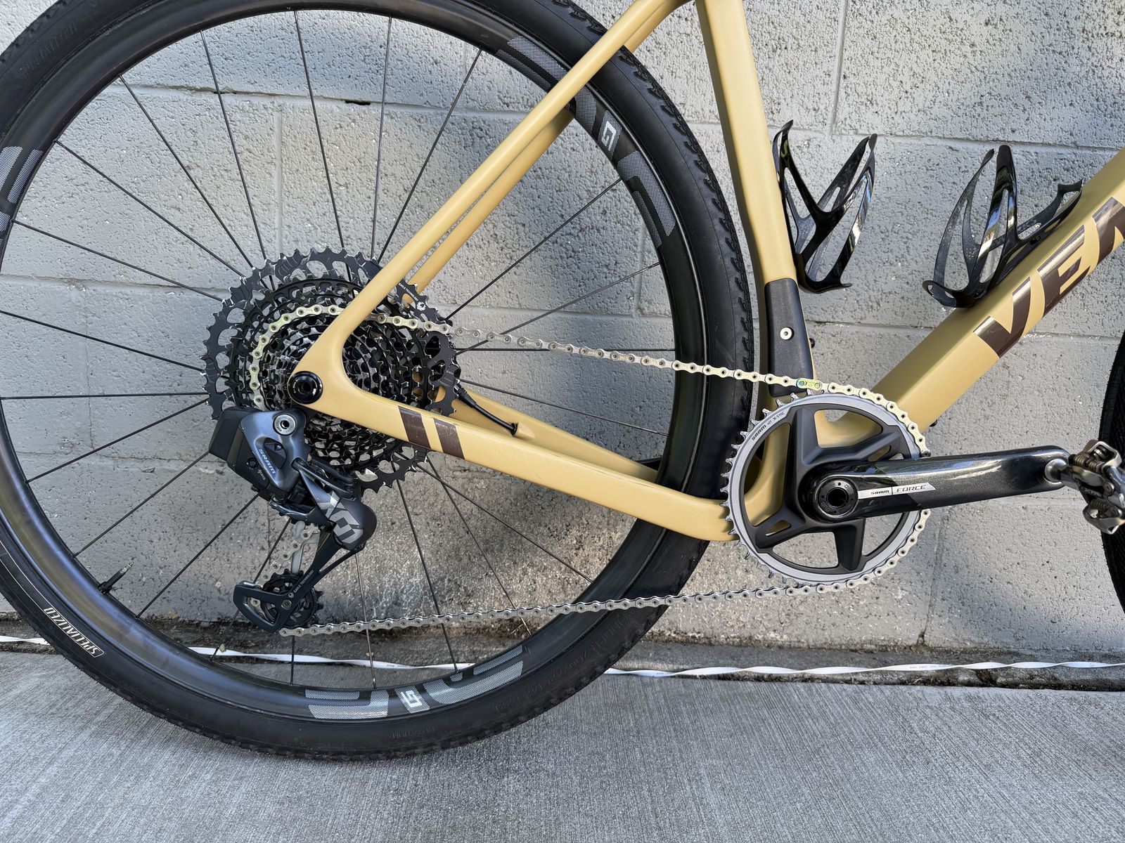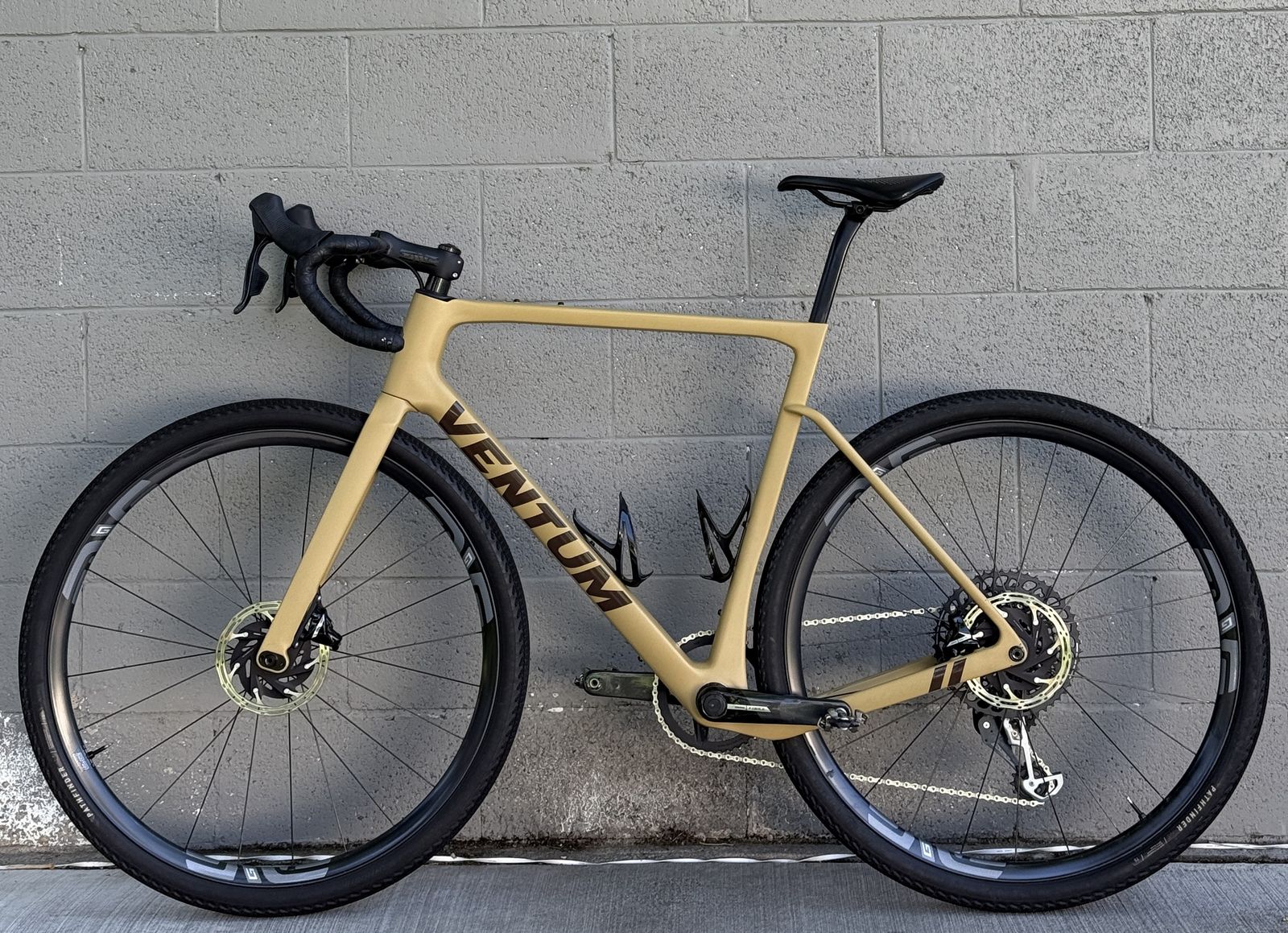 Frame set: Ventum GS1 in Terra color Wheels: ENVE G23 XDR Stem: ENVE stem 100mm Bar: SES AR Road Handlebars 42cm Cassette: SRAM Xg-1295 12-speed 10-52 black Chain: SRAM Pc X01 Eagle 12 speed Silver Crankset (front crank): SRAM Force 172-175mm crank (wide) 42t Rear Derailleur: SRAM X01 Eagle Axs rear derailleur 125p Lunar Brake Levers & Calipers: SRAM Force AXS HRD eTap Shift/Brake Lever and Hydraulic Disc Brake Caliper Chainring direct mount: SRAM Red/Force Axs X-sync Direct Mount 42T Grey Etap Battery: Sram Axs and E-tap battery Bottom Bracket: BB Sram Dub English Threaded BSA 73mm Computer Mount: K edge ENVE integrated mount Tape: Supercaz Super Sticky Cush Sealant: Orange Seal Brake rotors: 160mm SRAM XR centerlock disc brakes Tires: Pathfinder Pro 2Bliss size 42s