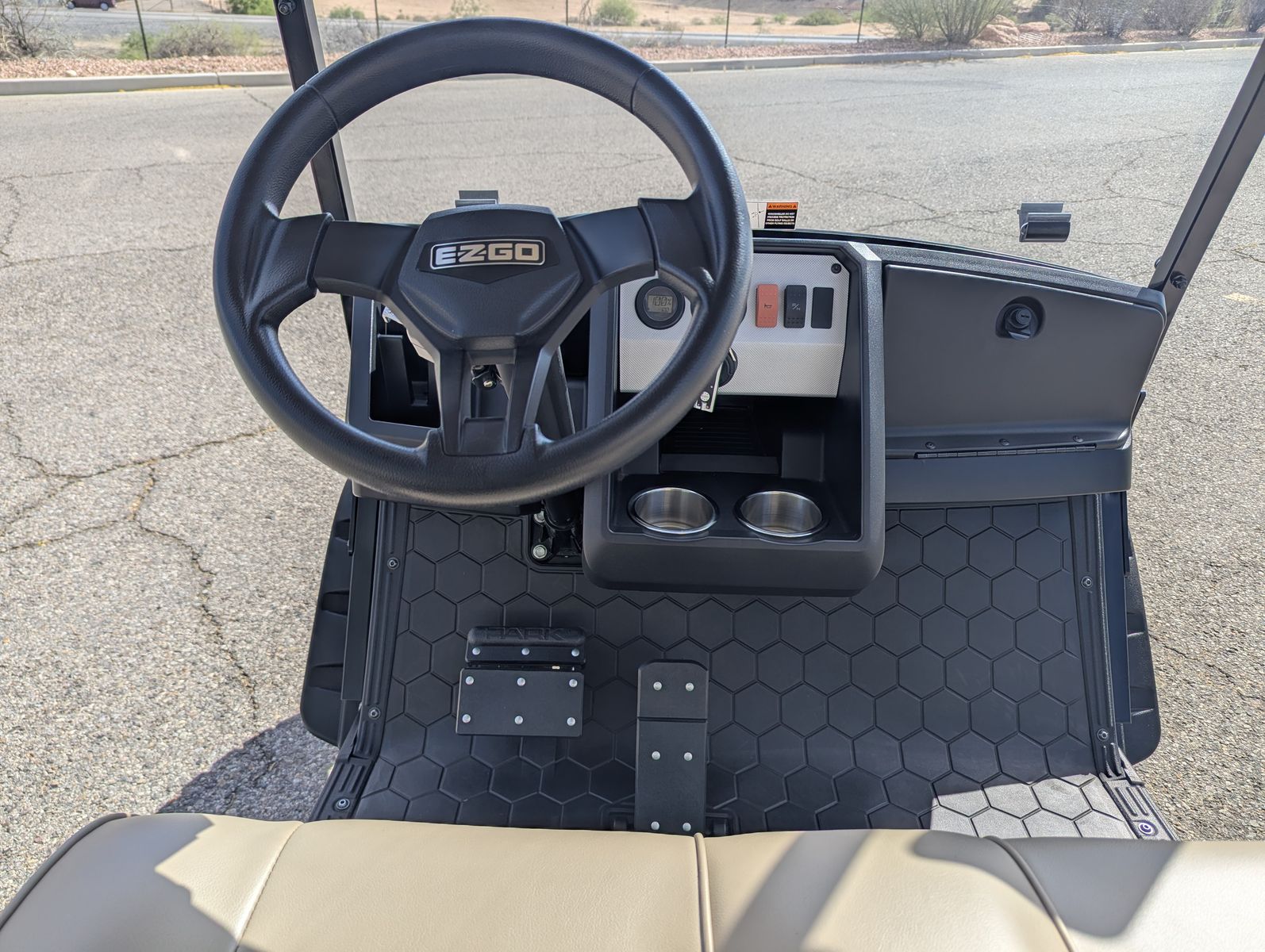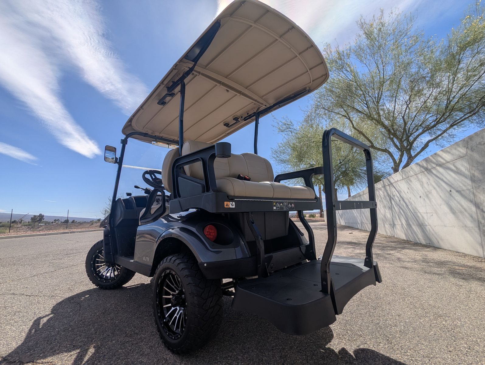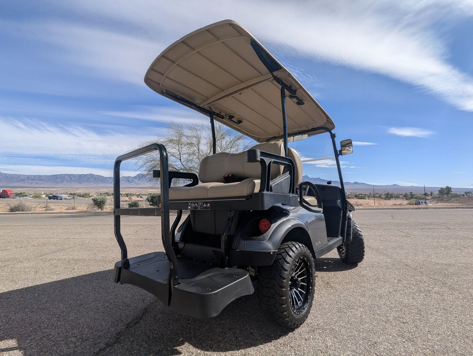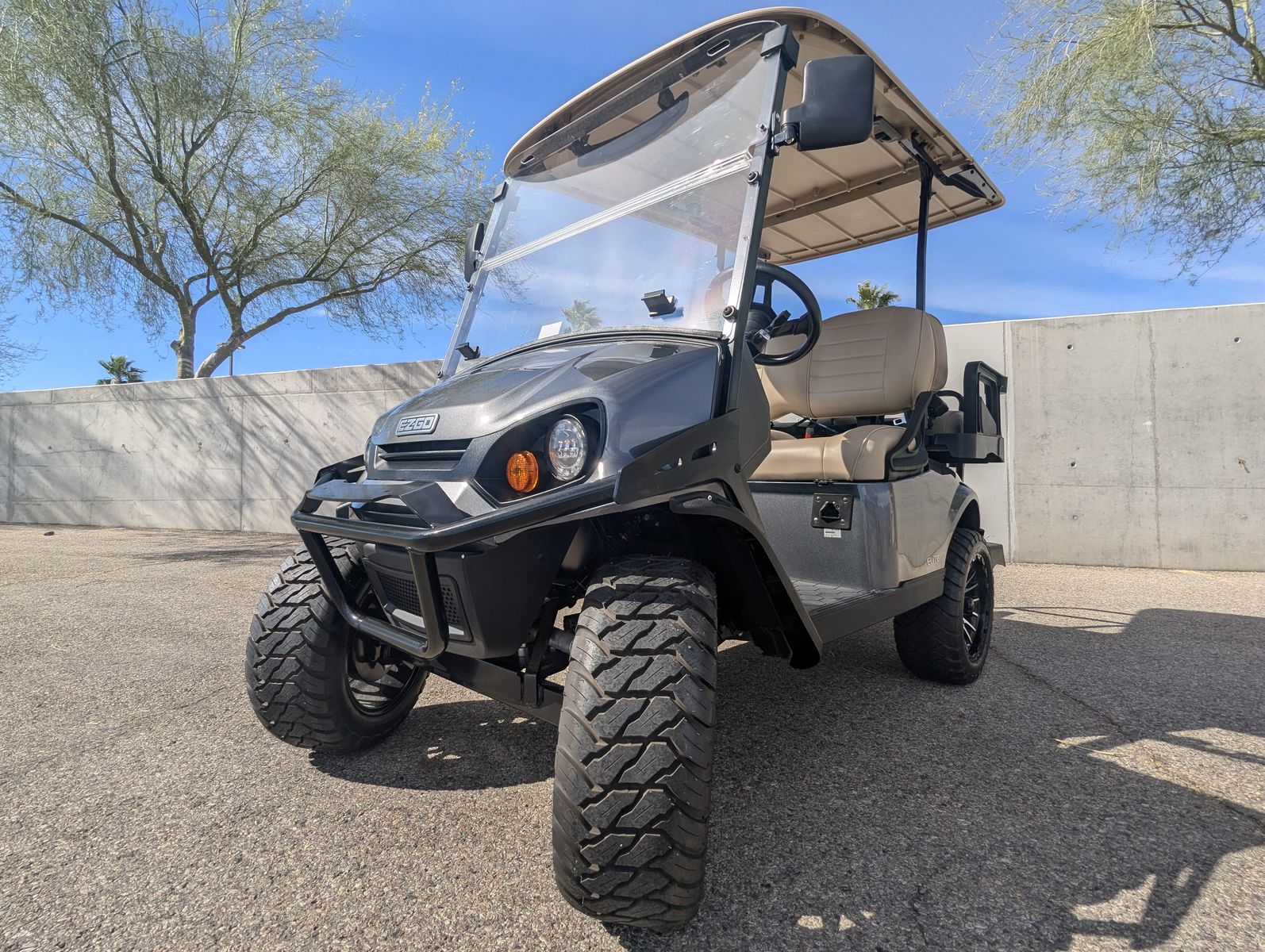 The E-Z-GO Express S4 is a premium 4-passenger lifted golf cart designed for neighborhood cruising and light utility, featuring a 120Ah Samsung lithium battery, modern LED headlights, 14-inch wheels, a rear flip seat, and a premium dash with a lockable glove box and cupholders.