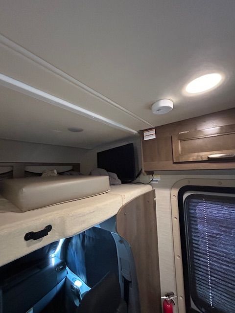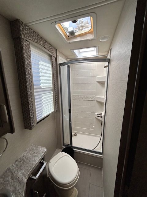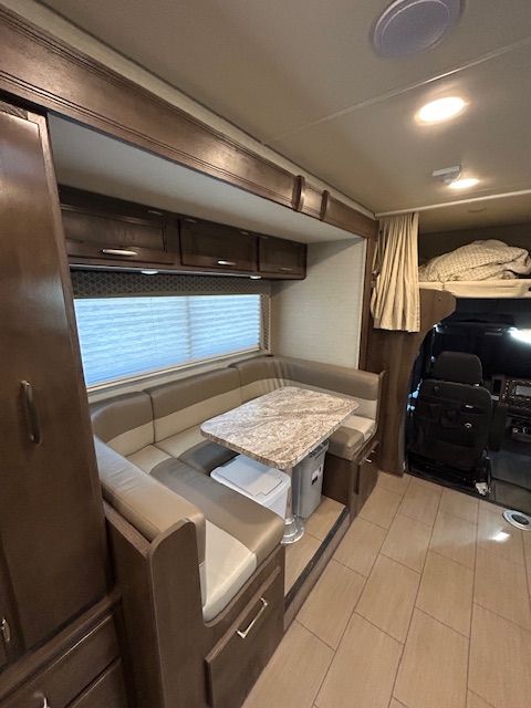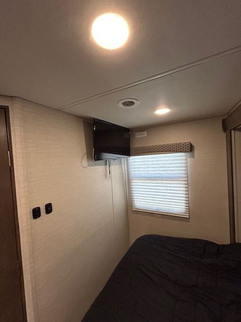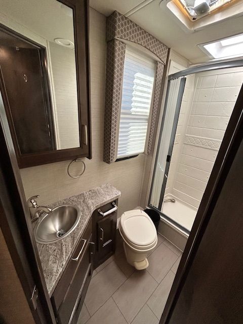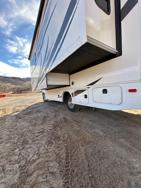 REAR QUEEN BED AND BUNK OVER CAB. U-SHAPED DINETT. REAR CORNER BATH. ROOF AC. ROOF MOUNTED SOLAR POWER, & 2 TV'S. ALSO FEATURES OUTDOOR LIGHTING AND SPEAKERS.