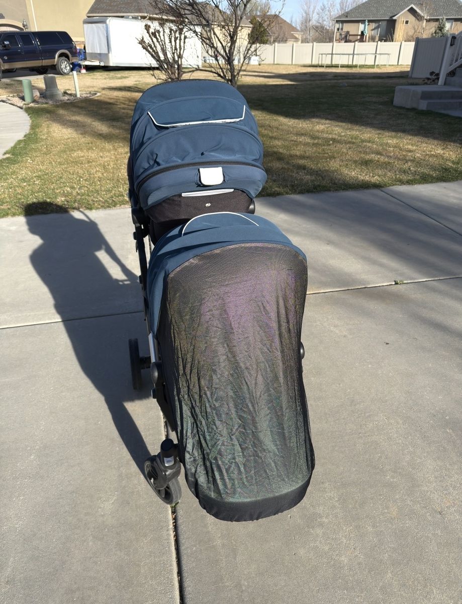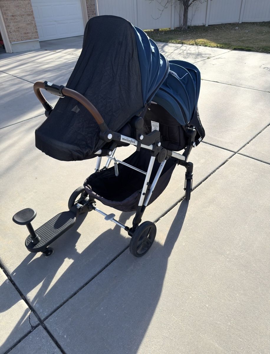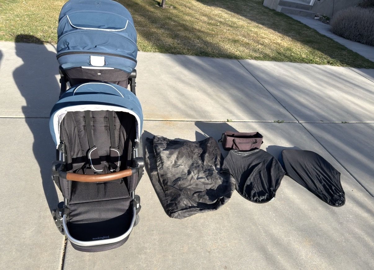 ApplePaySelling our Mockingbird single to double 2.0 that has a riding board. This is a solid stroller and very well built. Ours comes with the 2 seats, and infant inserts for your little ones. It also comes with the sunshades for the seats, the parent organizer for storage of snack and phones and such, a storage bag, and of course the riding board. This is their “Sea” color which is a very nice blue. Asking $250