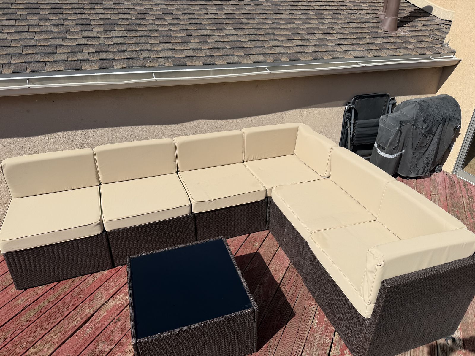 Zelle7 piece outdoor set with table. Comes with a cover. You can position each chair as you like.